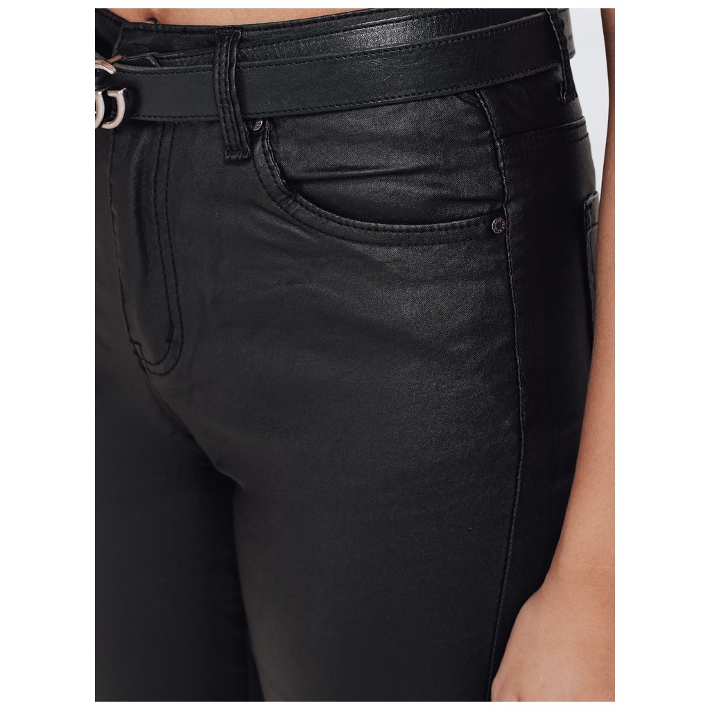Tento priliehavý strih s voskovaným efektom lichotí siluete a dodáva moderný nádych. Materiál s prídavkom elastanu zvyšuje pohodlie a umožňuje voľnosť pohybu. Vysoký pás zdôrazňuje pás a klasické usporiadanie vreciek dodáva praktickosť.