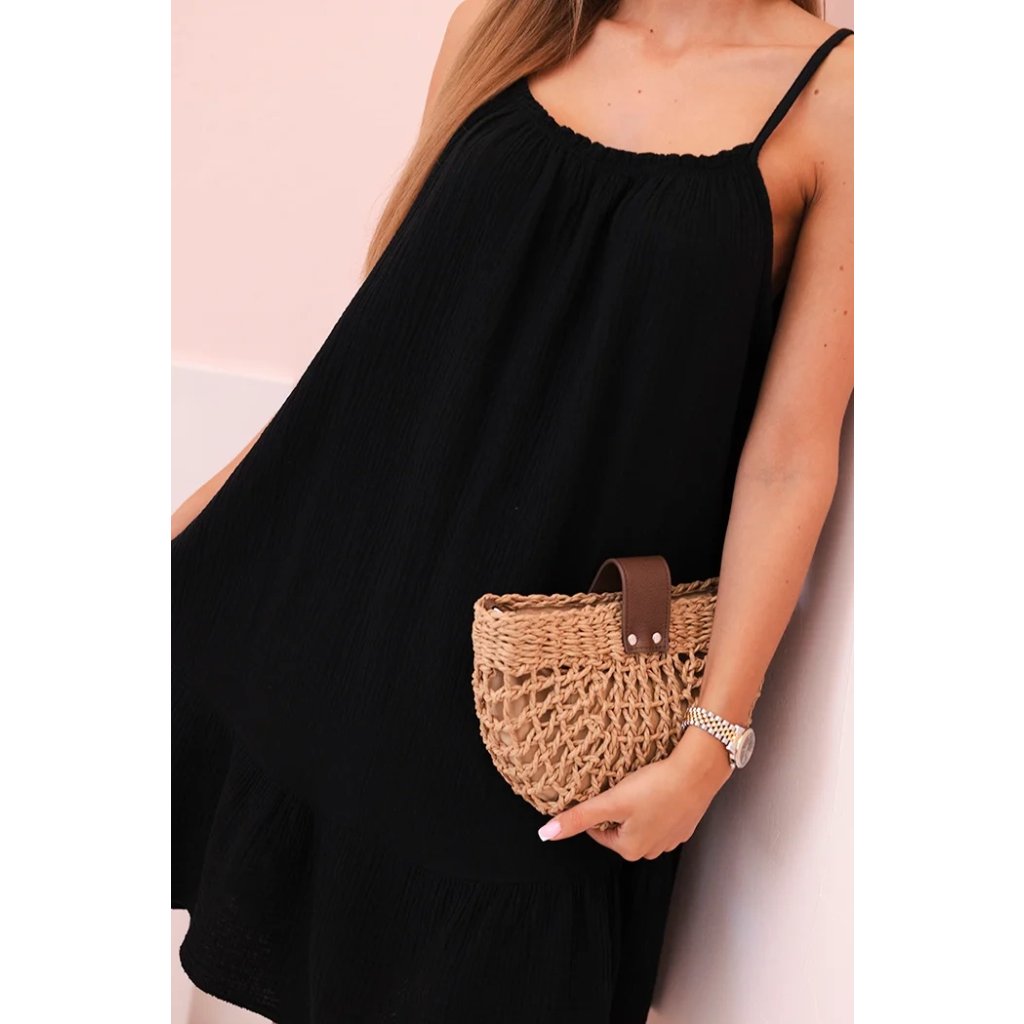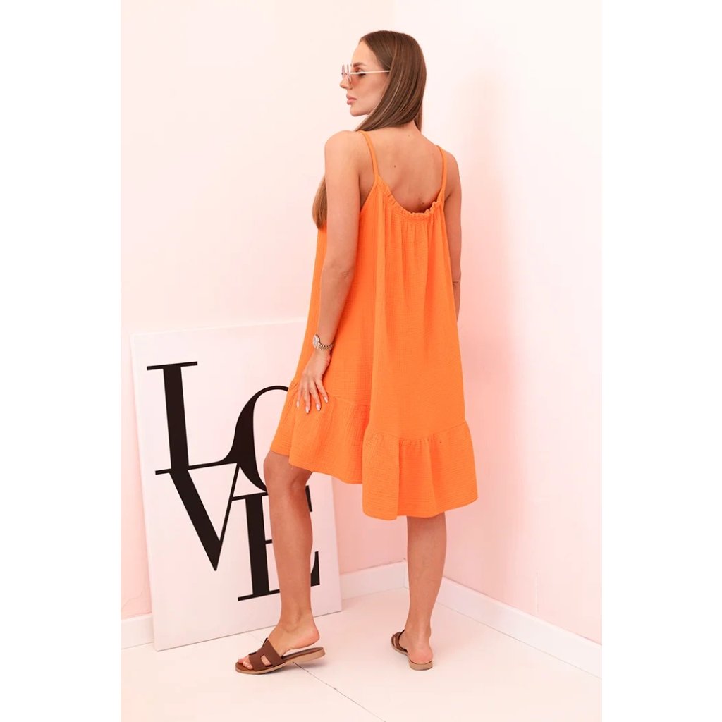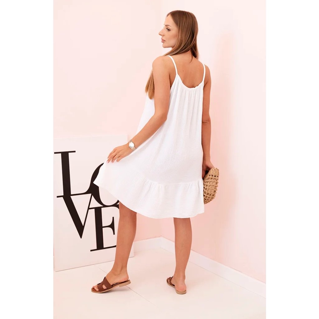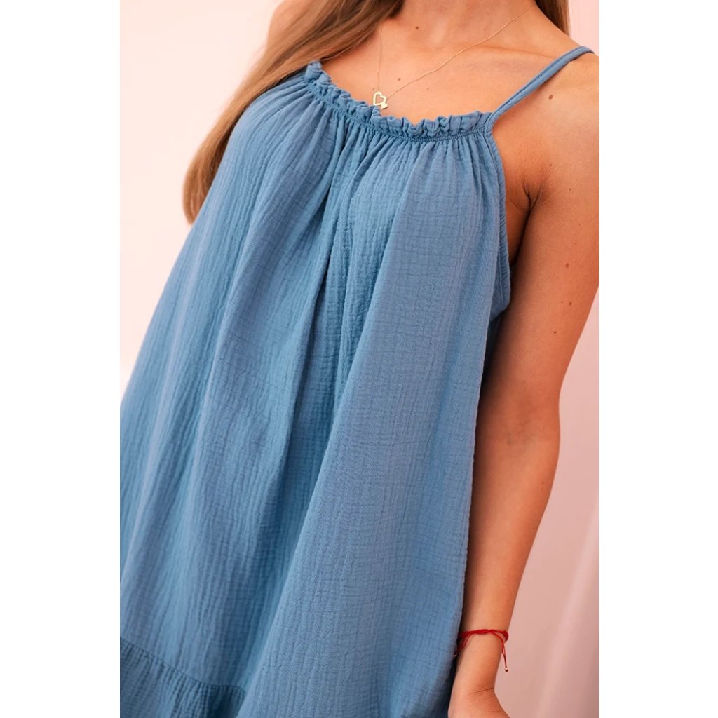 Ľahké a vzdušné dámske mušelínové šaty bez ramienok s volánom sú ideálnou voľbou na teplé letné dni. Sú vyrobené zo 100 % prírodnej bavlny, potešia svojou jemnosťou a hebkosťou na dotyk a poskytujú maximálne pohodlie pri nosení. Voľný strih s rozšíreným lemom zakončeným volánom krásne sedí na postave, maskuje drobné nedokonalosti a poskytuje úplnú voľnosť pohybu. Tento model je ideálny na prechádzku po pláži alebo letné stretnutie s priateľmi. Elastický výstrih jemne zvýrazňuje ramená a tenké ramienka dodávajú celému oblečeniu ľahkosť a ženský šarm. Vďaka svojej univerzálnosti ho môžete ľahko kombinovať so sandálmi, klobúkom alebo boho kabelkou.