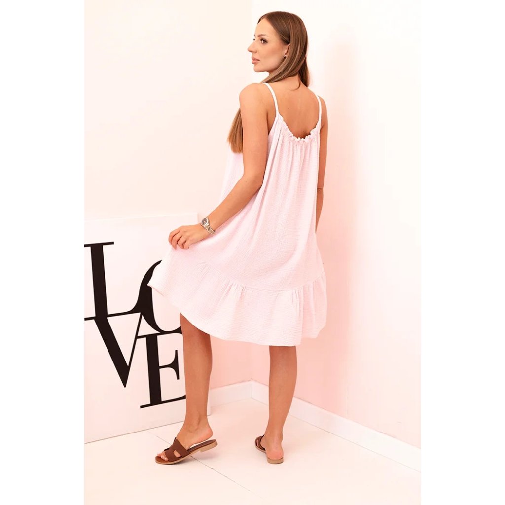 Ľahké a vzdušné dámske mušelínové šaty bez ramienok s volánom sú ideálnou voľbou na teplé letné dni. Sú vyrobené zo 100 % prírodnej bavlny, potešia svojou jemnosťou a hebkosťou na dotyk a poskytujú maximálne pohodlie pri nosení. Voľný strih s rozšíreným lemom zakončeným volánom krásne sedí na postave, maskuje drobné nedokonalosti a poskytuje úplnú voľnosť pohybu. Tento model je ideálny na prechádzku po pláži alebo letné stretnutie s priateľmi. Elastický výstrih jemne zvýrazňuje ramená a tenké ramienka dodávajú celému oblečeniu ľahkosť a ženský šarm. Vďaka svojej univerzálnosti ho môžete ľahko kombinovať so sandálmi, klobúkom alebo boho kabelkou.