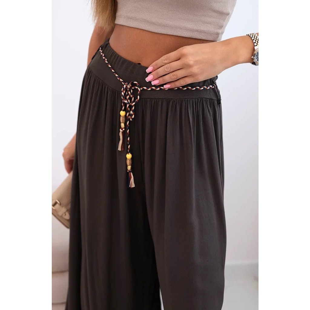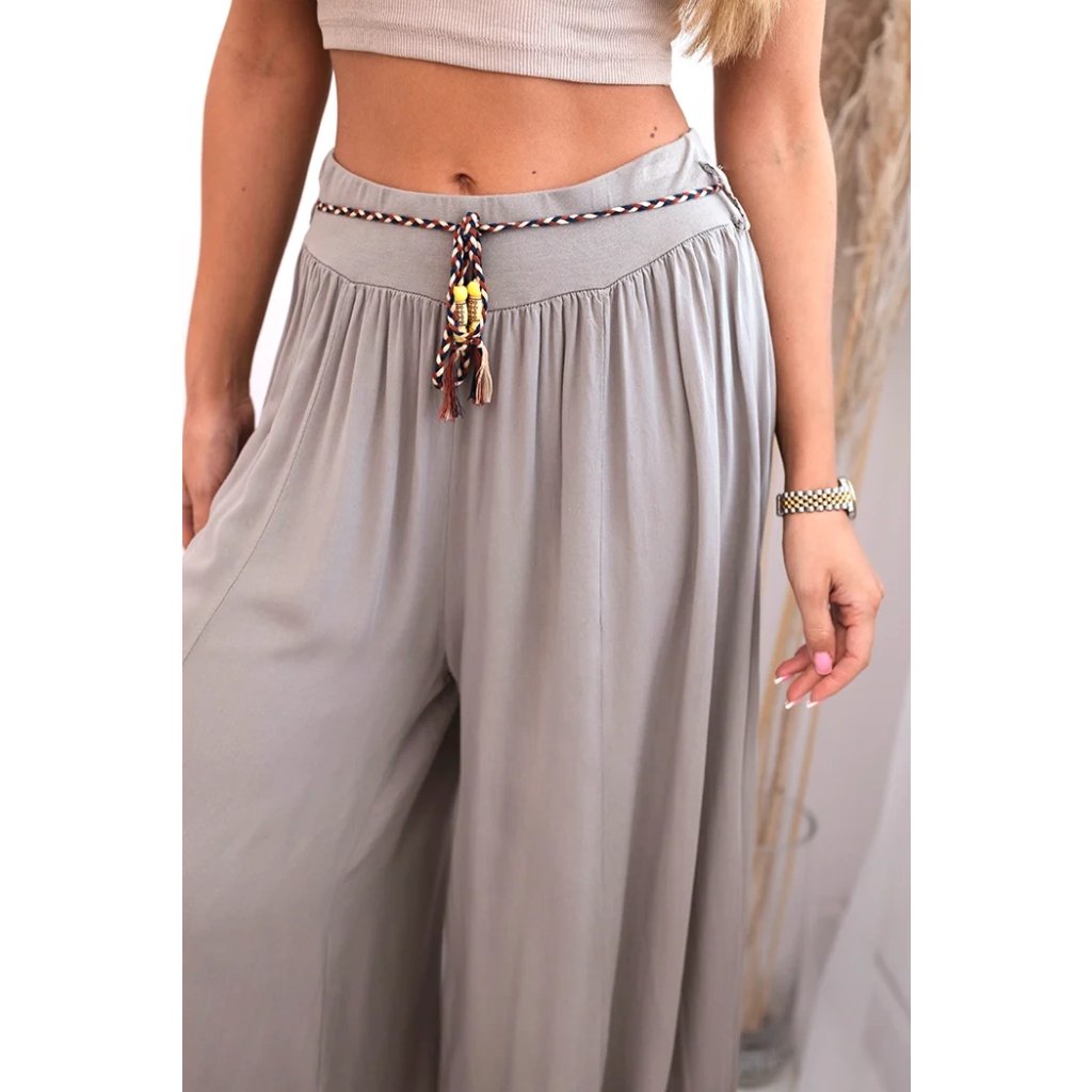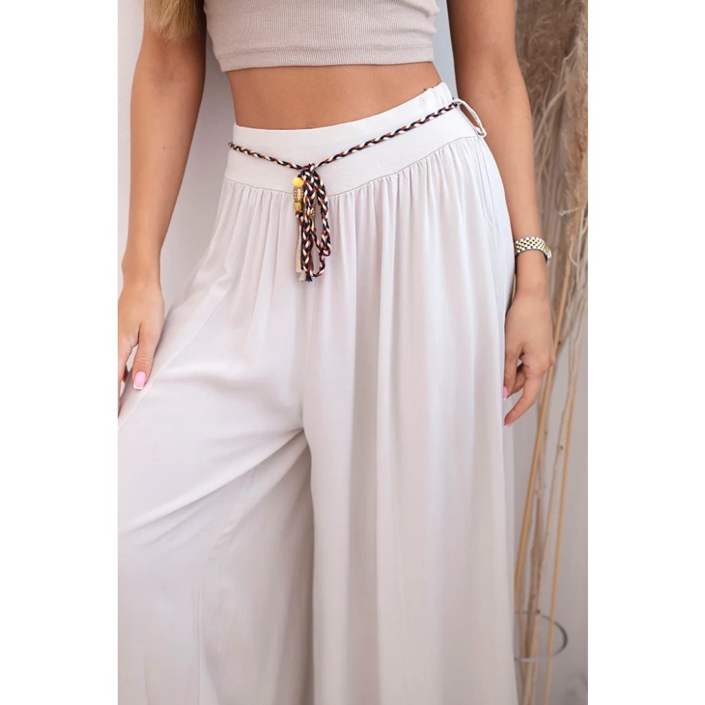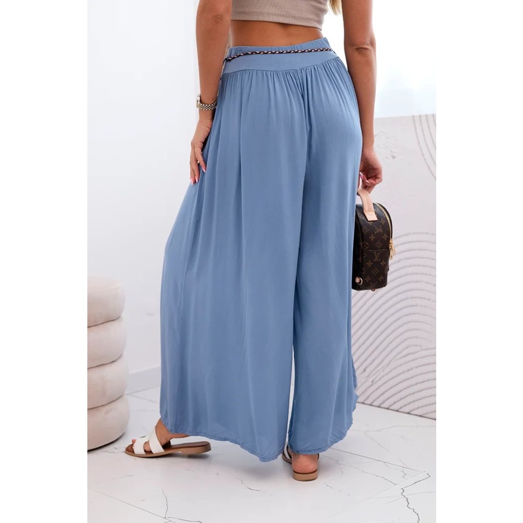 Tieto výnimočné dámske široké nohavice z viskózy sú skvelou voľbou pre ženy, ktoré si cenia pohodlie a štýl. Ušité z ľahkej, priedušnej látky krásne sedia na postave a zaisťujú pohodlie počas celého dňa. Široké nohavice im dodávajú módny, letný charakter a priložený pletený opasok pridáva originálny šarm a zdôrazňuje pás.