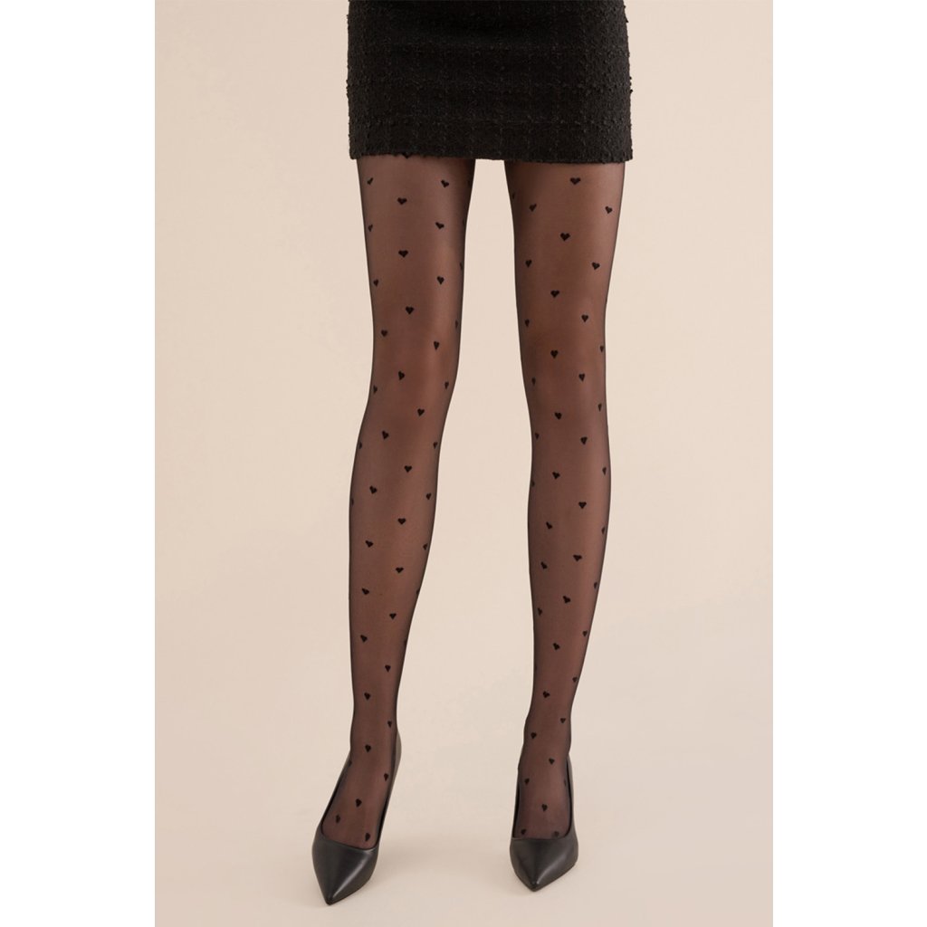 Exkluzívne módne pančuchové nohavice s očarujúcimi srdiečkami, vyrobené z lycrového vlákna dvakrát opleteného polyamidovým hodvábom. Model bez samostatnej nohavičkovej časti, s bavlneným klinom, šitý plochým švom. - Hrúbka 20 DEN. Zloženie: 85 % polyamid, 15 % elastan.