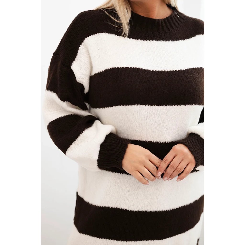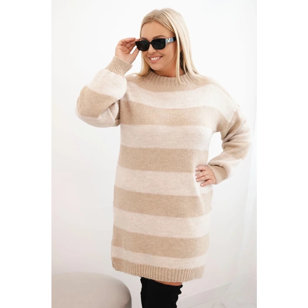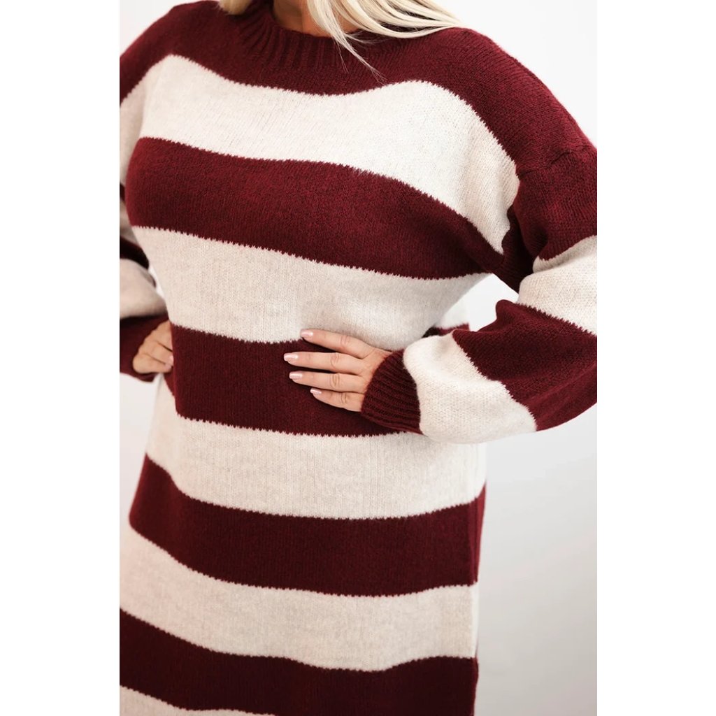 Hľadáte ideálne šaty na chladnejšie dni? Dámske svetrové šaty v pruhoch sú must-have vo vašom šatníku! Model s voľným strihom je vyrobený z mäkkej pleteniny, ktorá obklopuje telo a zaisťuje maximálne pohodlie pri nosení. Dlhé rukávy a dĺžka pod kolená z nej robia dokonalý kúsok na jeseň a zimu – ako do práce, na schôdzky, tak aj na bežné nosenie.