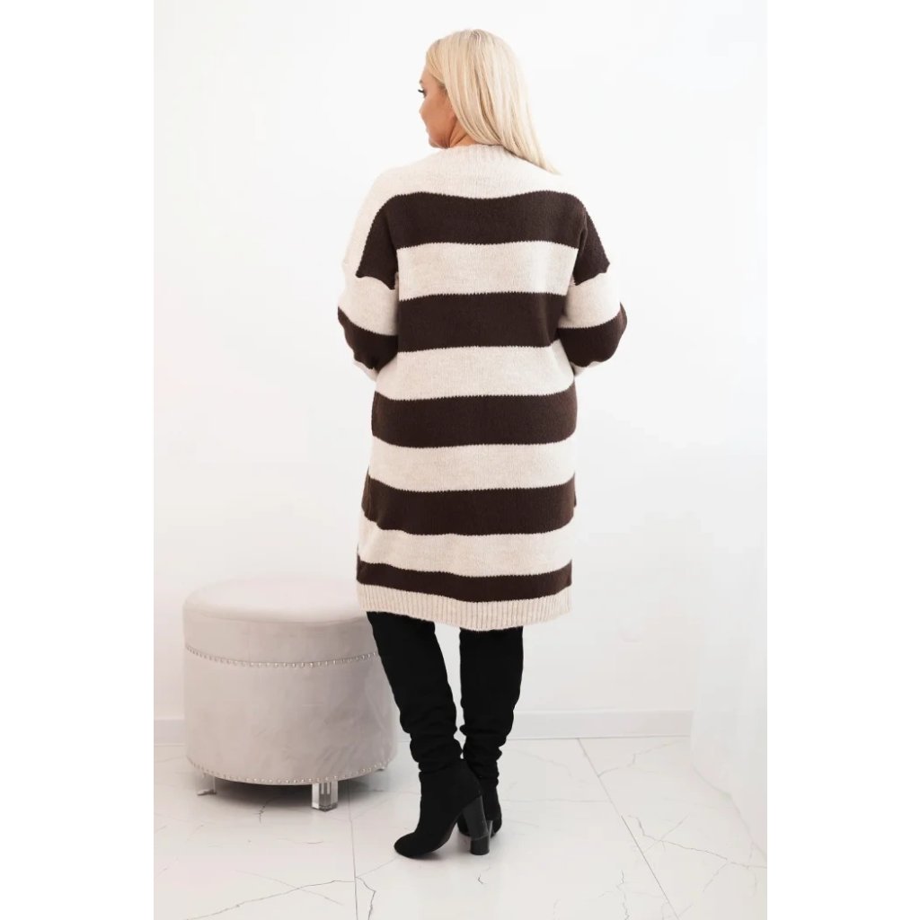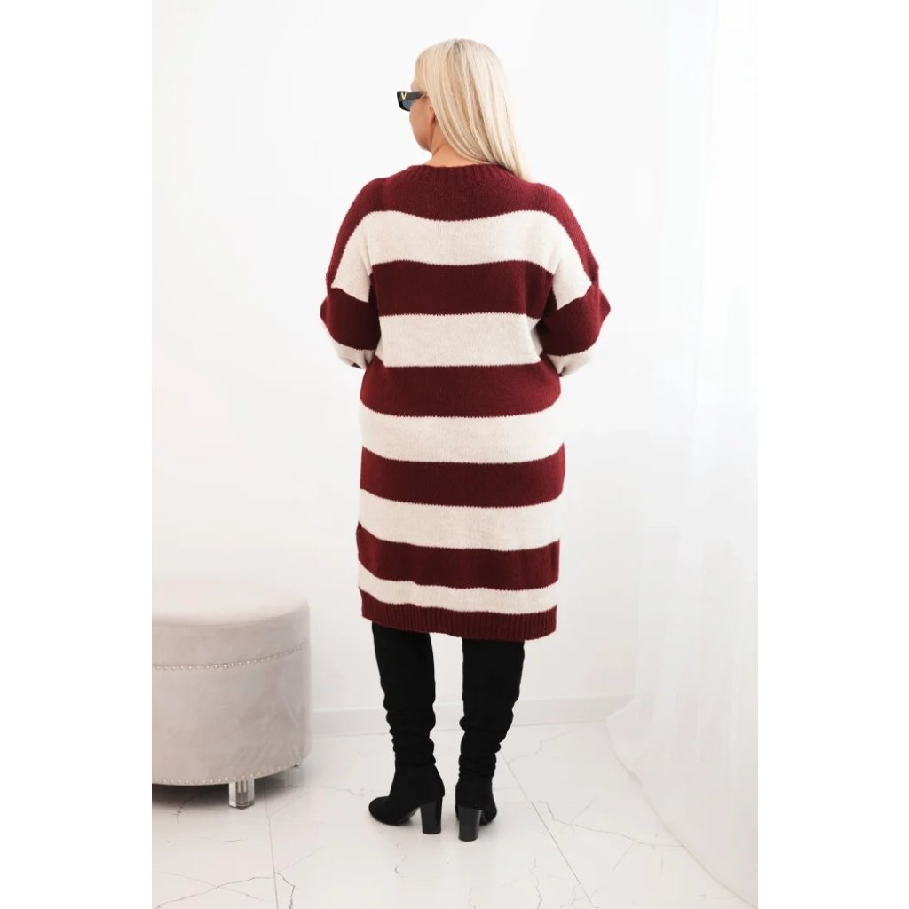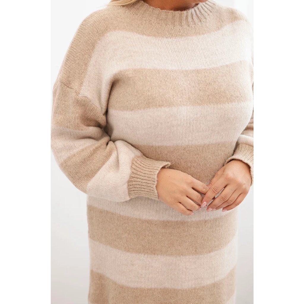 Hľadáte ideálne šaty na chladnejšie dni? Dámske svetrové šaty v pruhoch sú must-have vo vašom šatníku! Model s voľným strihom je vyrobený z mäkkej pleteniny, ktorá obklopuje telo a zaisťuje maximálne pohodlie pri nosení. Dlhé rukávy a dĺžka pod kolená z nej robia dokonalý kúsok na jeseň a zimu – ako do práce, na schôdzky, tak aj na bežné nosenie.