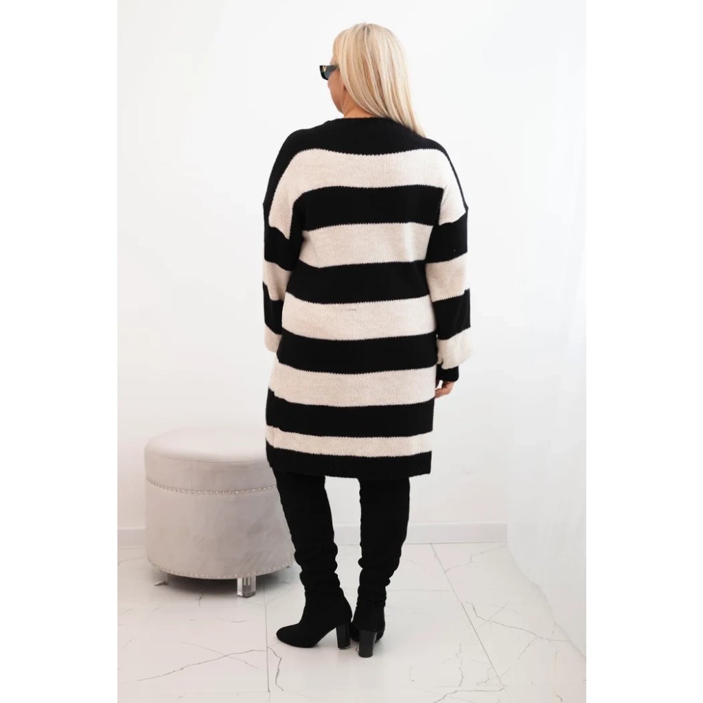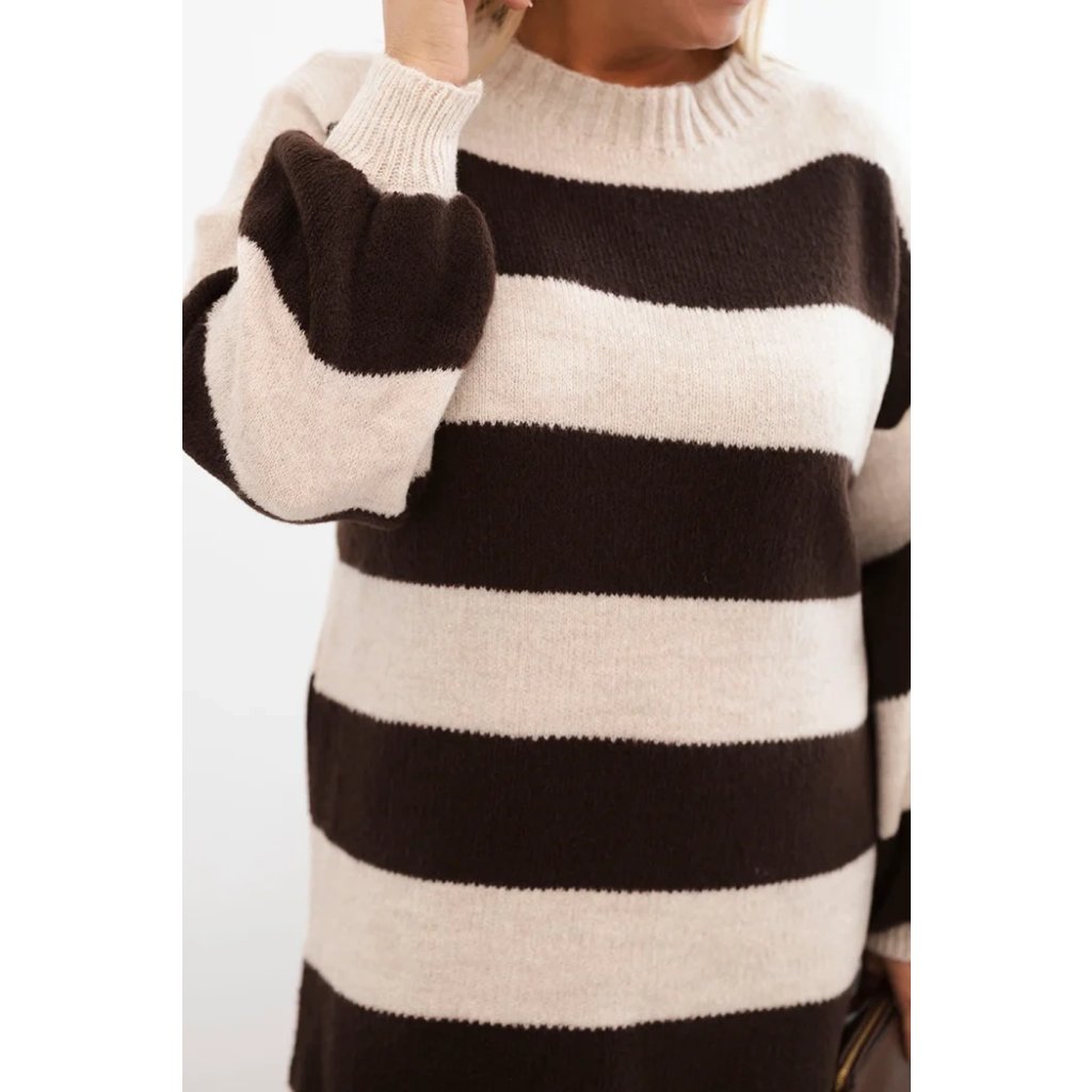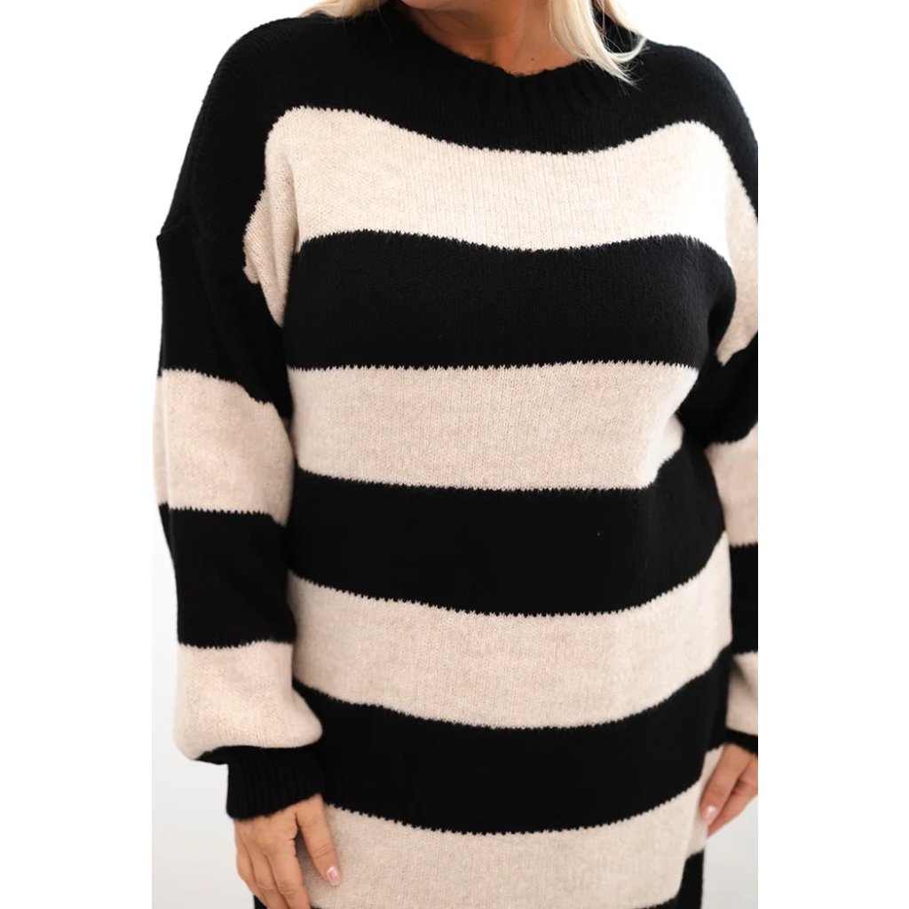 Výrazné horizontálne pruhy dodávajú štylizácii charakter a moderný vzhľad. Výstrih v klasickom štýle a znížená línia ramien podčiarkujú módny, oversized štýl. Svetrové šaty skvele vyzerajú ako s členkovými topánkami, tak s čižmami. Spojte ich s opaskom v páse, aby ste vytvorili ženský vzhľad.