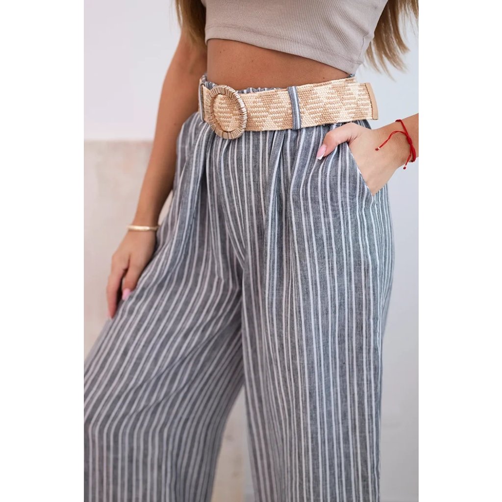 Tieto dámske nohavice s pruhmi a širokými nohavicami sú ideálnou voľbou na jarné a letné dni. Sú vyrobené z ľahkej a priedušnej zmesi materiálov, ktorá zaisťuje pohodlie pri nosení a voľnosť pohybu po celý deň. Súčasťou je ozdobný opasok s okrúhlou sponou, ktorý krásne zvýrazňuje pás a dodáva celému outfitu štýlový charakter. Voľný strih a elastický pás zaisťujú, že nohavice perfektne sedia na postave a módne zvislé pruhy opticky zoštíhľujú. Skvele sa hodia ako na každodenné nosenie, tak aj na dovolenku alebo stretnutie s priateľmi. Ležérny štýl s nádychom elegancie osloví každú ženu, ktorá si cení pohodlie a dobrý vzhľad. Veľkosť je univerzálna a hodí sa pre ženy veľkosti S, M alebo L.