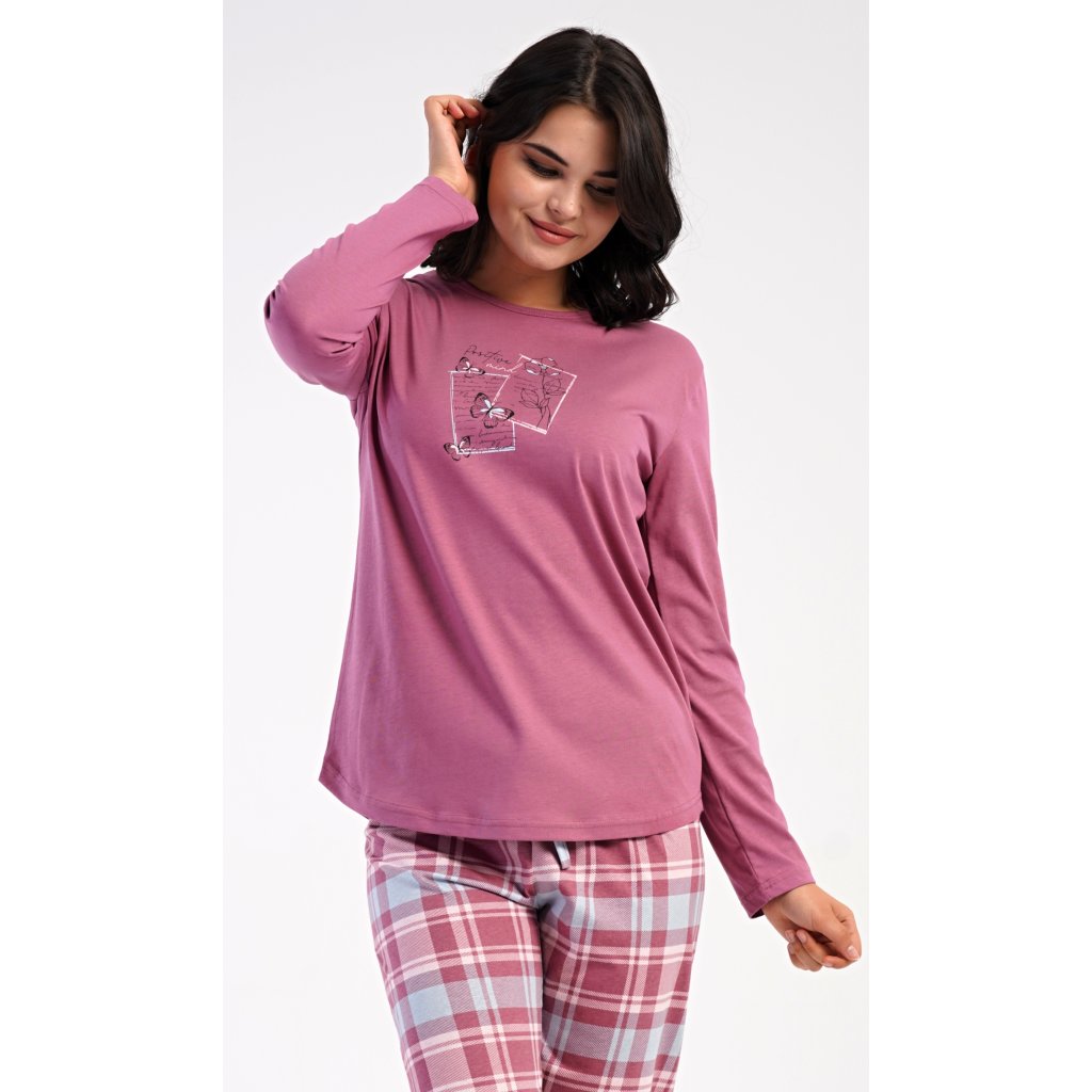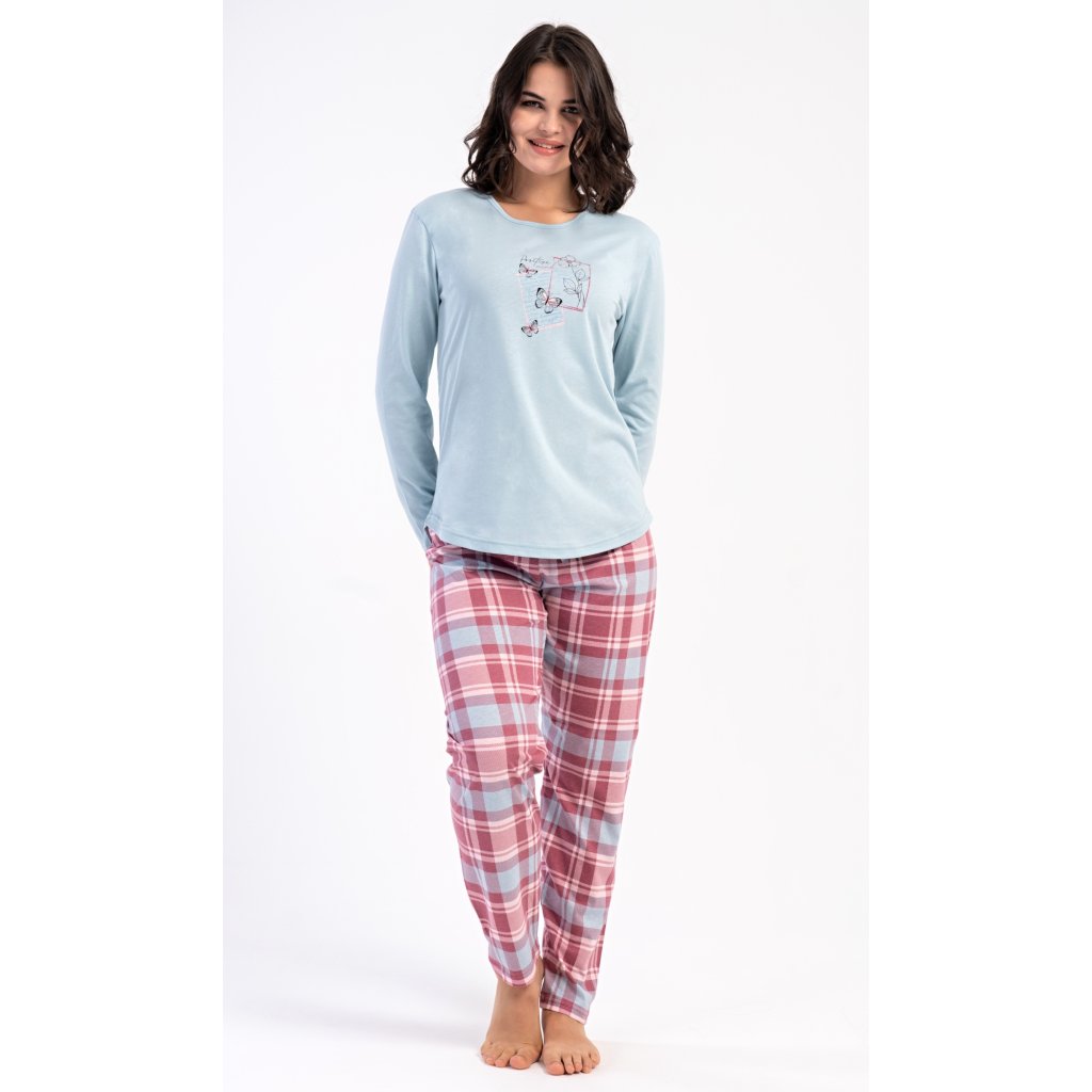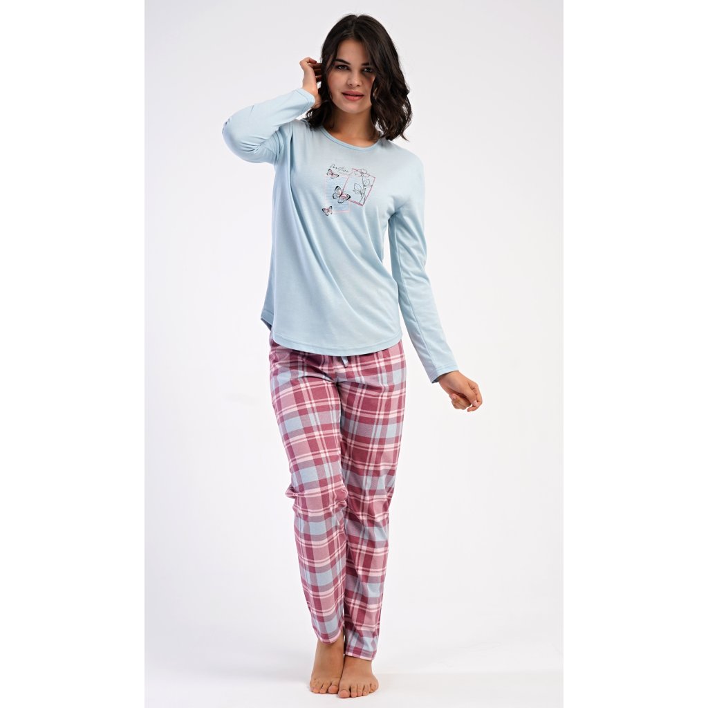 Dámske bavlnené dlhé pyžamo Charlotte. Dámske pyžamo pozostáva z košele s dlhými rukávmi a dlhých nohavíc. Jednofarebné tričko s okrúhlym výstrihom zdobia na hrudi motýliky. Kárované nohavice majú elastický pás a šnúrku na stiahnutie, bez vreciek. Použitý bavlnený materiál je pružný a príjemný na dotyk.