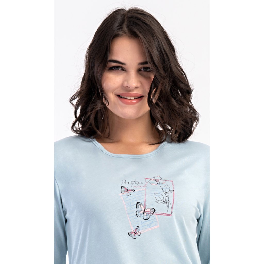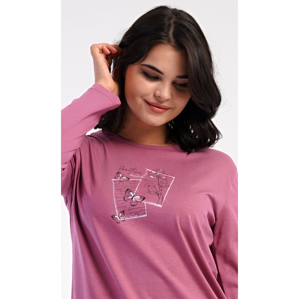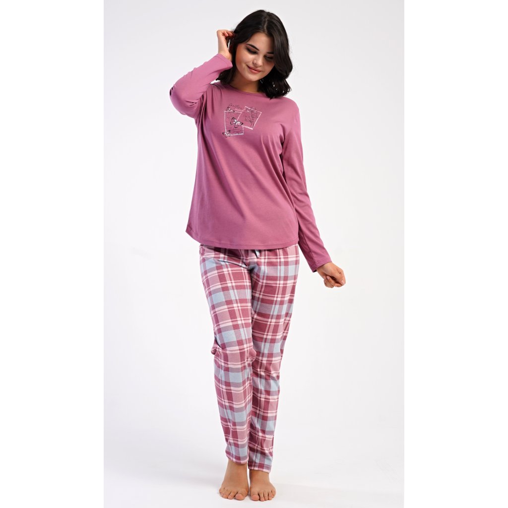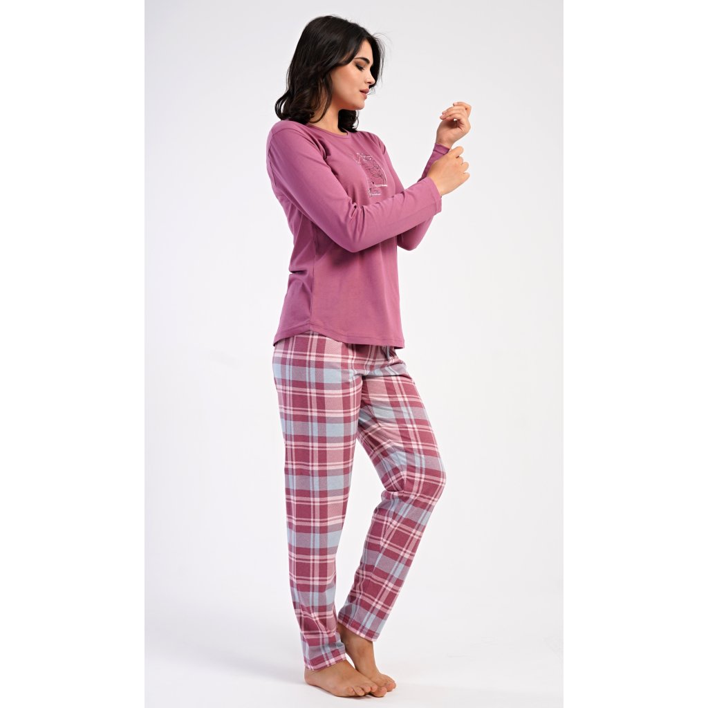 Dámske bavlnené dlhé pyžamo Charlotte. Dámske pyžamo pozostáva z košele s dlhými rukávmi a dlhých nohavíc. Jednofarebné tričko s okrúhlym výstrihom zdobia na hrudi motýliky. Kárované nohavice majú elastický pás a šnúrku na stiahnutie, bez vreciek. Použitý bavlnený materiál je pružný a príjemný na dotyk.