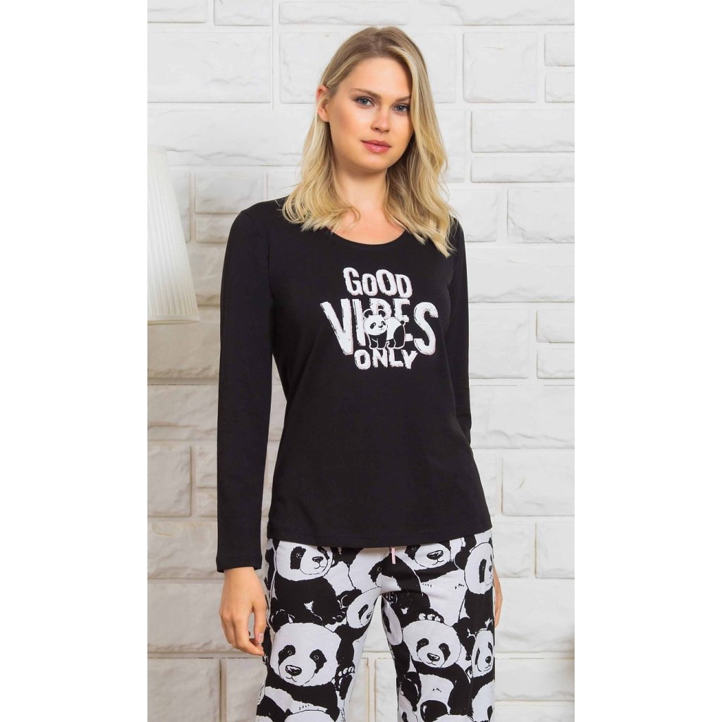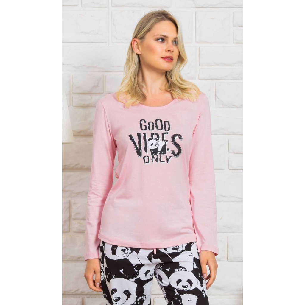 Dámske dlhé bavlnené pyžamo Good vibes. Pyžamo pozostáva z košele s dlhými rukávmi a dlhých nohavíc. Na tričku je veľký nápis Good Vibes only, ktorý dopĺňa obrázok malej rozkošnej pandy. Motív pandy sa opakuje aj na nohaviciach, ktoré majú elastický pás a šnúrku na stiahnutie. Pyžamové nohavice nemajú vrecká. Použitý bavlnený materiál je príjemný a pružný na dotyk.