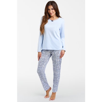 Dámske bavlnené dlhé pyžamo Macko na obláčiku. Dámske pyžamo pozostáva z košele s dlhými rukávmi a dlhých nohavíc. Jednofarebné tričko je ozdobené obrázkom medveďa na obláčiku. Tento motív sa opakuje aj na nohaviciach, ktoré majú elastický pás a šnúrku, ale nemajú vrecká. Použitý bavlnený materiál je pružný a príjemný na dotyk.