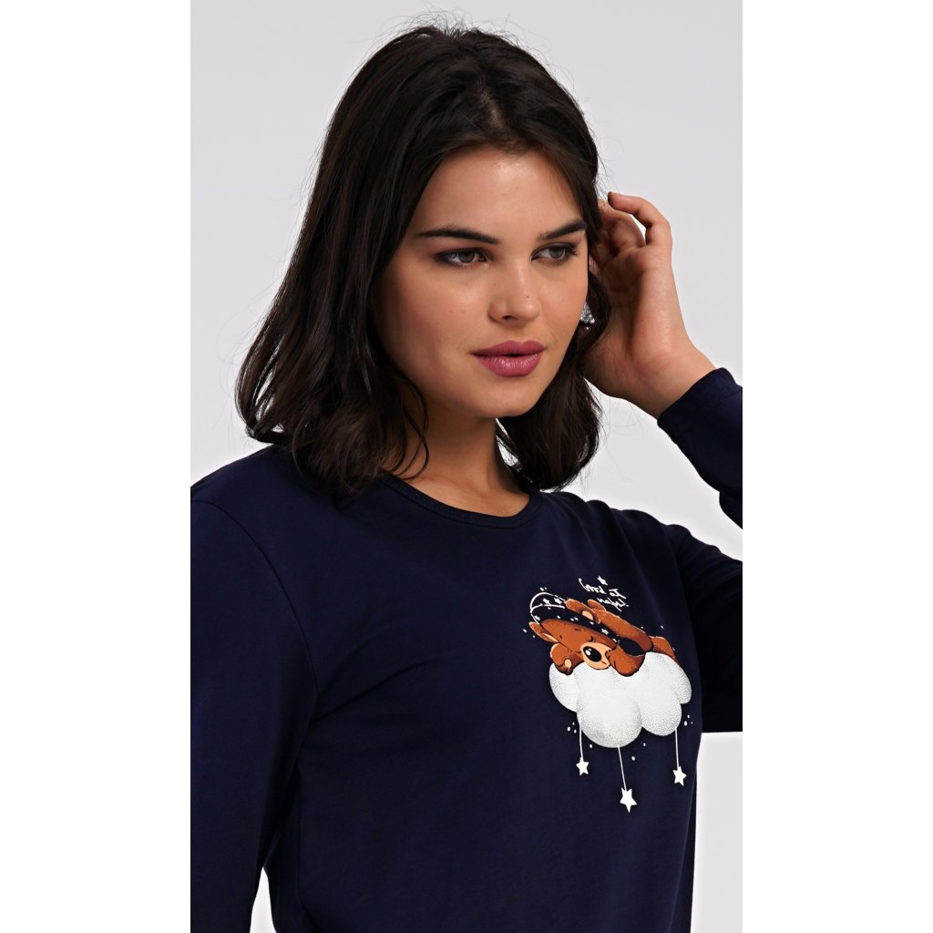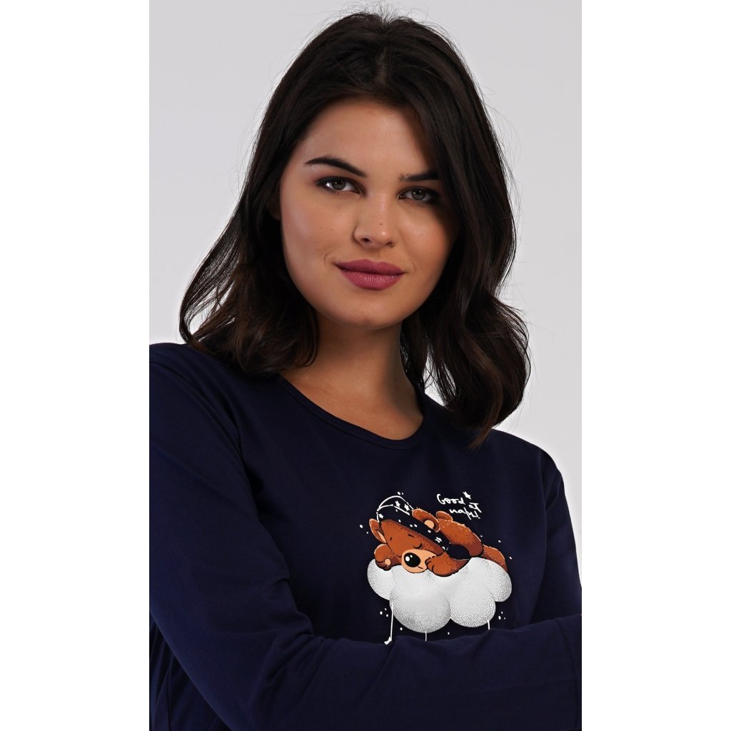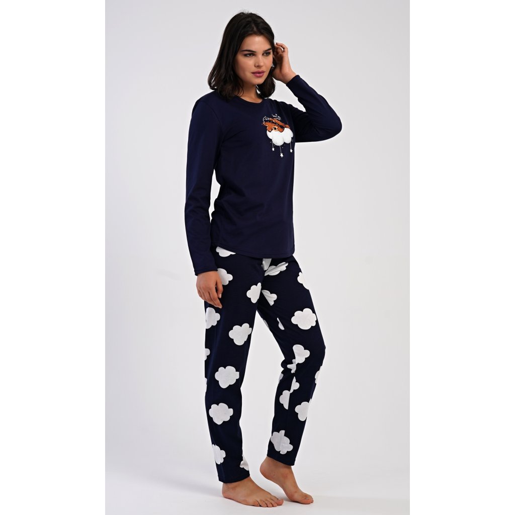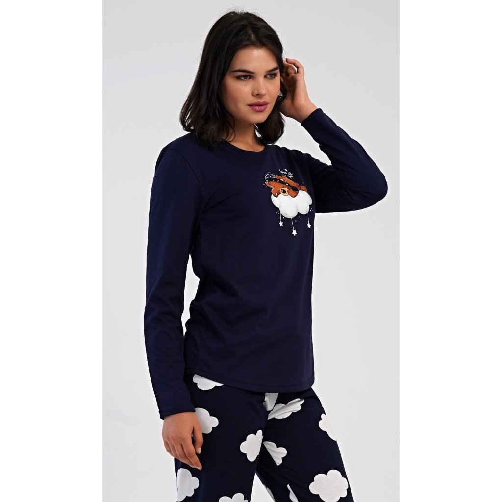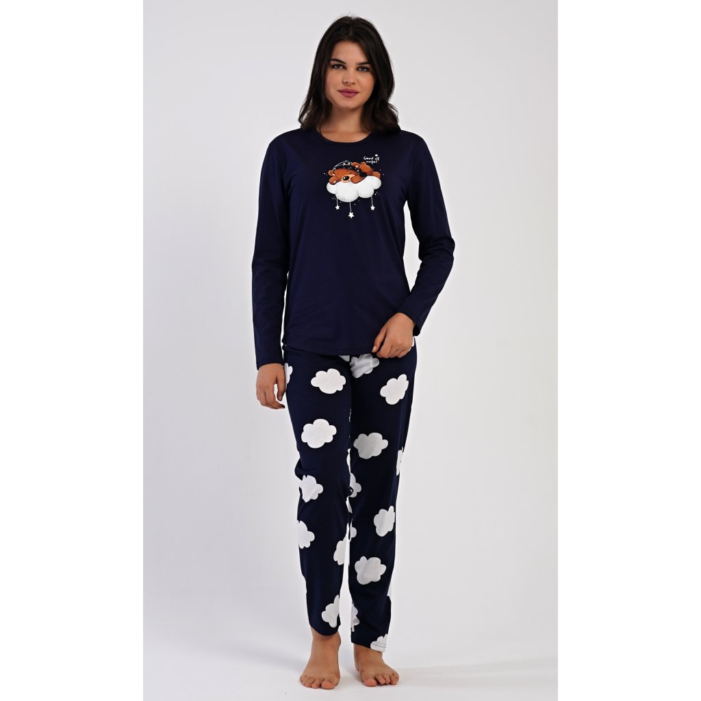 Dámske bavlnené dlhé pyžamo Macko na obláčiku. Dámske pyžamo pozostáva z košele s dlhými rukávmi a dlhých nohavíc. Jednofarebné tričko je ozdobené obrázkom medveďa na obláčiku. Tento motív sa opakuje aj na nohaviciach, ktoré majú elastický pás a šnúrku, ale nemajú vrecká. Použitý bavlnený materiál je pružný a príjemný na dotyk.