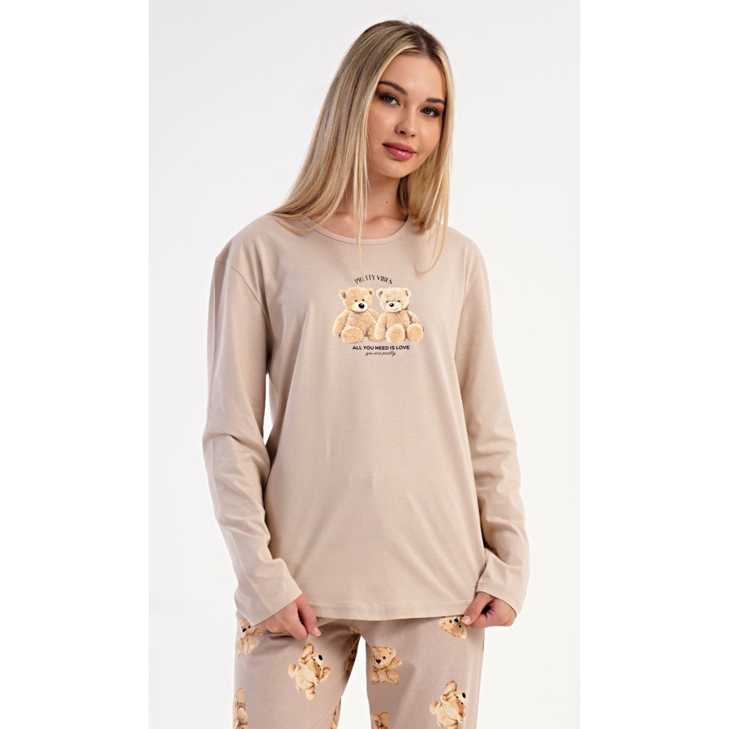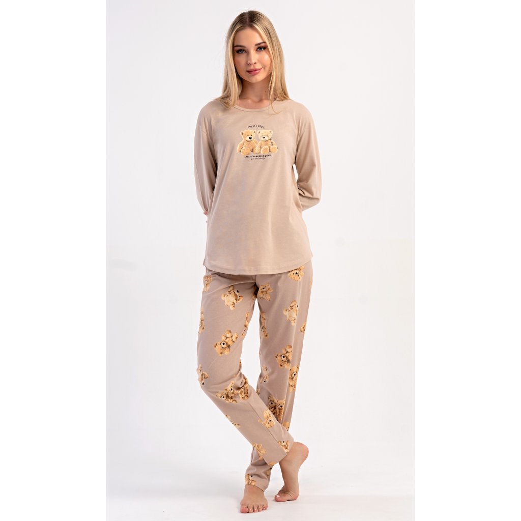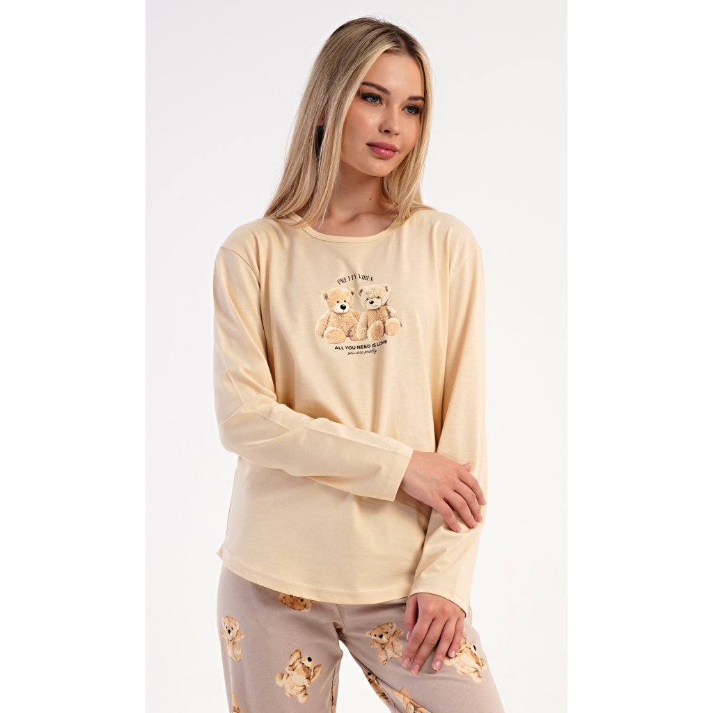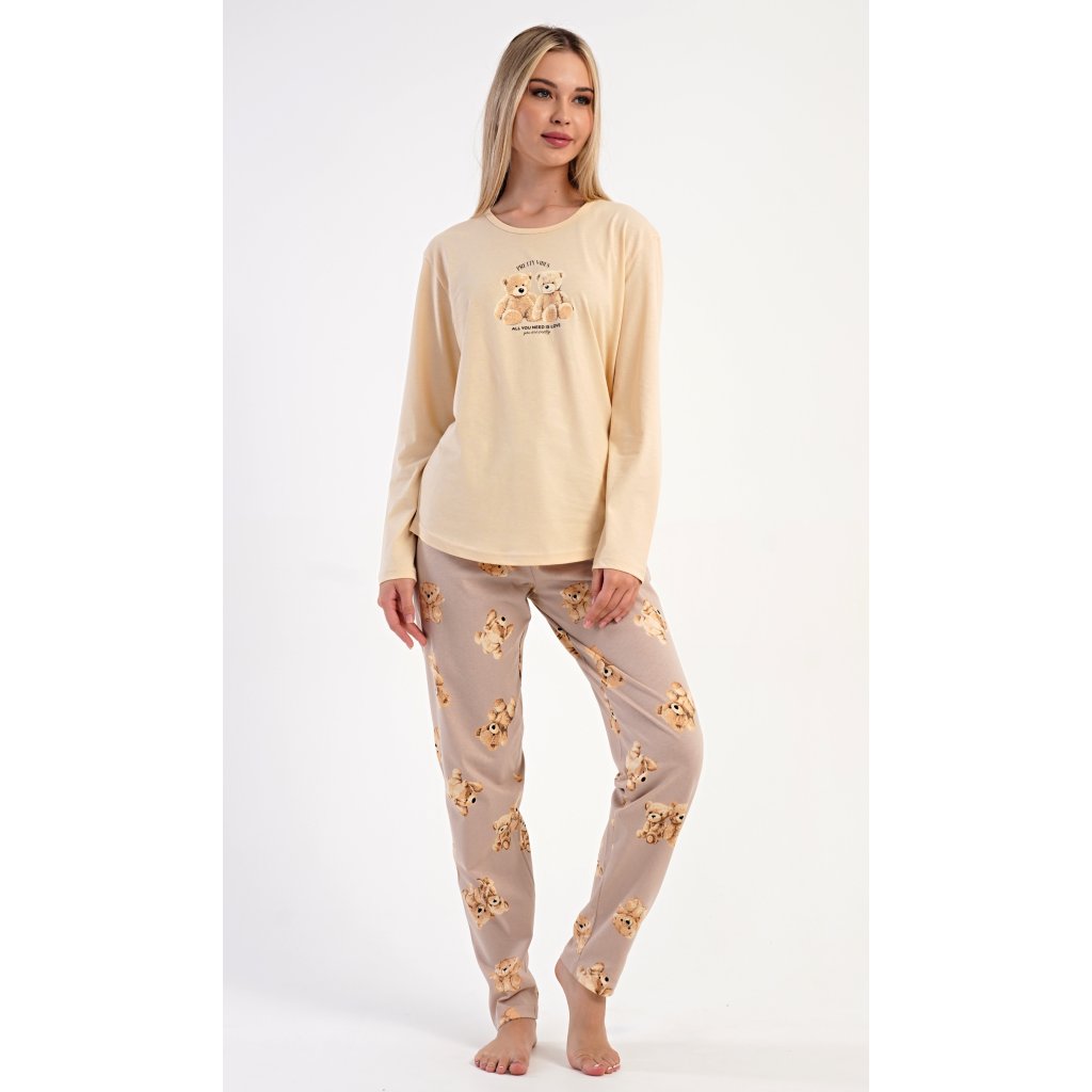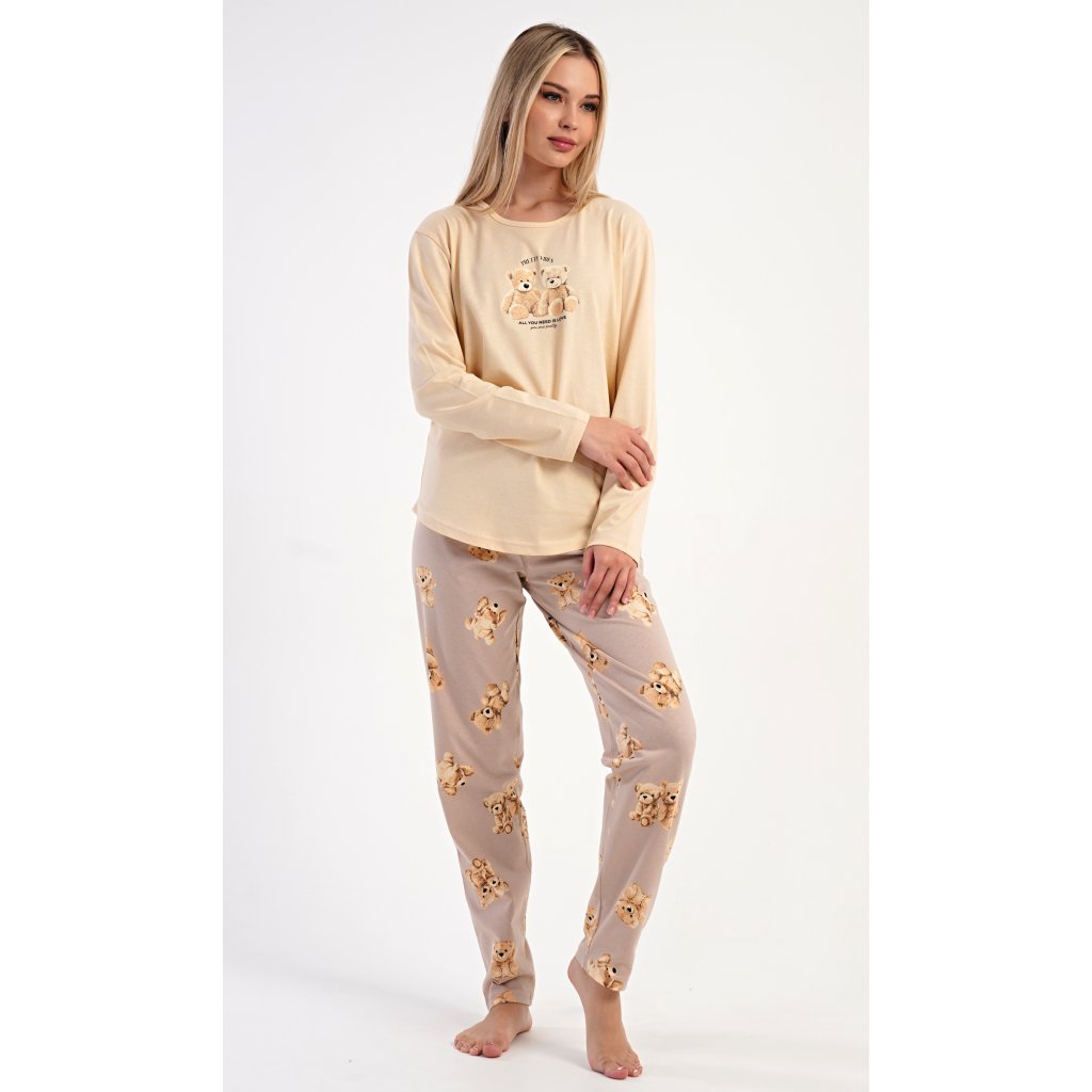 Dámske bavlnené dlhé pyžamo Monika. Dámske pyžamo pozostáva z košele s dlhými rukávmi a dlhých nohavíc. Tričko s okrúhlym výstrihom je na hrudi zdobené obrázkom plyšových medvedíkov. Tento motív sa opakuje aj na nohaviciach, ktoré majú elastický pás a šnúrku, ale nemajú vrecká. Použitý bavlnený materiál je pružný a príjemný na dotyk.