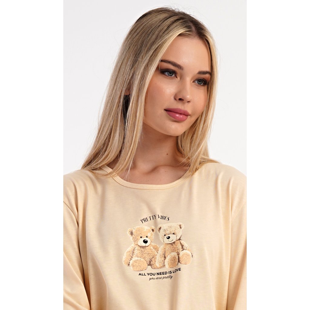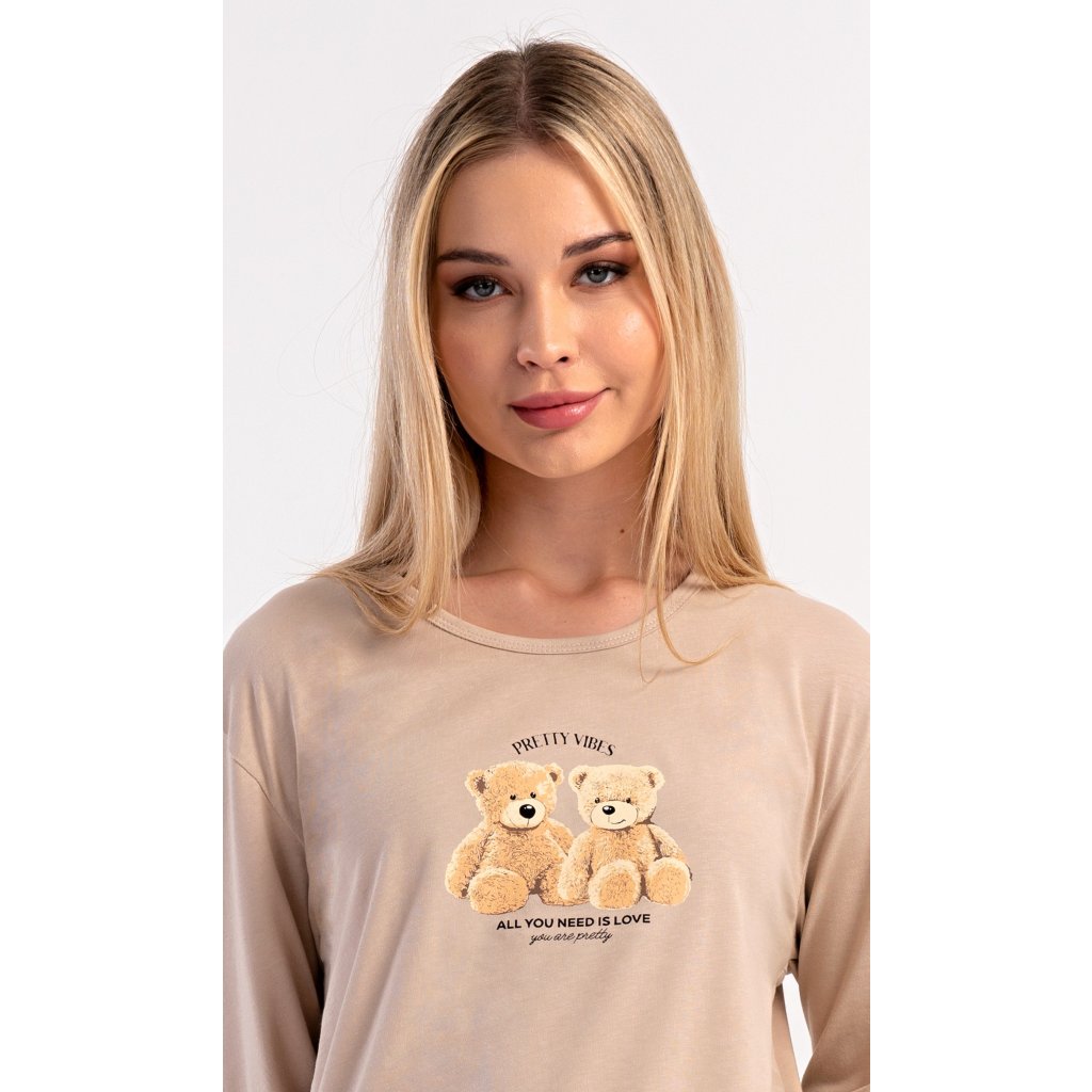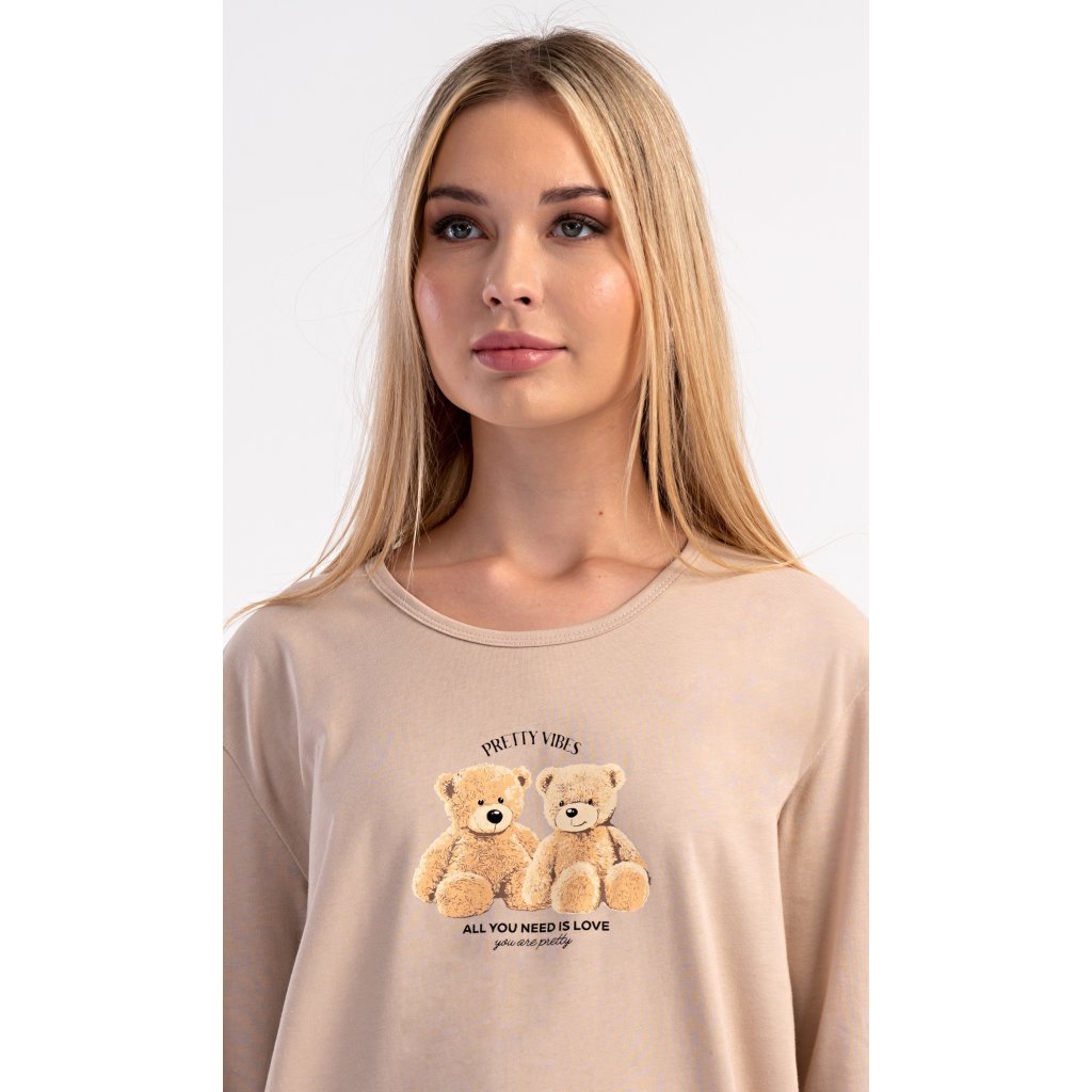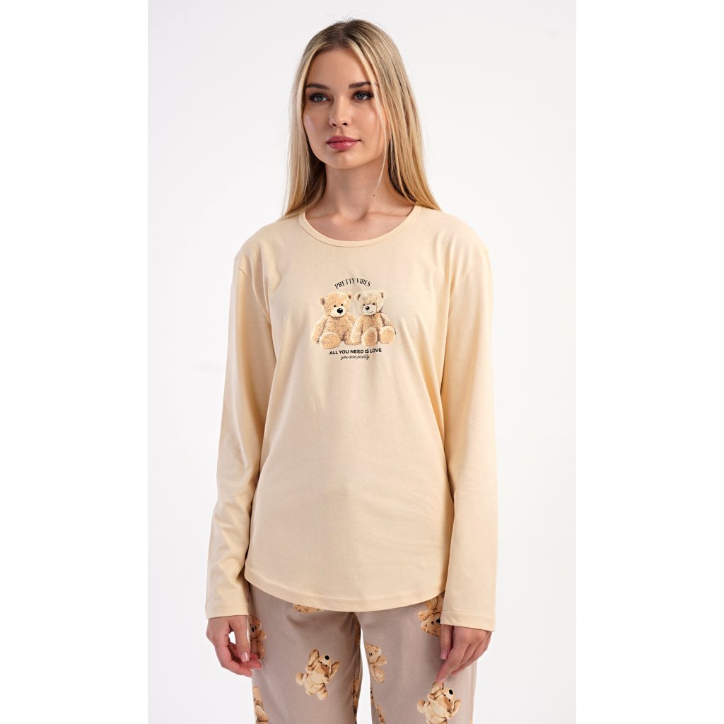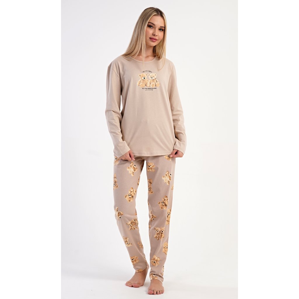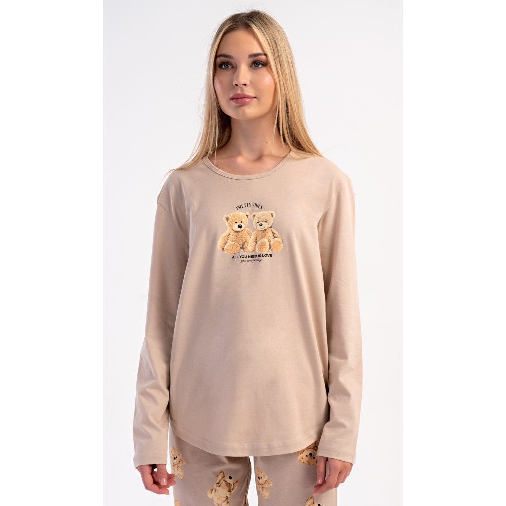 Dámske bavlnené dlhé pyžamo Monika. Dámske pyžamo pozostáva z košele s dlhými rukávmi a dlhých nohavíc. Tričko s okrúhlym výstrihom je na hrudi zdobené obrázkom plyšových medvedíkov. Tento motív sa opakuje aj na nohaviciach, ktoré majú elastický pás a šnúrku, ale nemajú vrecká. Použitý bavlnený materiál je pružný a príjemný na dotyk.