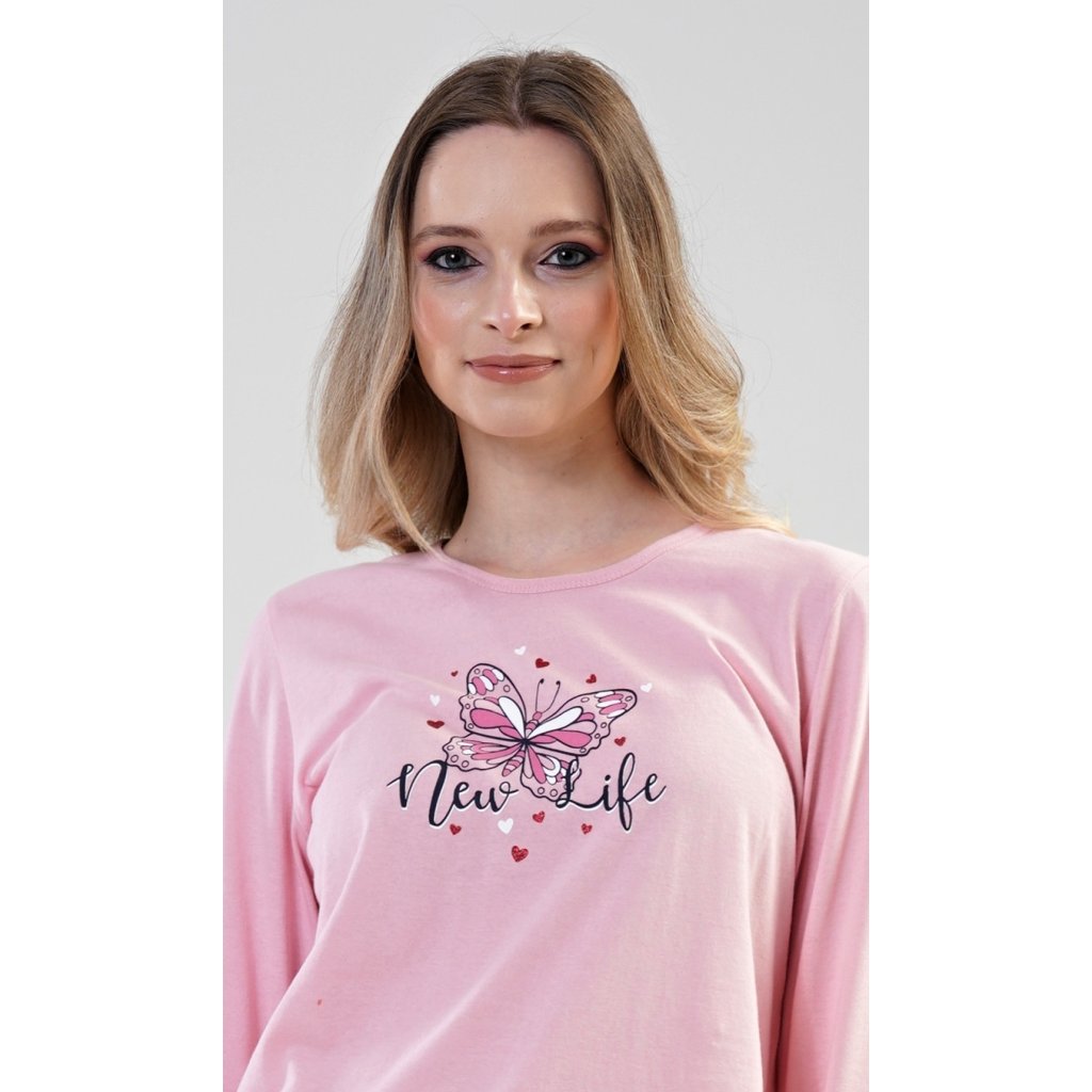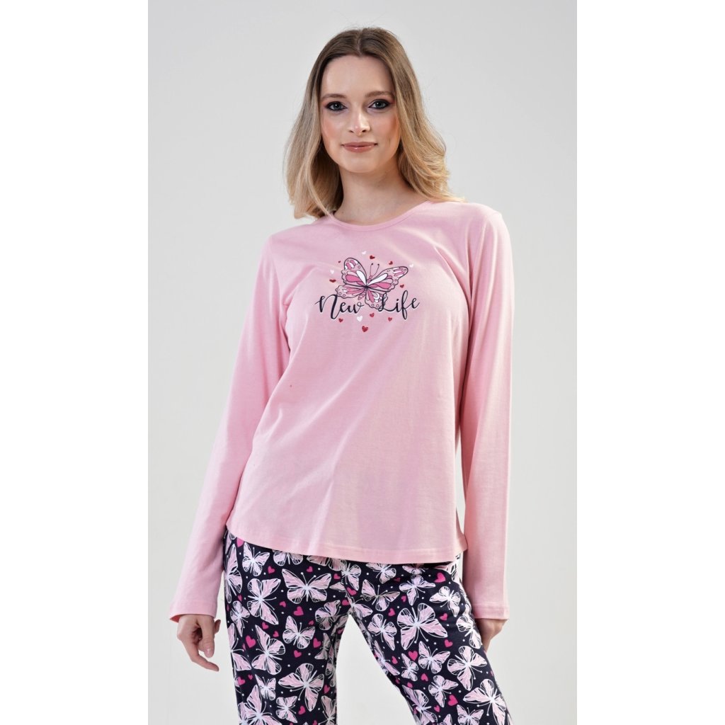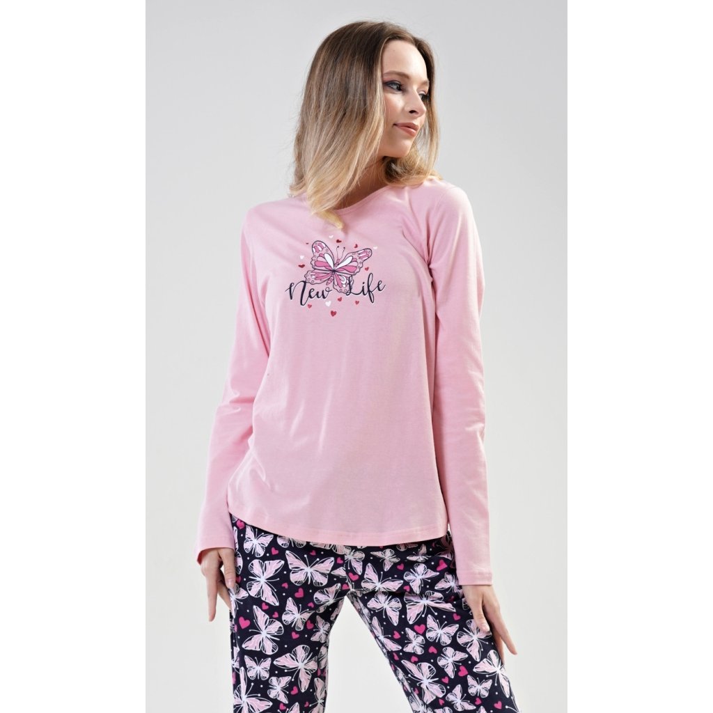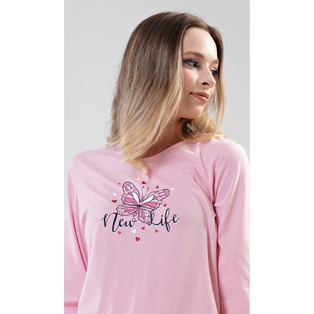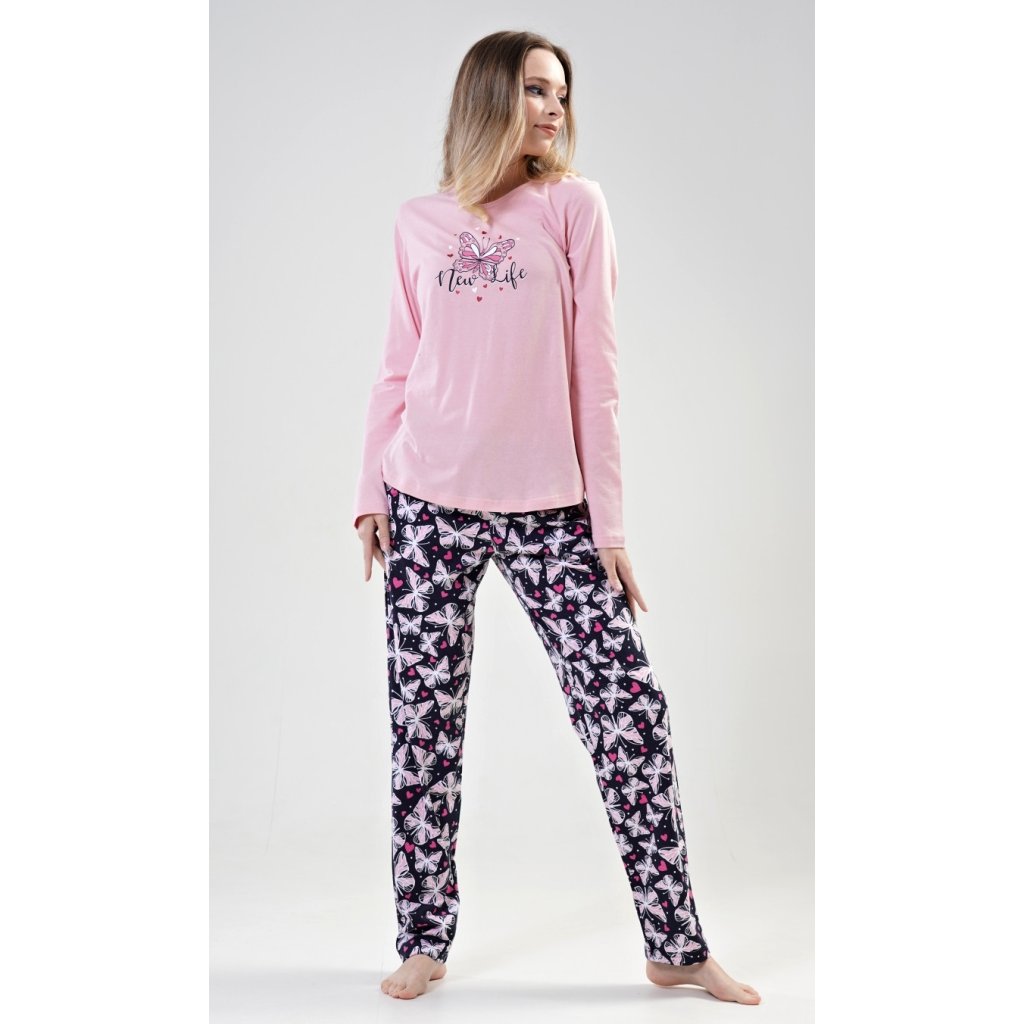 Dámske dlhé bavlnené pyžamo Butterflies. Dámske pyžamo sa skladá z trička s dlhým rukávom a dlhých nohavíc. Tričko je jednofarebné, zdobí ho obrázok motýľa a nápis "New life". Nohavice sú tmavosivé s potlačou motýľov a srdiečok. Nohavice majú elastický pás, šnúrku na stiahnutie a praktické vrecká. Použitý bavlnený materiál je pružný a príjemný na dotyk.