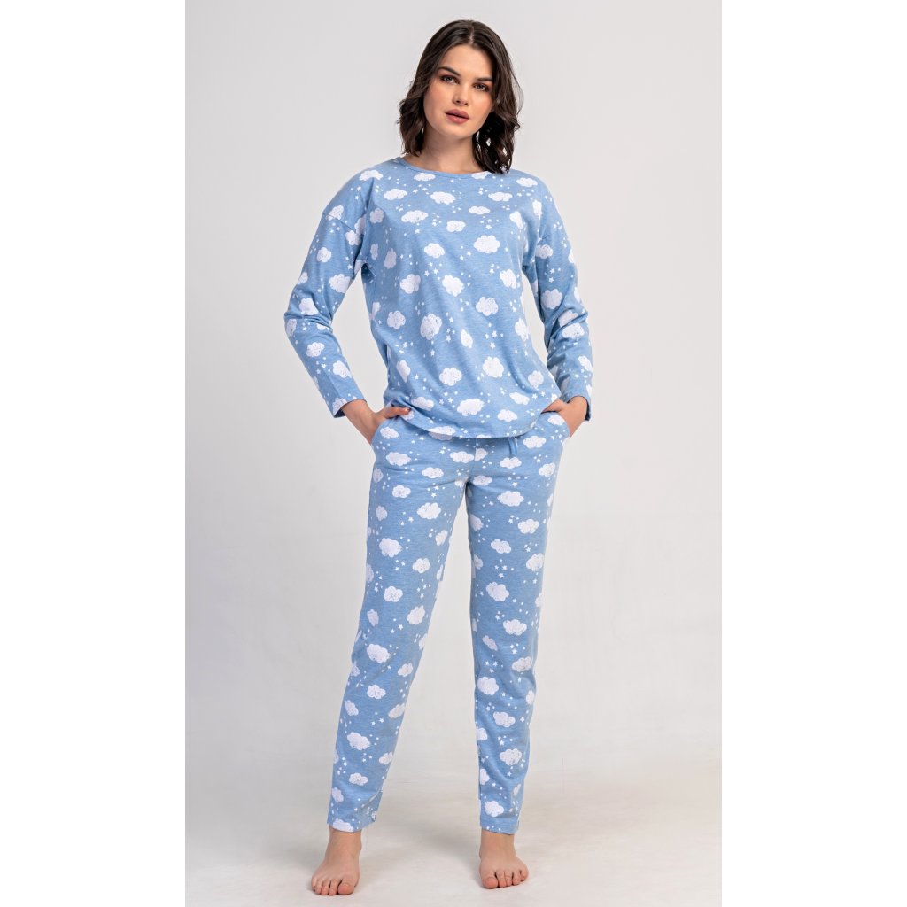 Dámske dlhé pyžamo Obláčik. Dámske pyžamo pozostáva z košele s dlhými rukávmi a dlhých nohavíc. Tričko je potlačené obláčikmi a hviezdičkami. Táto potlač sa opakuje aj na nohaviciach, ktoré majú v páse gumu a šnúrku na stiahnutie, nemajú vrecká. Materiál zo 70 % bavlny je pružný a príjemný na dotyk.