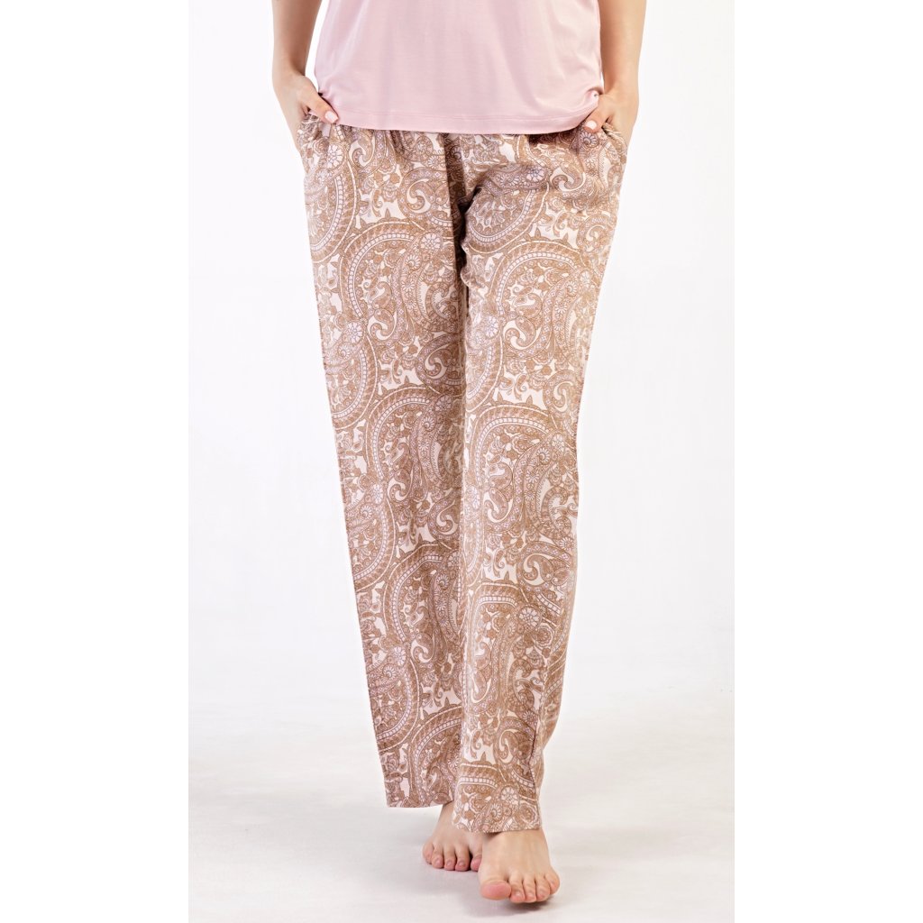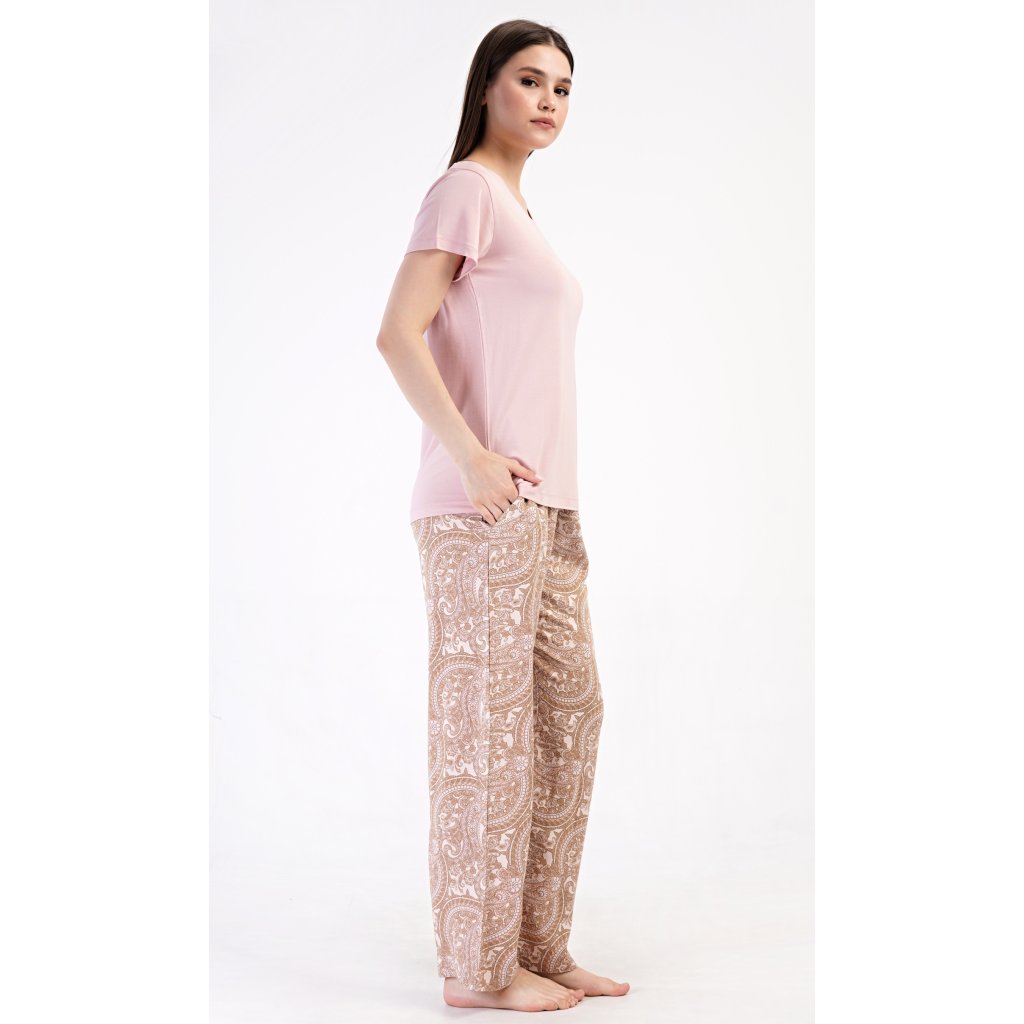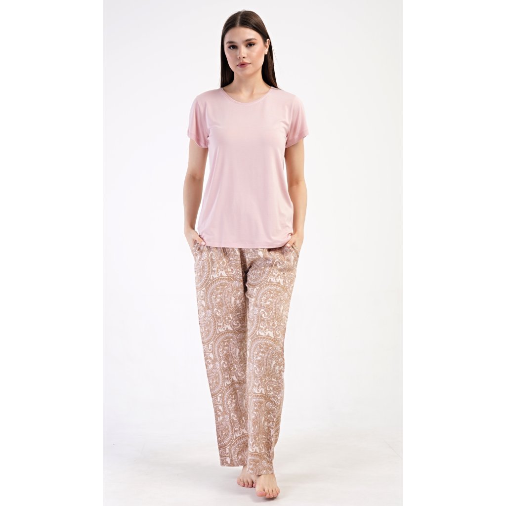 Dámske pyžamo s krátkym rukávom Olga. Dámske pyžamo sa skladá z trička s krátkym rukávom a dlhých nohavíc. Tričko je jednofarebné, bez potlače, má okrúhly výstrih. Nohavice potlačené orientálnymi vzormi majú v páse gumu a šnúrku na stiahnutie, nemajú vrecká. Použitý viskózový materiál je poddajný a príjemný na dotyk.