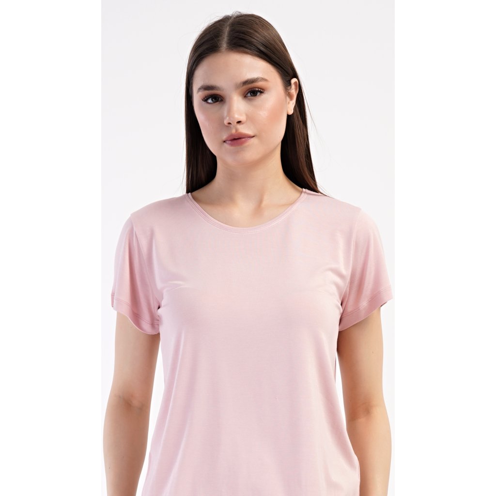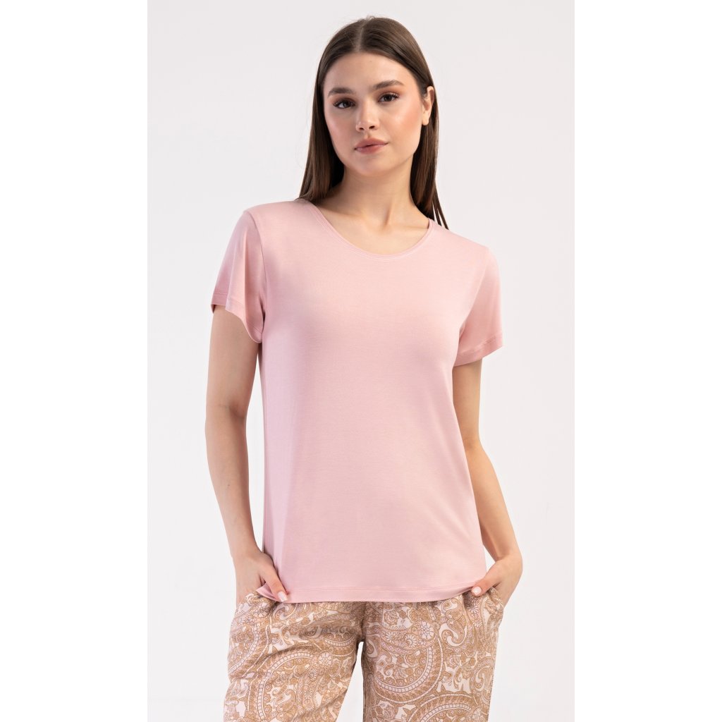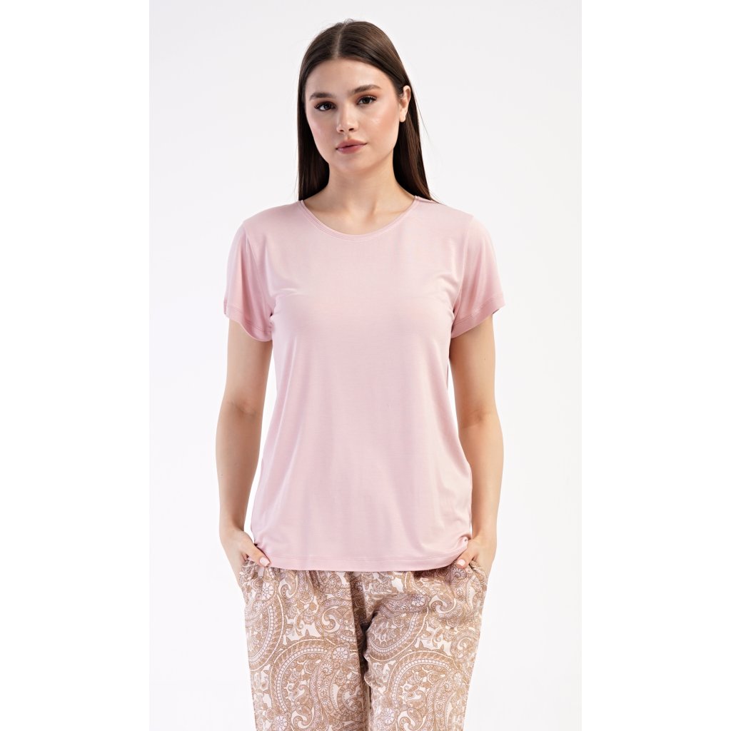 Dámske pyžamo s krátkym rukávom Olga. Dámske pyžamo sa skladá z trička s krátkym rukávom a dlhých nohavíc. Tričko je jednofarebné, bez potlače, má okrúhly výstrih. Nohavice potlačené orientálnymi vzormi majú v páse gumu a šnúrku na stiahnutie, nemajú vrecká. Použitý viskózový materiál je poddajný a príjemný na dotyk.