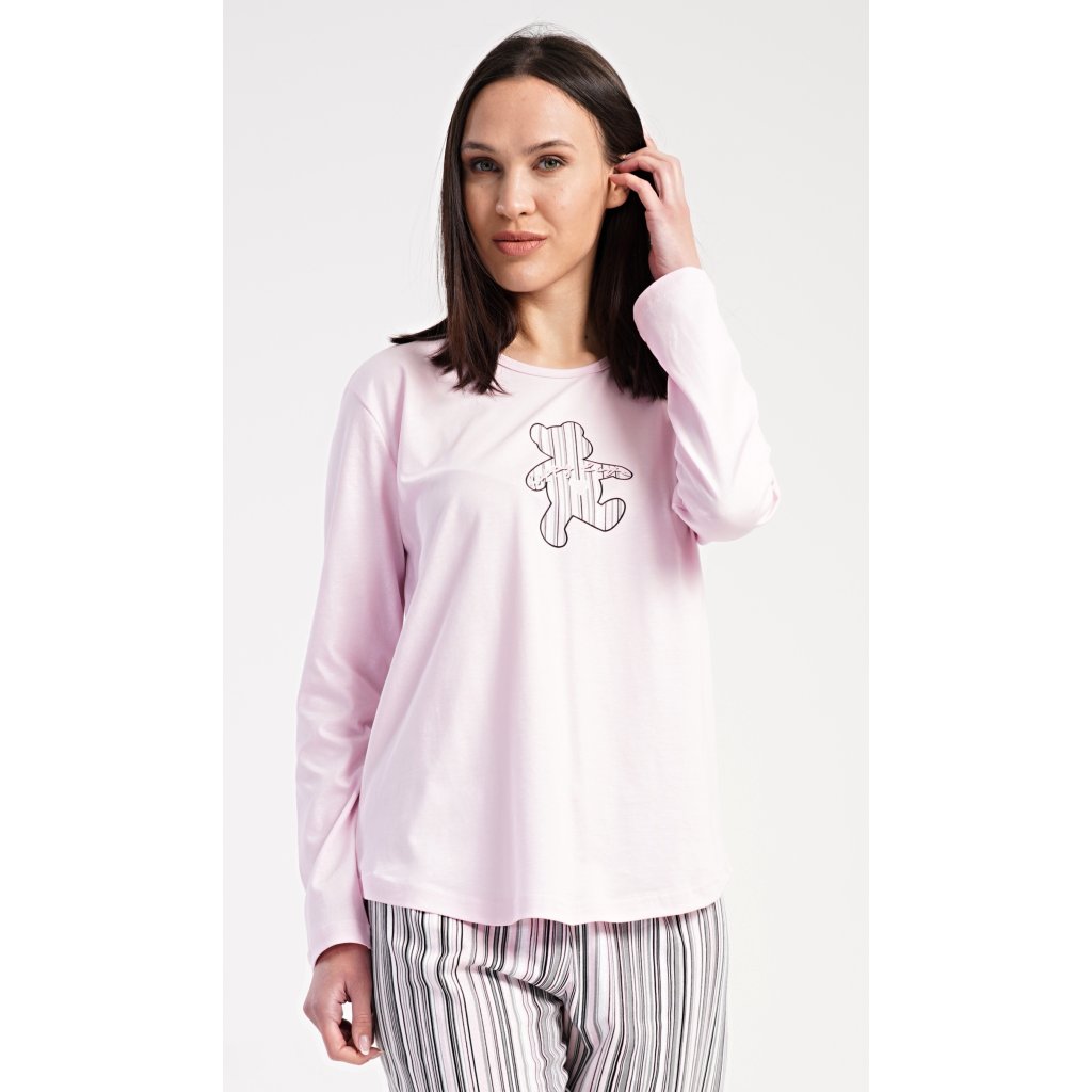 Dámske bavlnené dlhé pyžamo Paulína. Dámske pyžamo pozostáva z košele s dlhými rukávmi a dlhých nohavíc. Tričko je jednofarebné, zdobené na hrudi obrázkom medvedíka. Prúžkované nohavice majú v páse gumu a šnúrku na stiahnutie, nemajú vrecká. Použitý bavlnený materiál je pružný a príjemný na dotyk.
