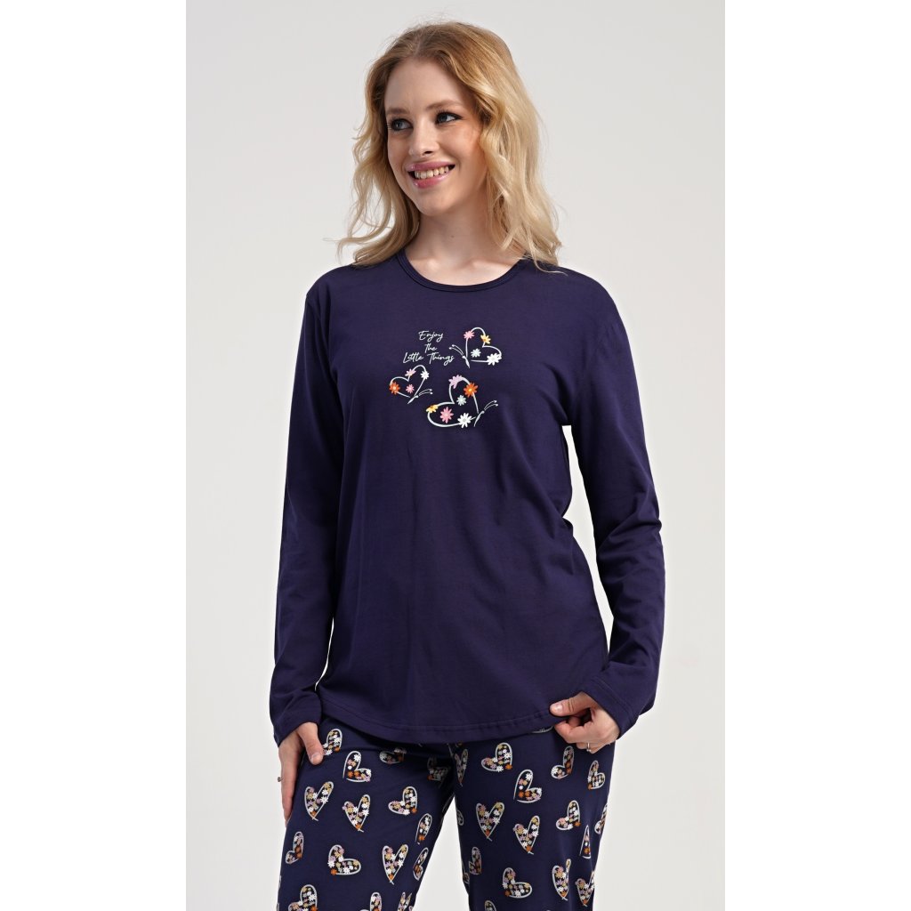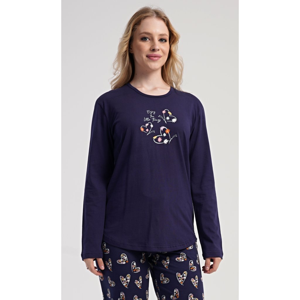 Dámske bavlnené dlhé pyžamo Sarah. Dámske pyžamo pozostáva z košele s dlhými rukávmi a dlhých nohavíc. Jednofarebné tričko je ozdobené obrázkom kvetov a motýľov. Kvetinový motív sa opakuje aj na nohaviciach, ktoré majú elastický pás a šnúrku, ale nemajú vrecká. Použitý bavlnený materiál je pružný a príjemný na dotyk.