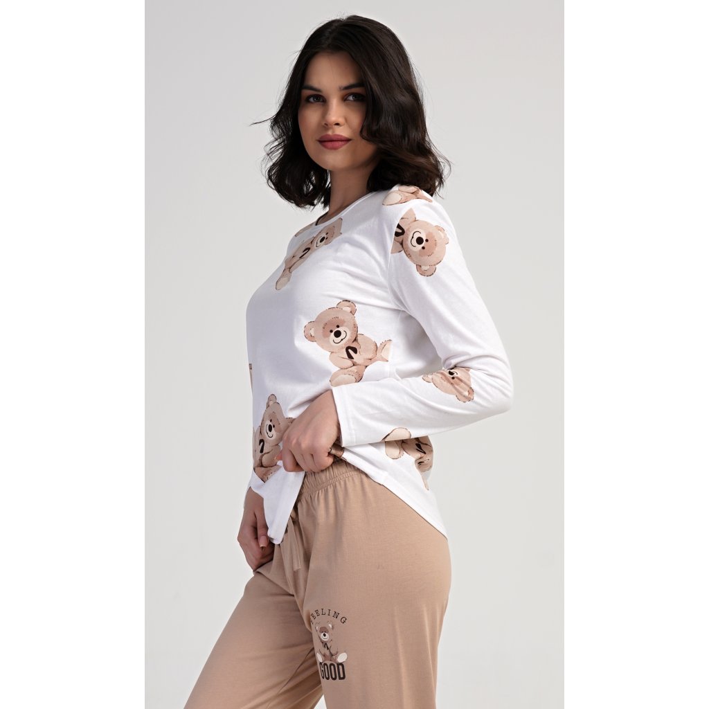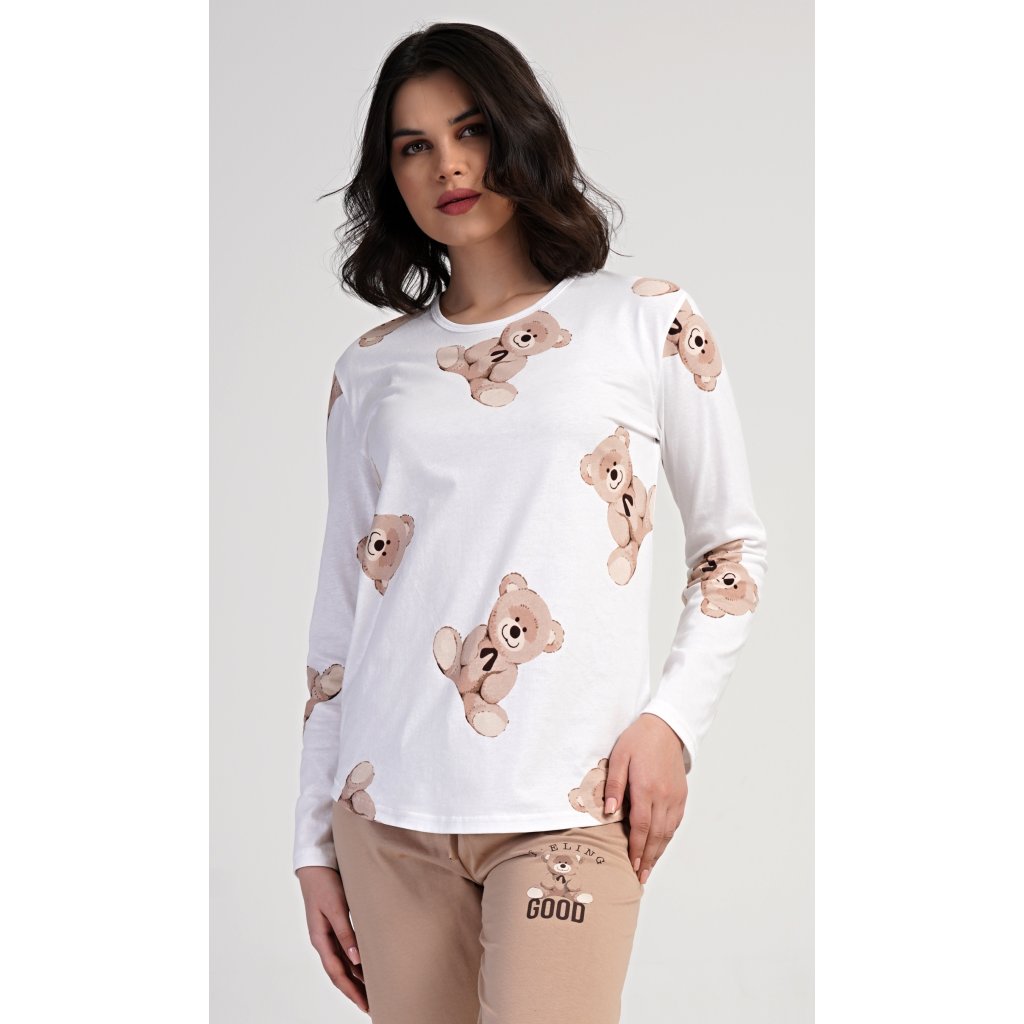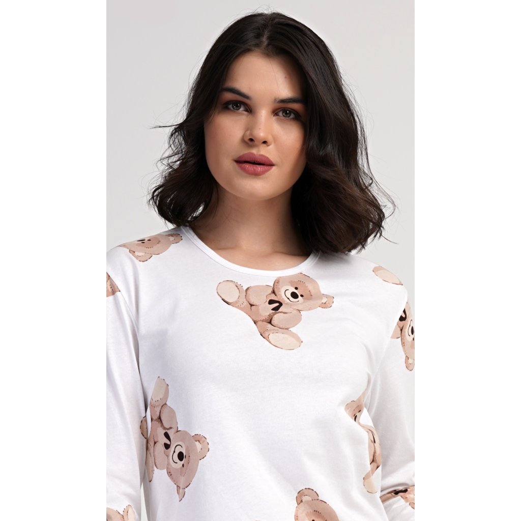 Dámske bavlnené dlhé pyžamo Teddy bear. Dámske pyžamo pozostáva z košele s dlhými rukávmi a dlhých nohavíc. Tričko je potlačené plyšovými medvedíkmi. Tento motív sa opakuje aj na nohaviciach, ktoré majú elastický pás a šnúrku, ale nemajú vrecká. Použitý bavlnený materiál je pružný a príjemný na dotyk.