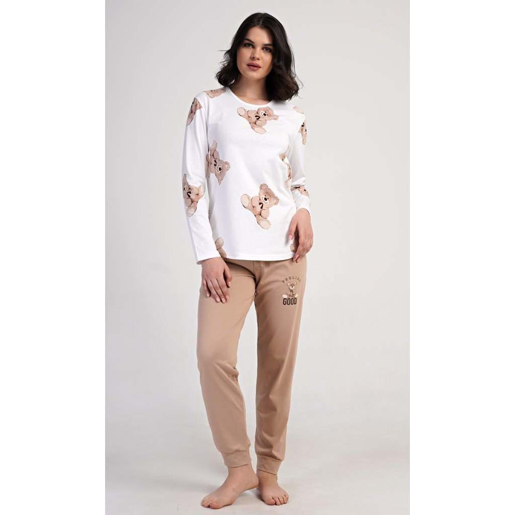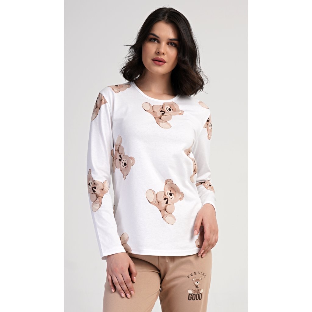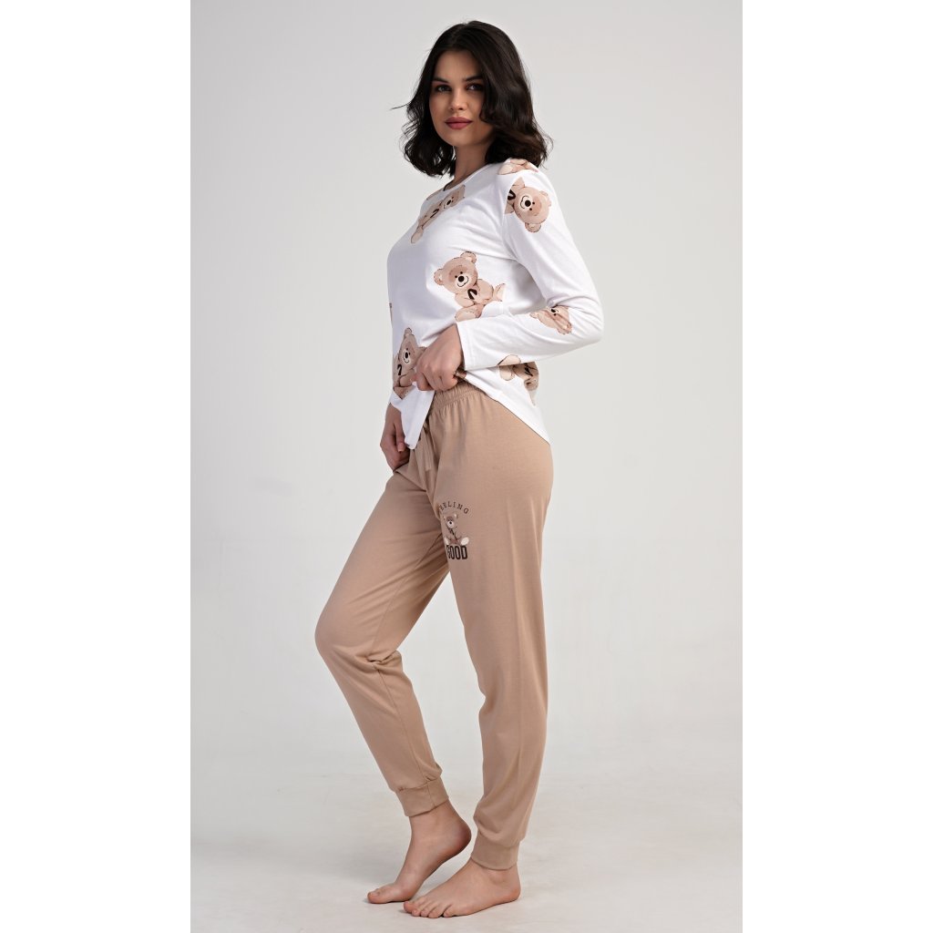 Dámske bavlnené dlhé pyžamo Teddy bear. Dámske pyžamo pozostáva z košele s dlhými rukávmi a dlhých nohavíc. Tričko je potlačené plyšovými medvedíkmi. Tento motív sa opakuje aj na nohaviciach, ktoré majú elastický pás a šnúrku, ale nemajú vrecká. Použitý bavlnený materiál je pružný a príjemný na dotyk.