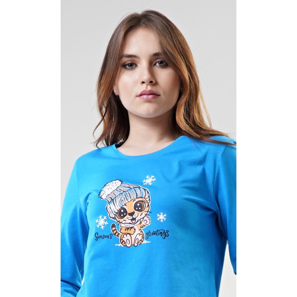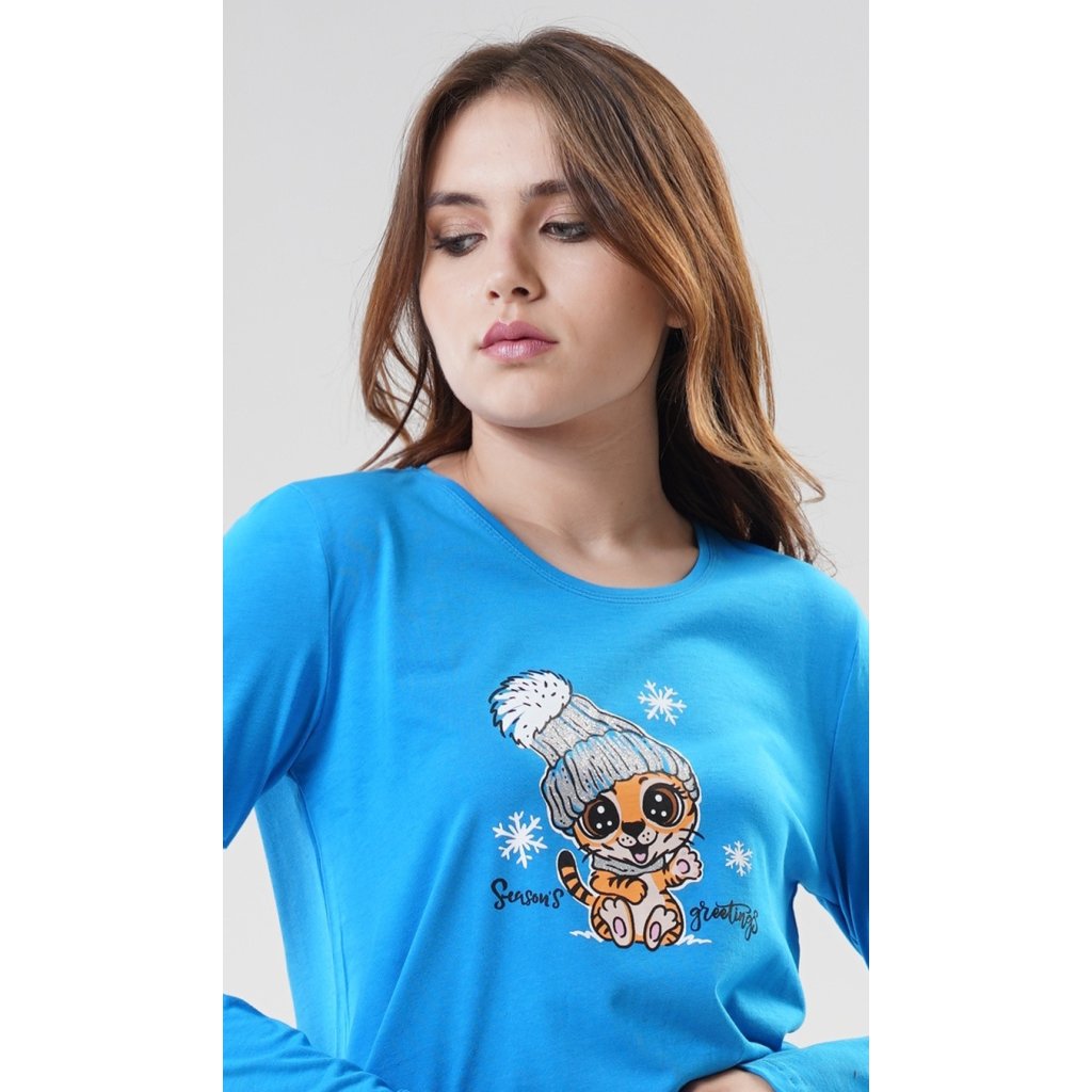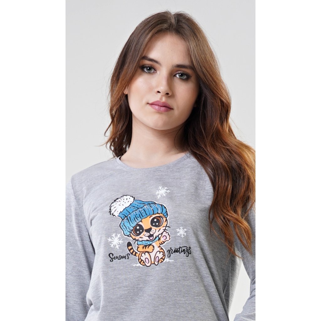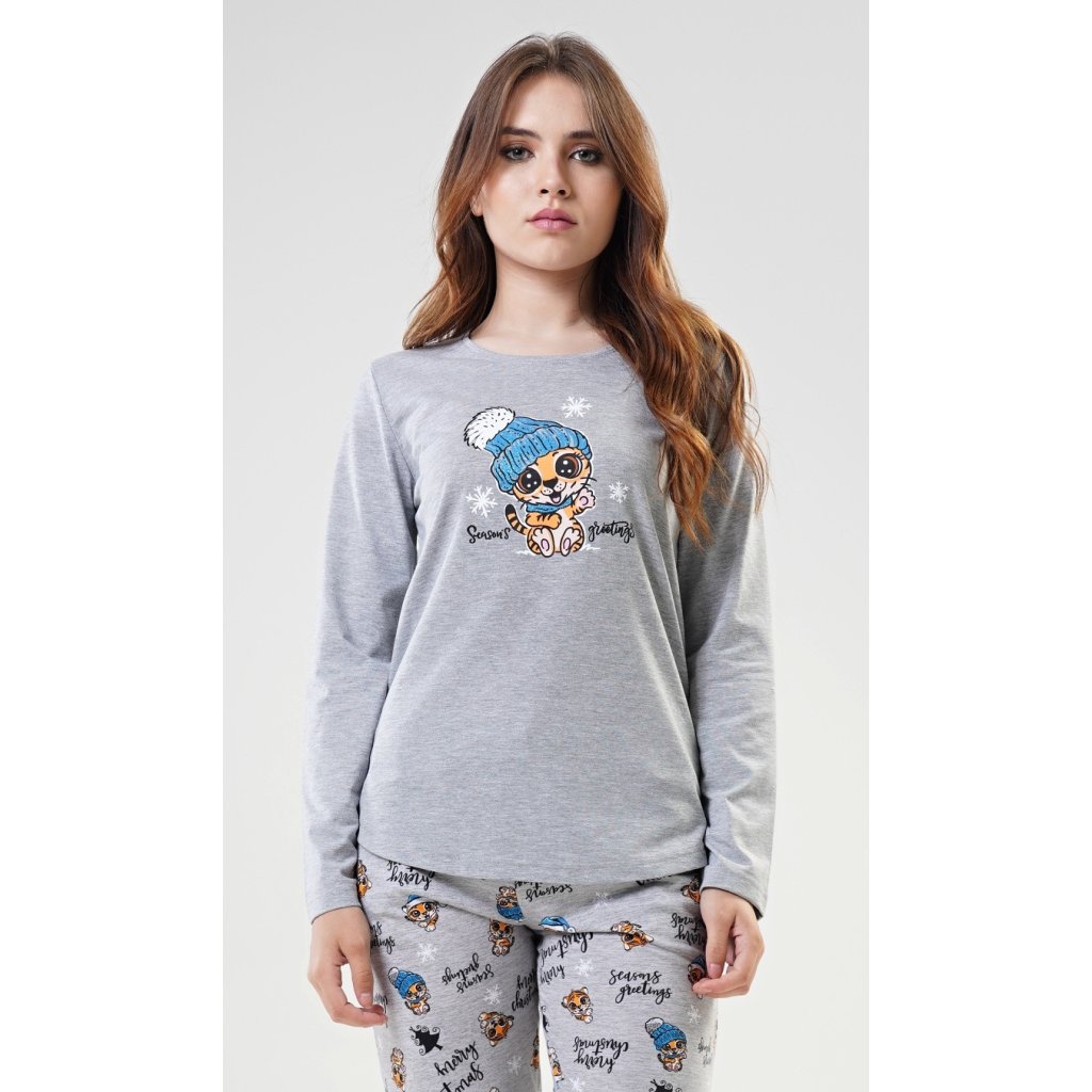 Dámske dlhé pyžamo Tiger. Dámske pyžamo sa skladá z trička s dlhým rukávom a dlhých nohavíc. Tričko je jednofarebné, zdobené potlačou roztomilého tigra s klobúkom. Nohavice sú sivé, potlačené malými tigrami a nápismi. Nohavice majú elastický pás, šnúrku na stiahnutie a praktické vrecká. Použitý materiál je pružný a príjemný na dotyk. Tričko je vyrobené zo 100 % bavlny v modrej farbe a zo 70 % v sivej farbe, nohavice obsahujú 70 % bavlny.