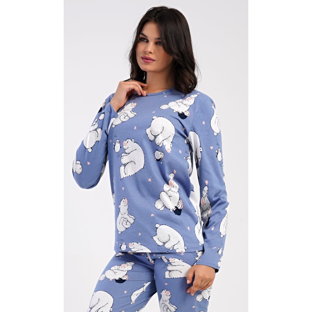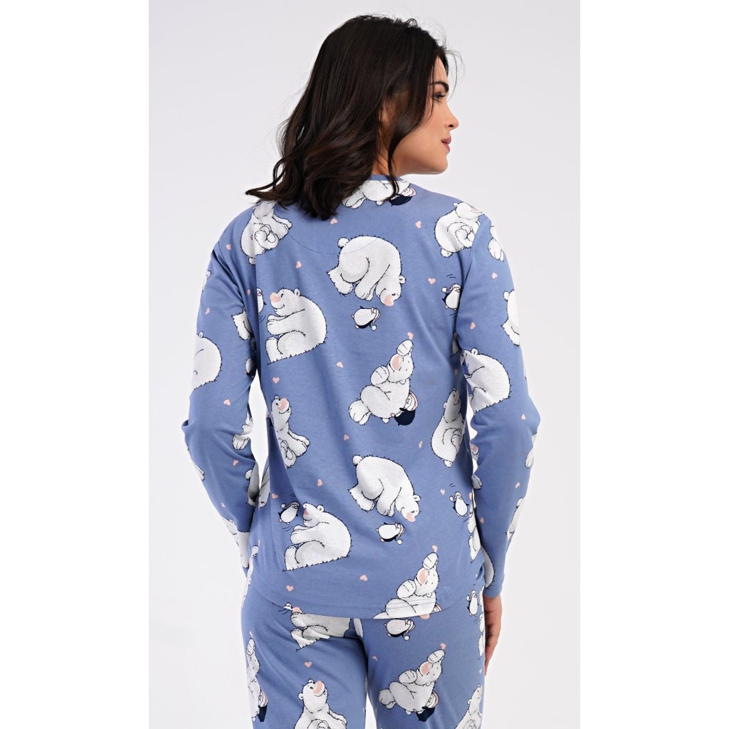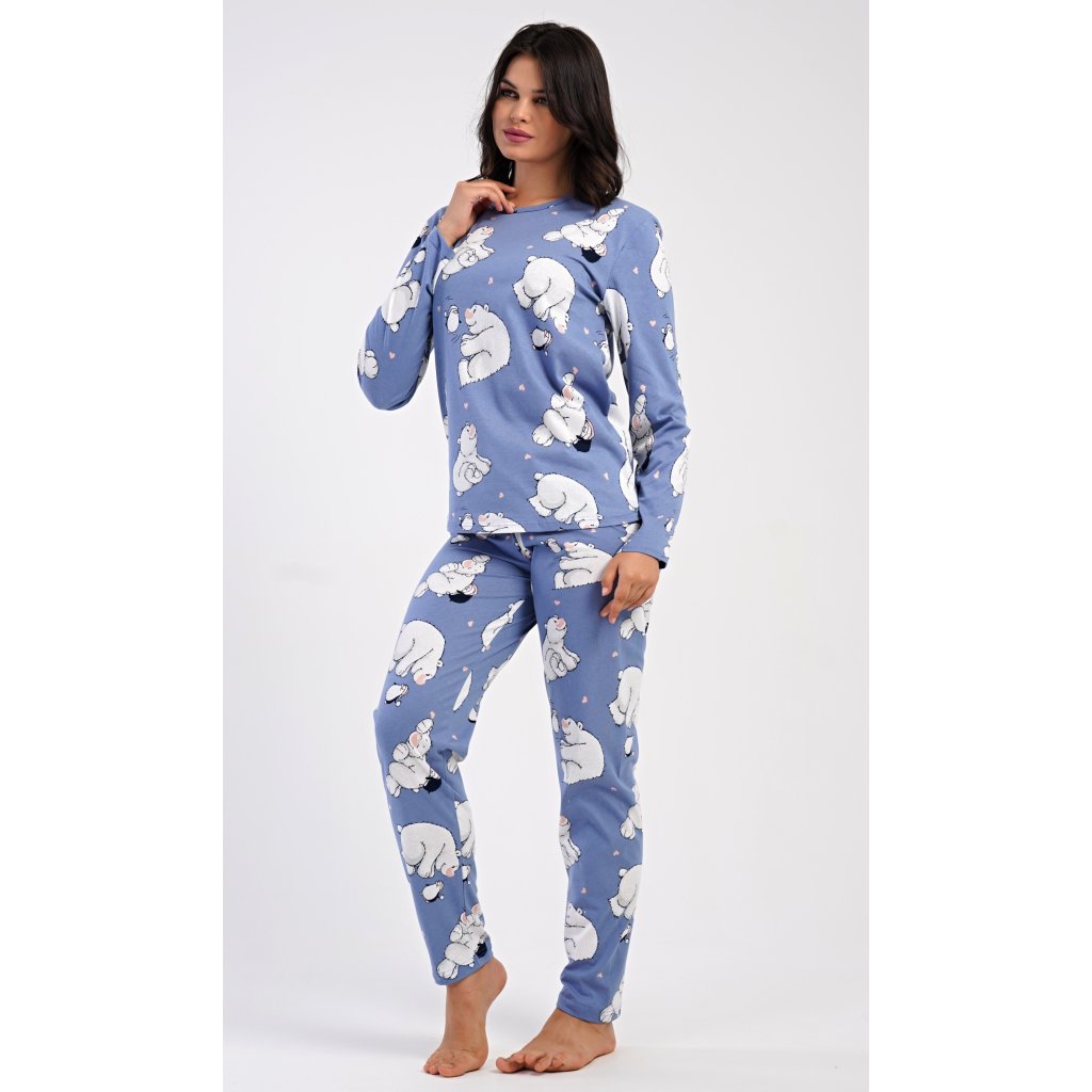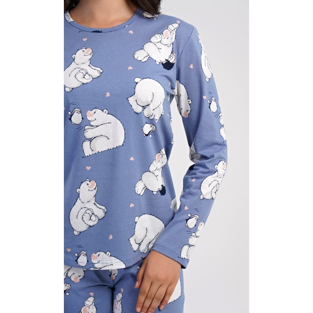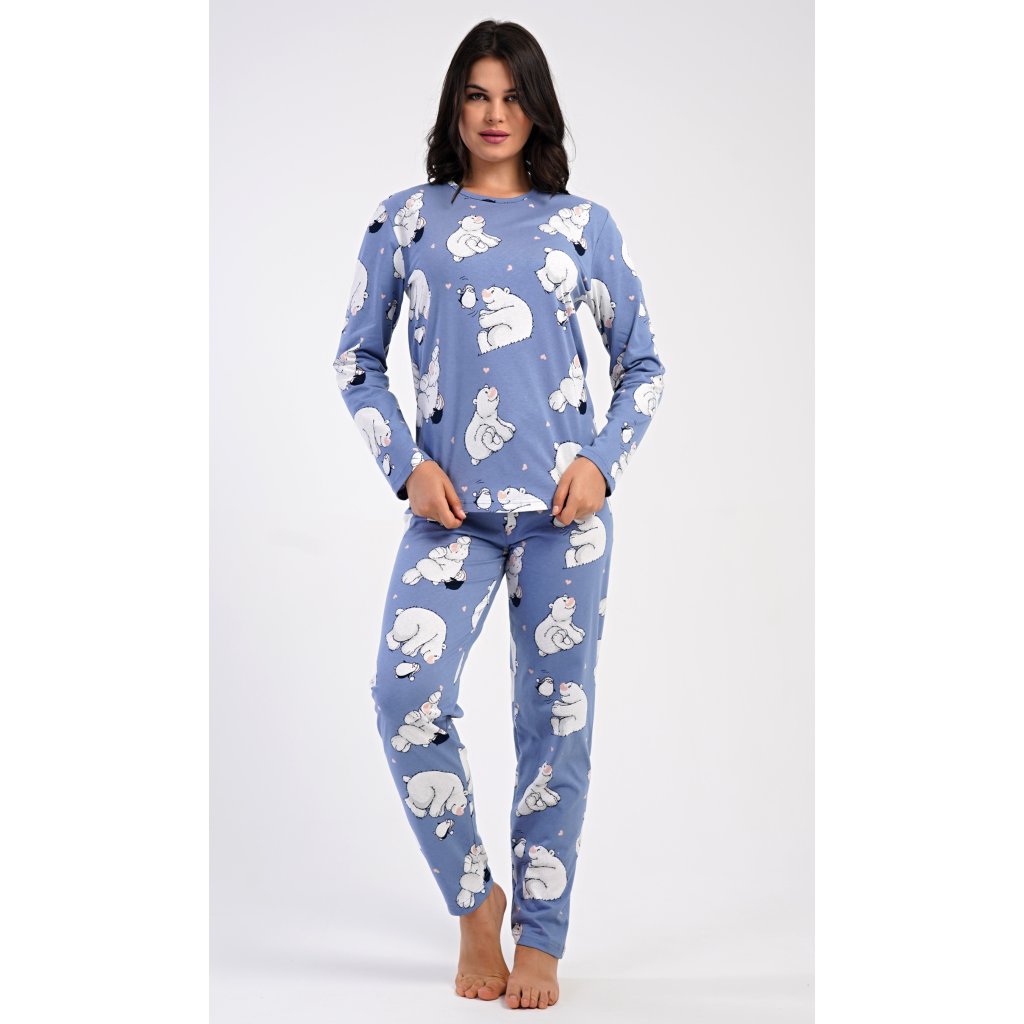 Dámske bavlnené dlhé pyžamo Tučniak a medvedík. Dámske pyžamo pozostáva z košele s dlhými rukávmi a dlhých nohavíc. Tričko s okrúhlym výstrihom je ozdobené obrázkami ľadových medveďov. Tento motív sa opakuje aj na nohaviciach, ktoré majú elastický pás a šnúrku, ale nemajú vrecká. Použitý bavlnený materiál je pružný a príjemný na dotyk.