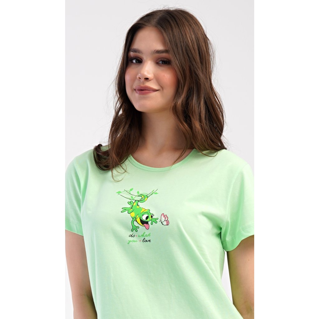 Dámske bavlnené kapri pyžamo Ella. Dámske pyžamo pozostáva z trička s krátkym rukávom a trojštvrťových nohavíc. Tričko s okrúhlym výstrihom zdobí obrázok veselej jašterice. Tento motív sa opakuje aj na nohaviciach, ktoré majú elastický pás a šnúrku a sú bez vreciek. Použitý bavlnený materiál je príjemný a pružný na dotyk.