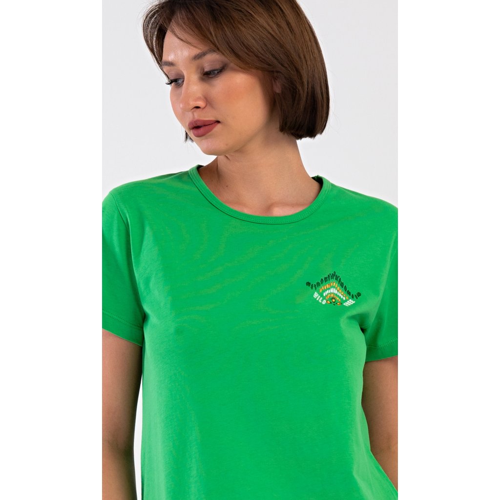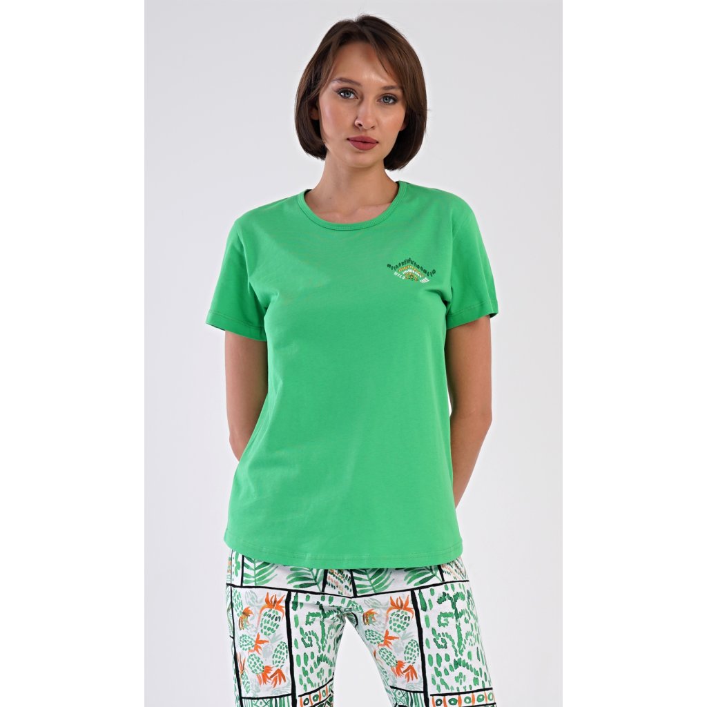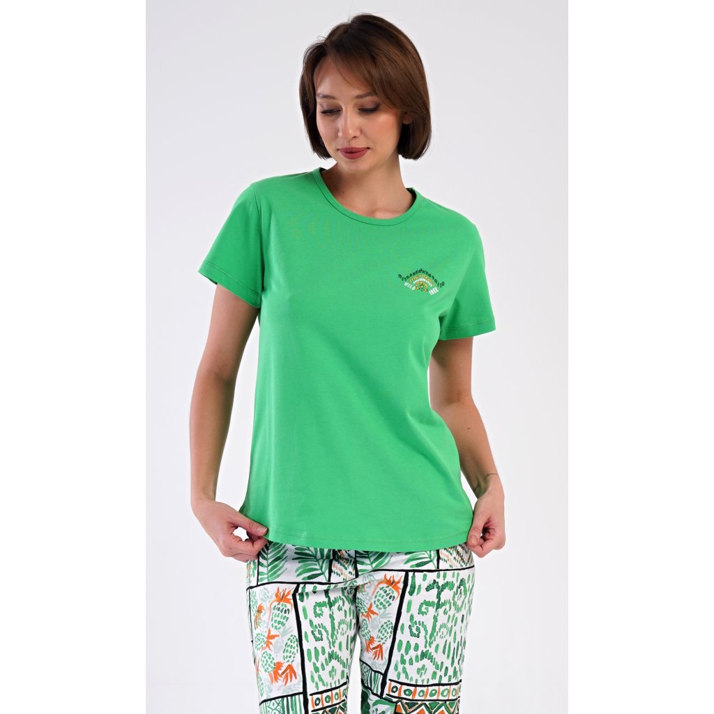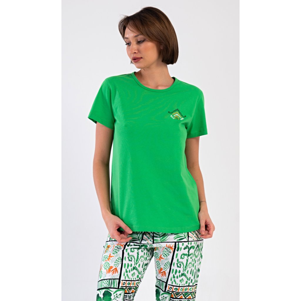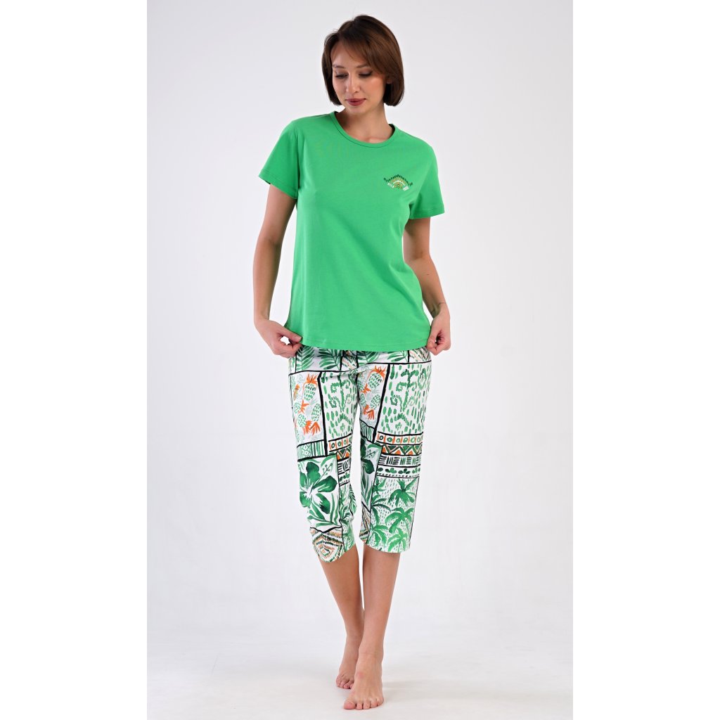 Dámske bavlnené kapri pyžamo Janette. Dámske pyžamo pozostáva z trička s krátkym rukávom a trojštvrťových nohavíc. Tričko s okrúhlym výstrihom zdobí na hrudi drobný obrázok. Nohavice s potlačou exotických motívov majú v páse gumu a šnúrku na stiahnutie, sú bez vreciek. Použitý bavlnený materiál je príjemný a pružný na dotyk.