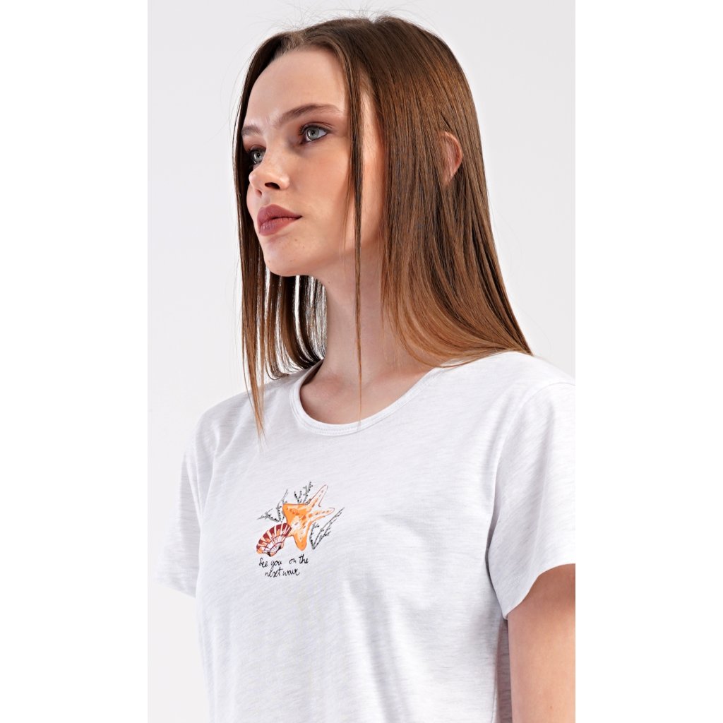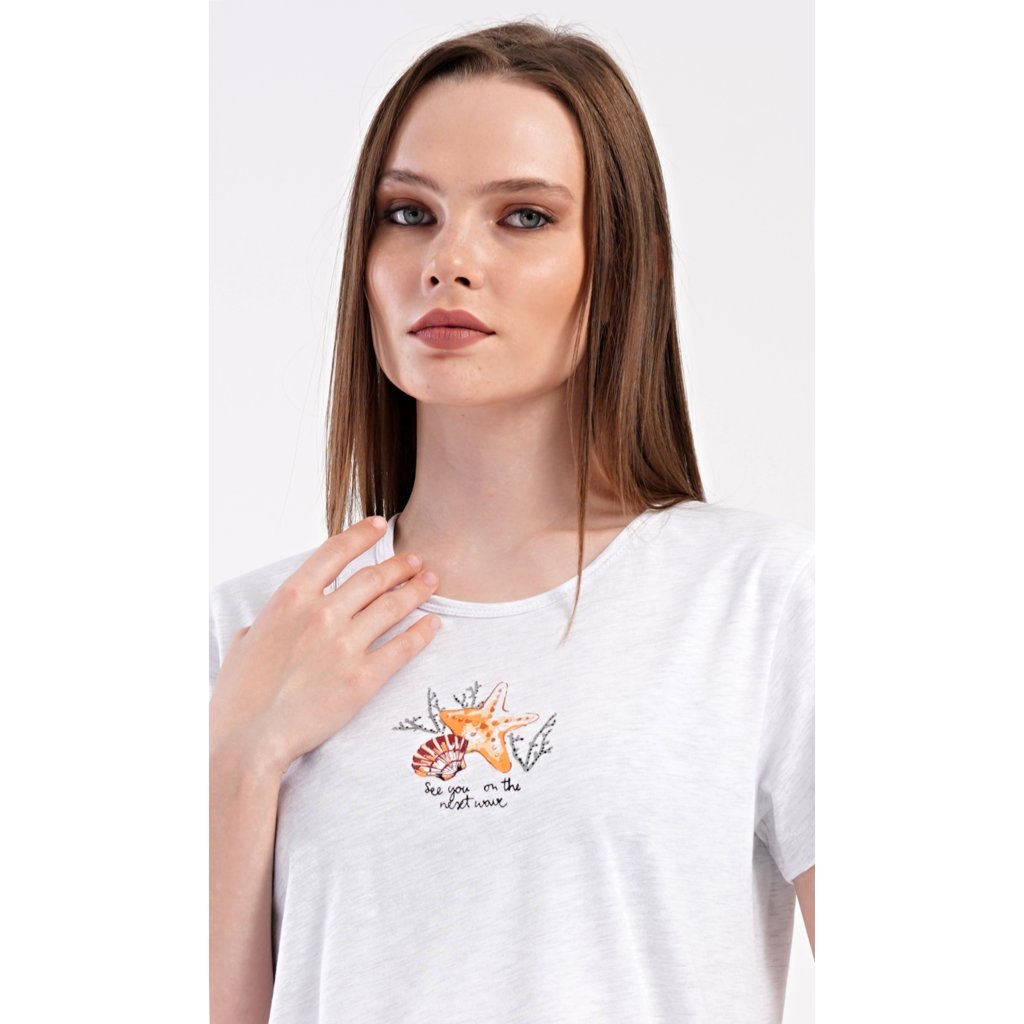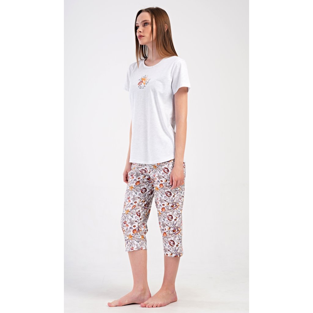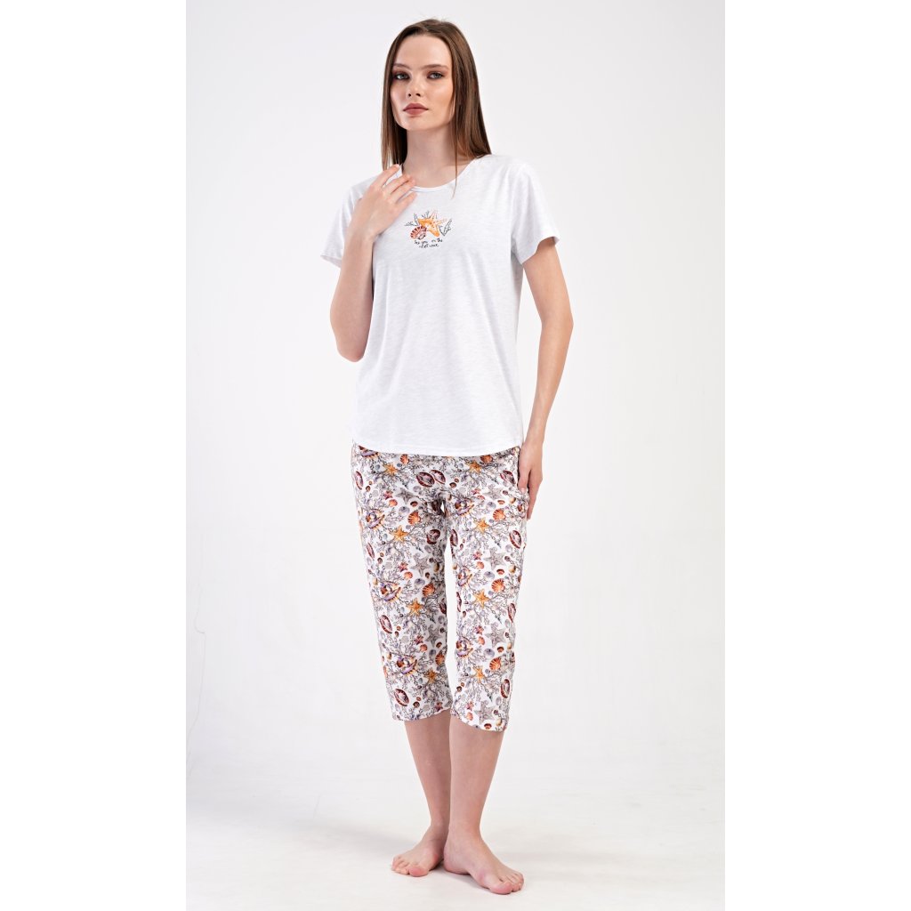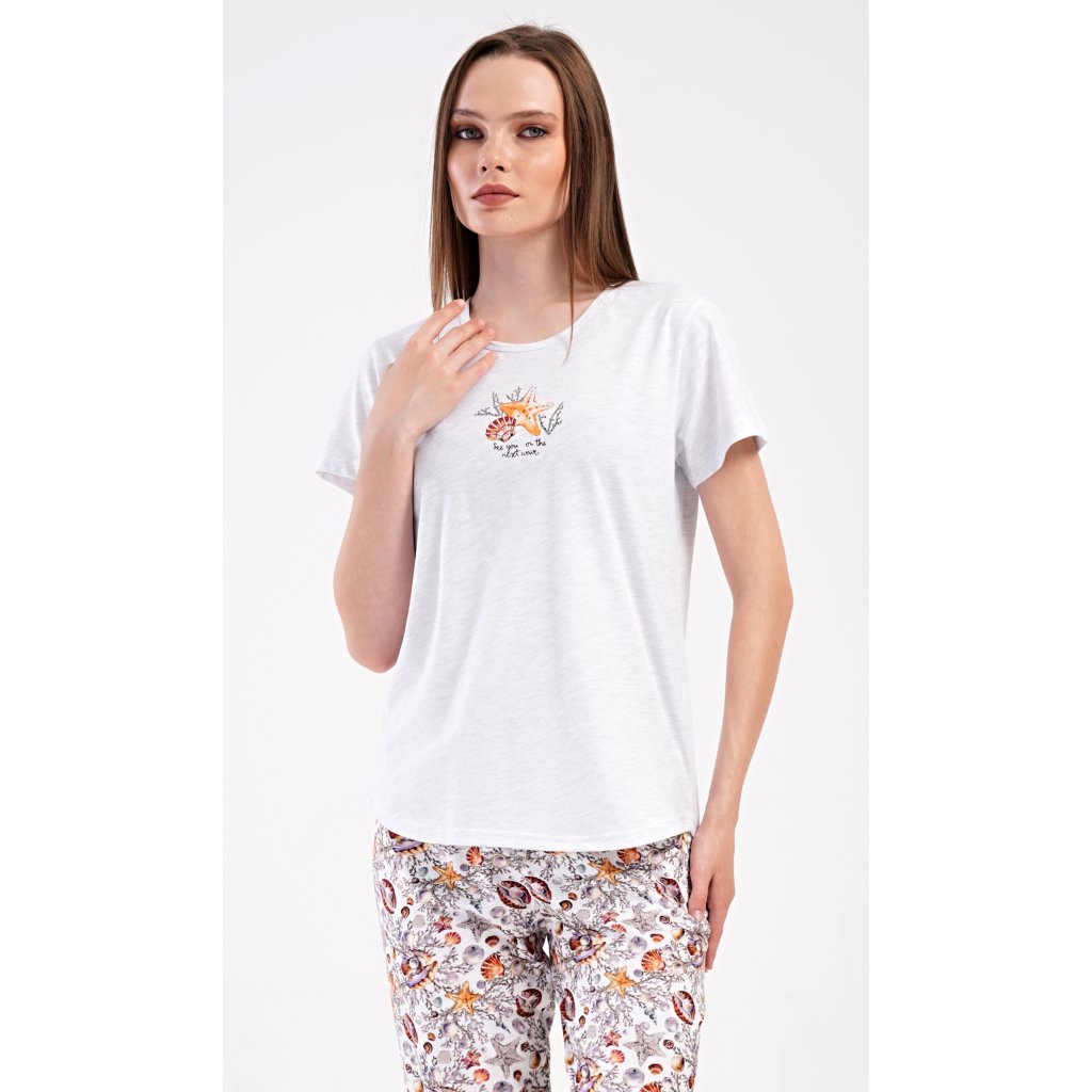 Dámske kapri pyžamo More. Dámske pyžamo pozostáva z trička s krátkym rukávom a trojštvrťových nohavíc. Tričko s okrúhlym výstrihom zdobí na hrudi obrázok s morským motívom. Tento motív sa opakuje aj na nohaviciach, ktoré majú elastický pás a šnúrku a sú bez vreciek. Materiál zo 70 % bavlny je príjemný a pružný na dotyk.