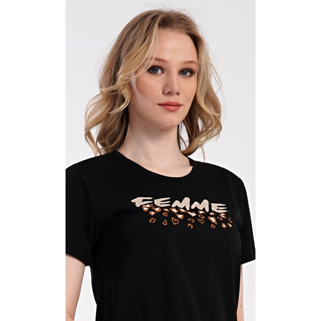 Dámske bavlnené šortkové pyžamo Femme. Dámske pyžamo pozostáva z trička s krátkym rukávom a šortiek. Jednofarebné tričko zdobí nápis FEMME a leopardí vzor. Tento motív sa opakuje aj na šortkách, ktoré majú elastický pás a šnúrku a sú bez vreciek. Použitý bavlnený materiál je príjemný a pružný na dotyk.
