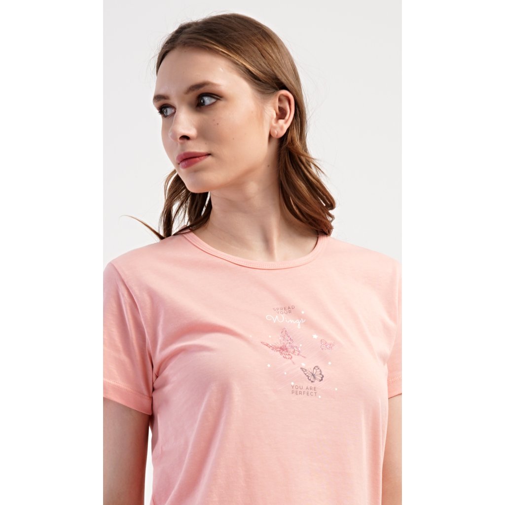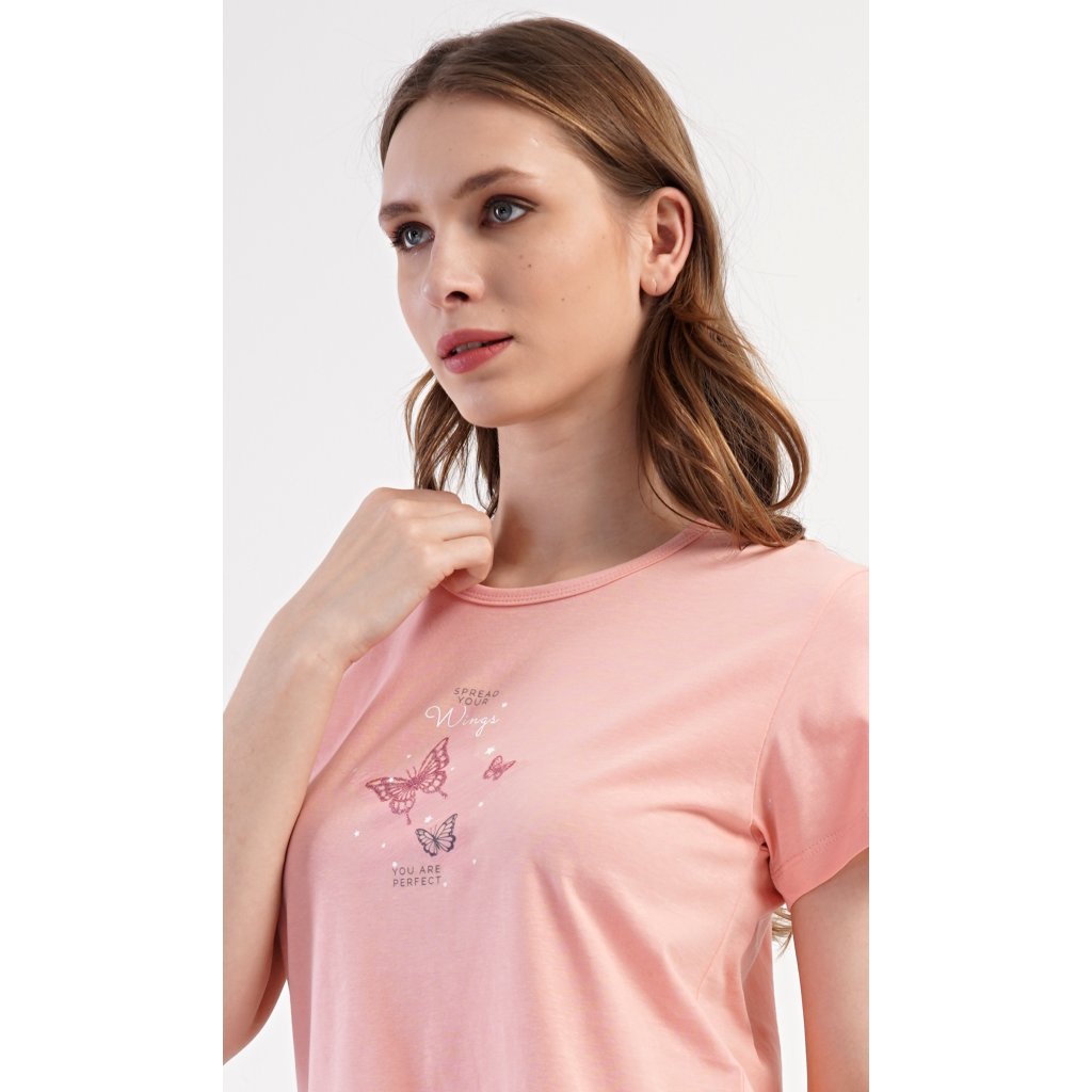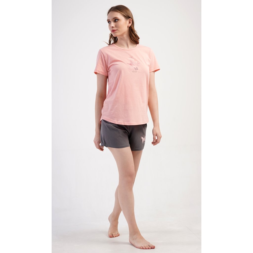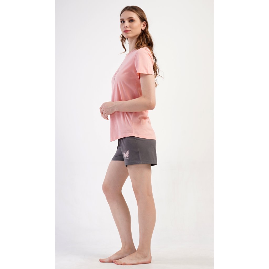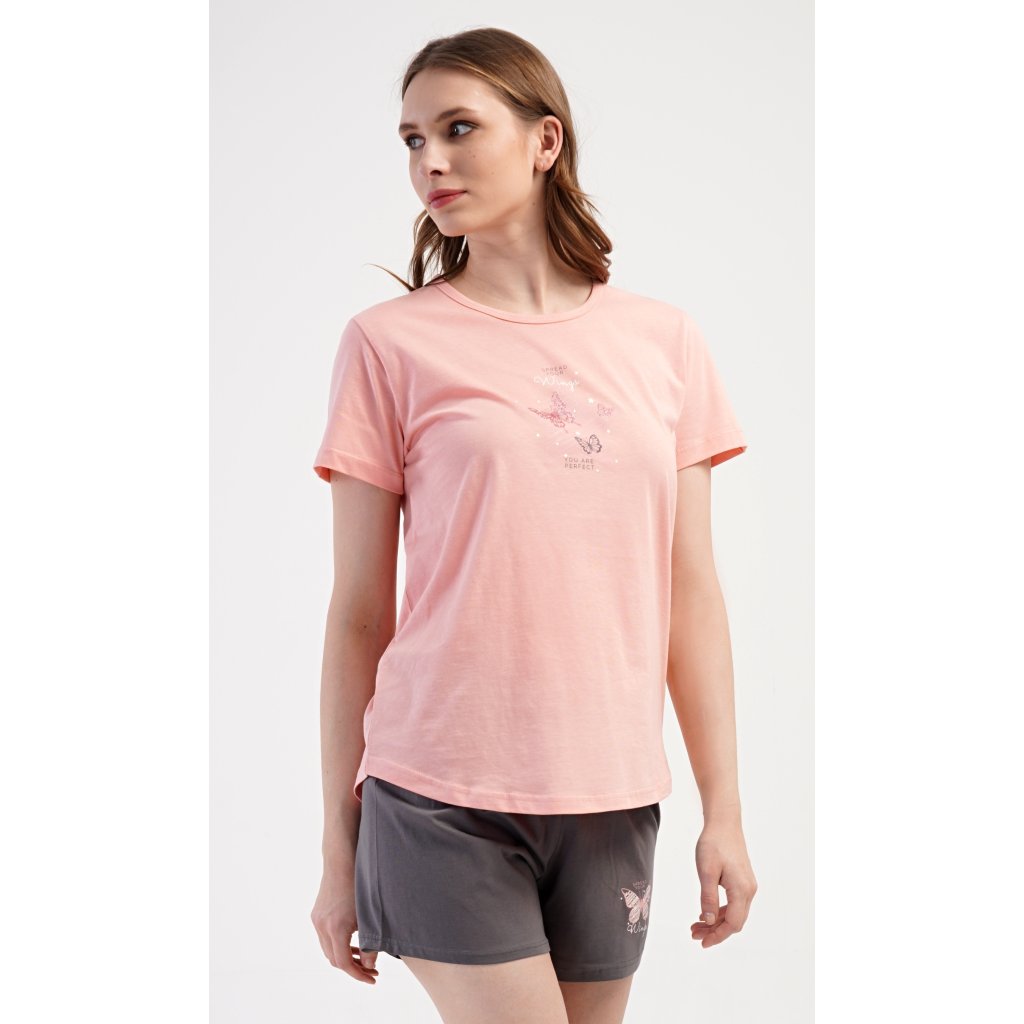 Dámske bavlnené šortkové pyžamo Motýliky. Dámske pyžamo pozostáva z trička s krátkym rukávom a šortiek. Jednofarebné tričko zdobí obrázok motýlikov. Rovnaký motív sa opakuje aj na šortkách, ktoré majú elastický pás a šnúrku a sú bez vreciek. Použitý bavlnený materiál je príjemný a pružný na dotyk.