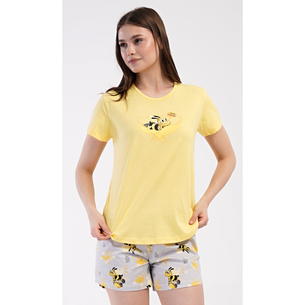 Dámske bavlnené šortkové pyžamo Včielka. Dámske pyžamo pozostáva z trička s krátkym rukávom a šortiek. Jednofarebné tričko zdobí obrázok včely. Rovnaký motív sa opakuje aj na šortkách, ktoré majú elastický pás a šnúrku a sú bez vreciek. Použitý bavlnený materiál je príjemný a pružný na dotyk.