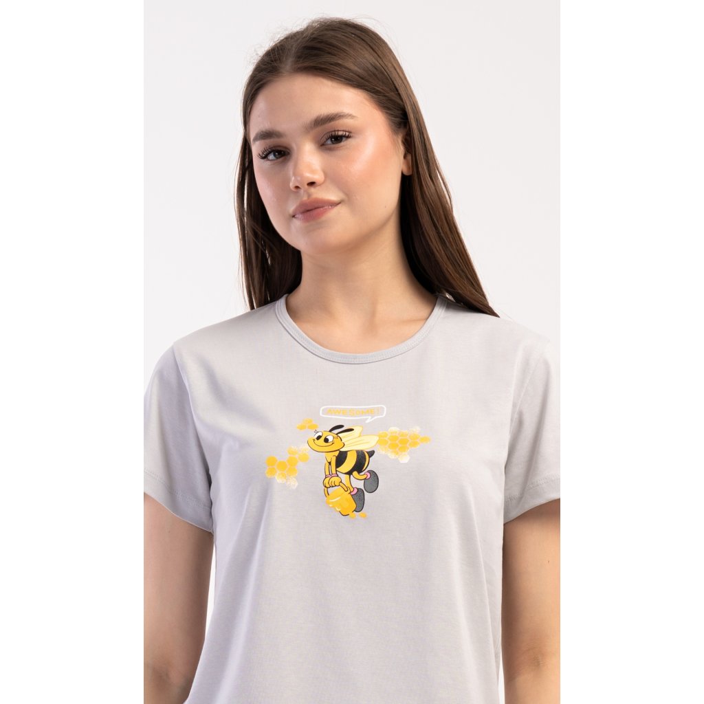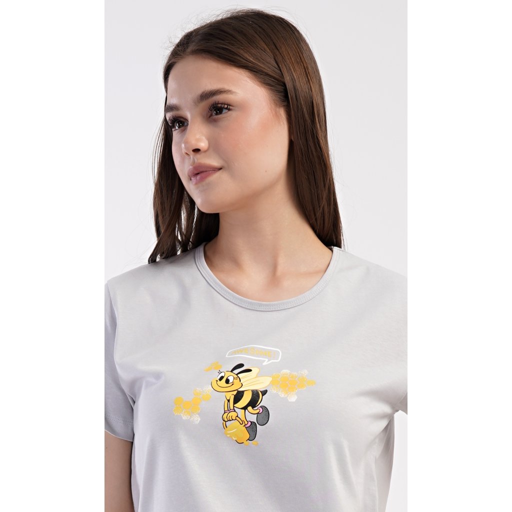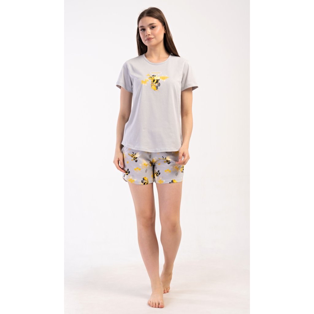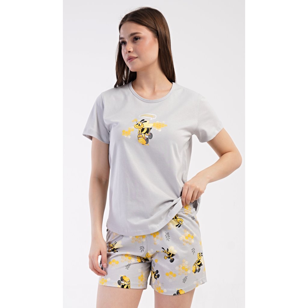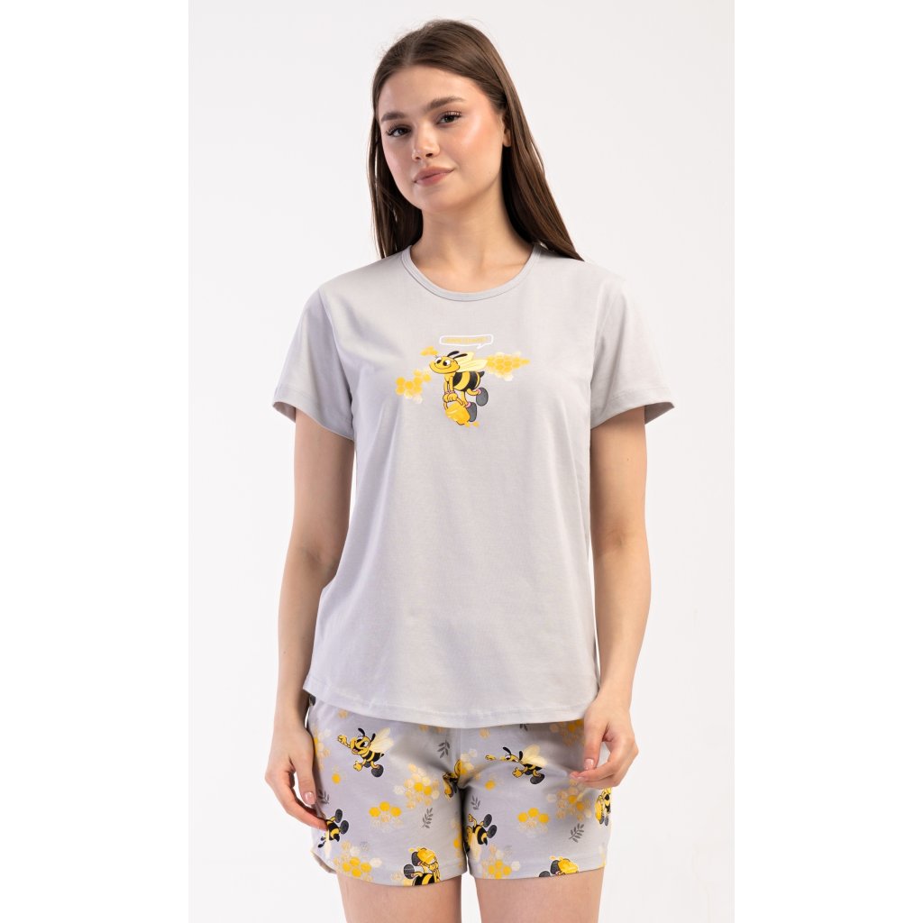 Dámske bavlnené šortkové pyžamo Bees. Dámske pyžamo sa skladá z trička s krátkym rukávom a šortiek. Jednofarebné tričko zdobí obrázok včely. Rovnaký motív sa opakuje na šortkách, ktoré majú elastický pás a šnúrku na stiahnutie a sú bez vreciek. Použitý bavlnený materiál je príjemný a pružný na dotyk.