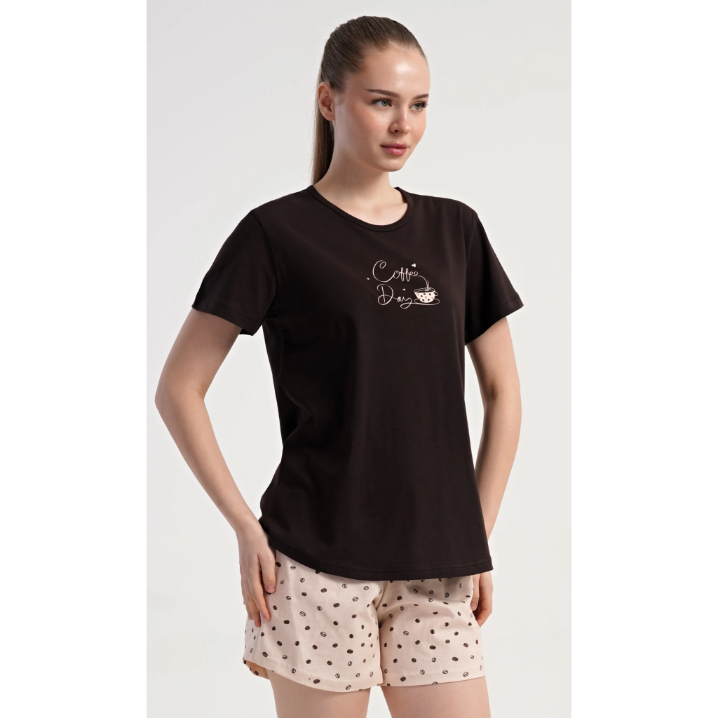 Dámske bavlnené šortkové pyžamo Káva. Dámske pyžamo sa skladá z trička s krátkym rukávom a šortiek. Jednofarebné tričko zdobí obrázok šálky kávy a nápis Coffee day. Motív kávových zŕn sa opakuje na šortkách, ktoré majú elastický pás a šnúrku na stiahnutie a sú bez vreciek. Použitý bavlnený materiál je príjemný a pružný na dotyk.