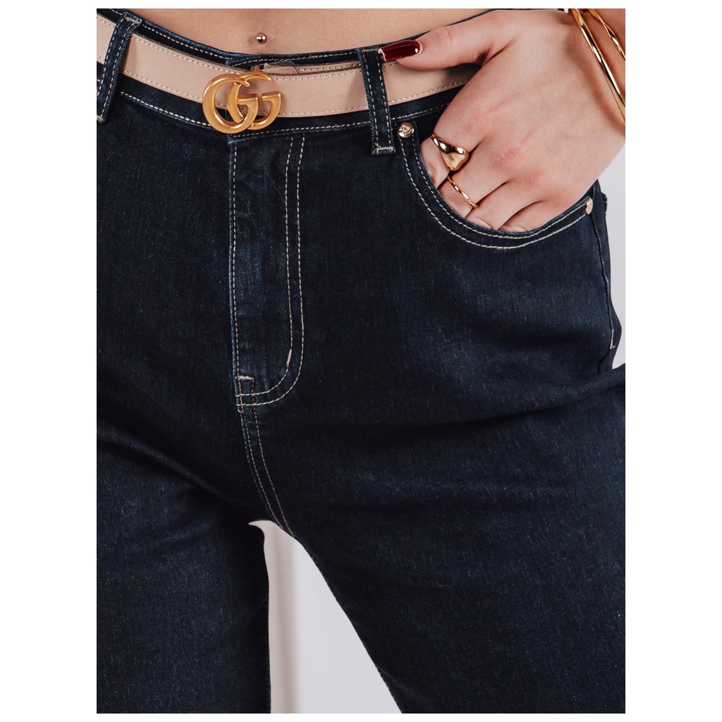 Dámske džínsy. Zapínanie na zips a gombík. Päť vreciek. Vysoký pás. Farba: Tmavomodrá. Zloženie: 64% bavlna, 24% polyester, 10% nylon, 2% spandex.