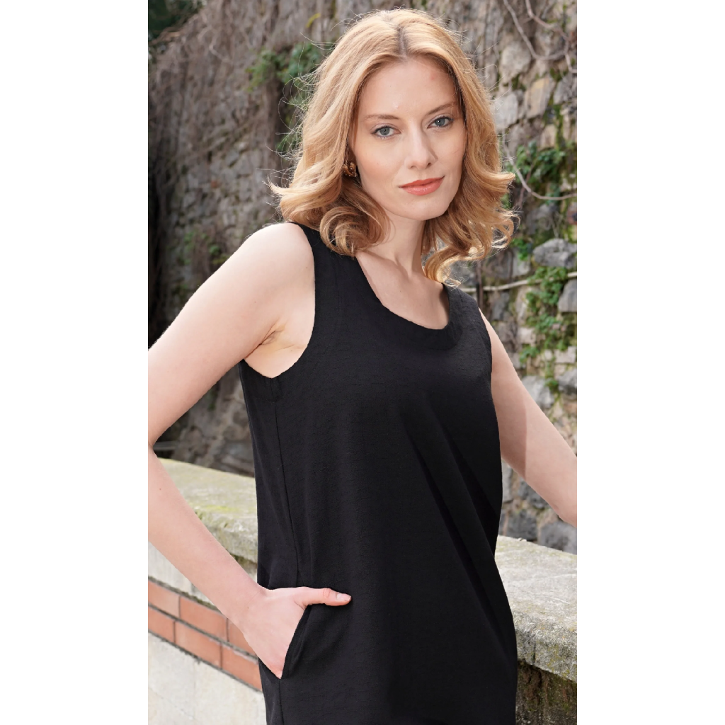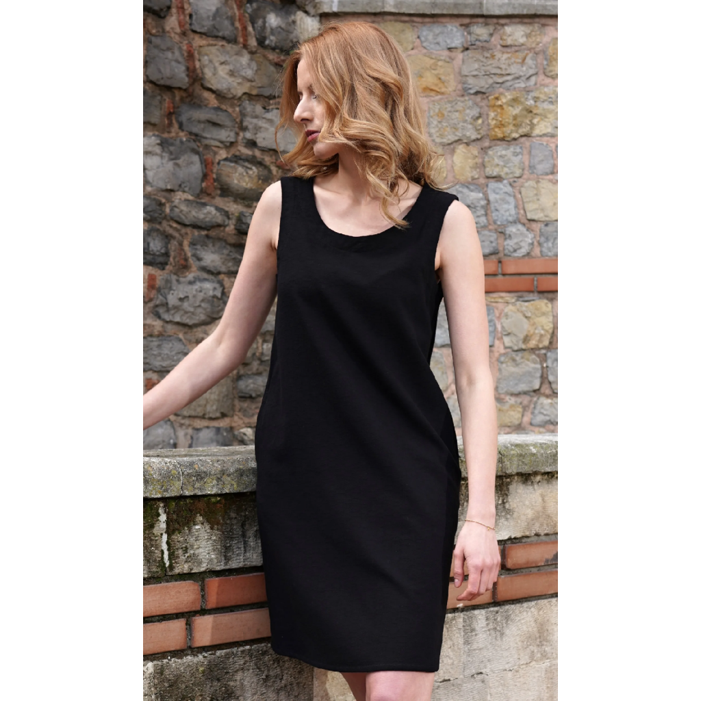 Dámske šaty Barbora. Čierne bavlnené šaty po kolená s praktickými vreckami. Sú elegantné a pohodlné zároveň. Použitý bavlnený materiál je príjemný a pružný na dotyk.