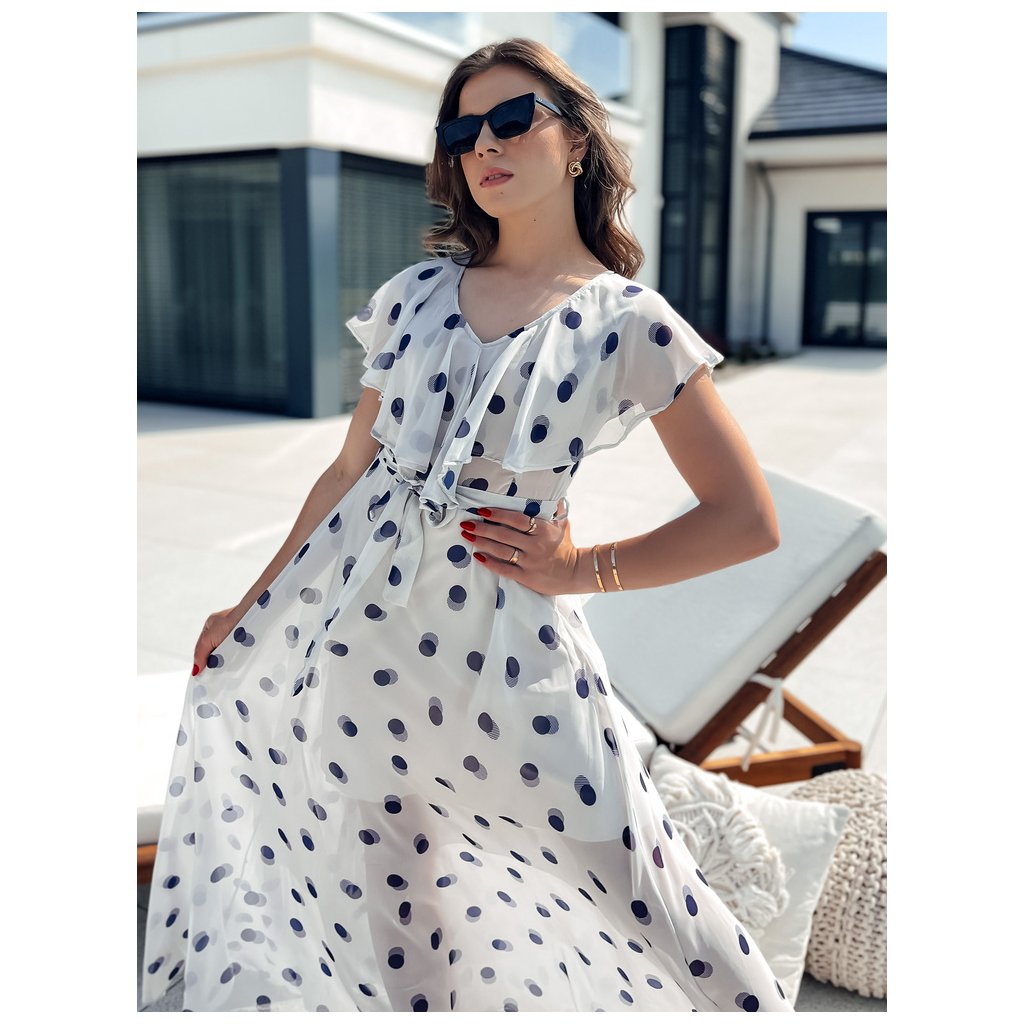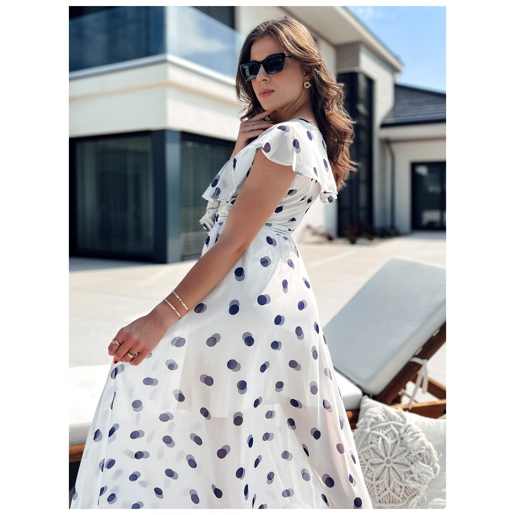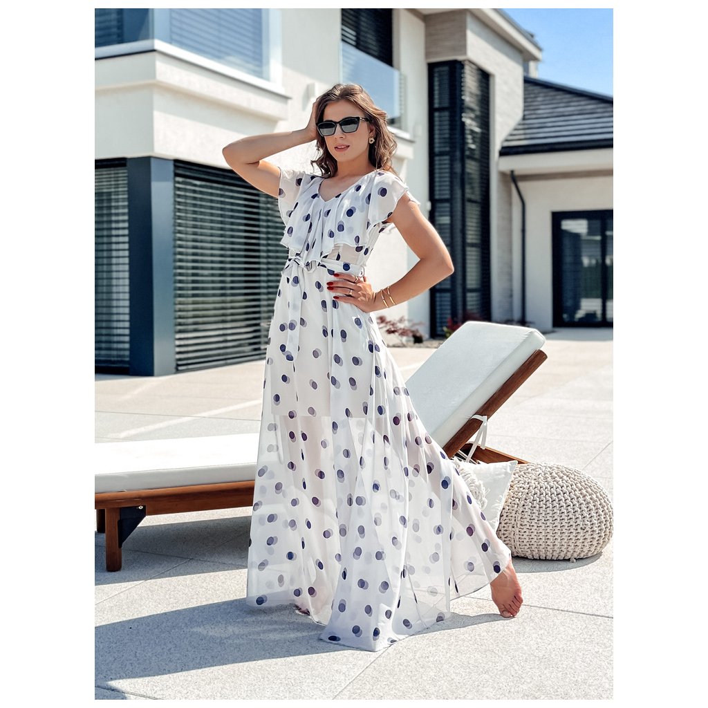 Maxi šaty MARISOL sú perfektnou voľbou pre ženy všetkých vekových kategórií a typov postáv. Krásny, ženský vzor im dodáva jedinečný letný nádych. Šaty sa vyznačujú očarujúcim, jemným volánikovým výstrihom, ktorý decentne zdôrazňuje ženské rysy, zatiaľ čo zaväzovanie v páse krásne zvýrazňuje pás. Ideálne pre rôzne príležitosti – ako v letných dňoch, tak aj na formálnejšie udalosti. Pridajte si šaty MARISOL do svojej zbierky a cíťte sa výnimočne štýlovo!