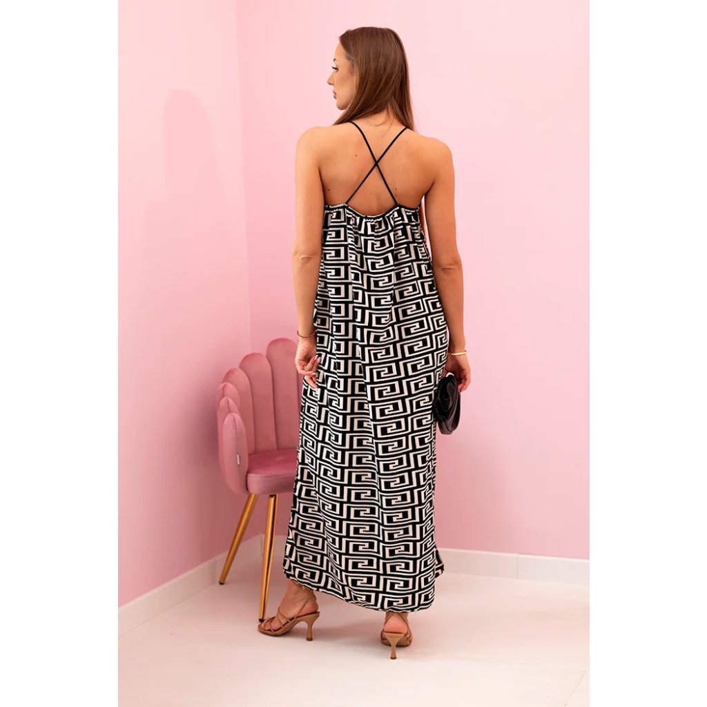 Tieto výnimočné dámske šaty na ramienka sú ideálnou voľbou pre letné dni, výlety do mesta alebo prázdninové prechádzky. Očarujú nielen originálnym geometrickým vzorom v štýle gréckeho labyrintu, ale aj svojou jednoduchosťou a pohodlím pri nosení. Voľný maxi strih zaisťuje voľnosť pohybu a tenké ramienka dodávajú celej štylizácii ľahkosť. Vyrobené z mäkkého a príjemného materiálu s prídavkom elastanu sa šaty perfektne prispôsobia postave. Môžete ich kombinovať ako so sandálmi, tak s teniskami a vytvoriť štýlový, každodenný outfit. Veľkosť je univerzálna a hodí sa pre dámy veľkosti S, M alebo L.