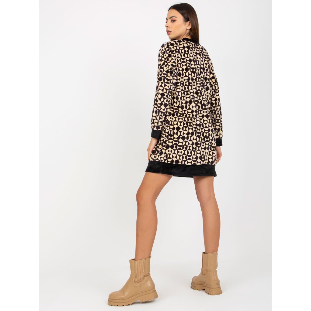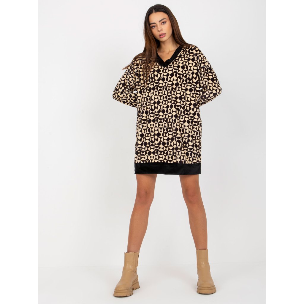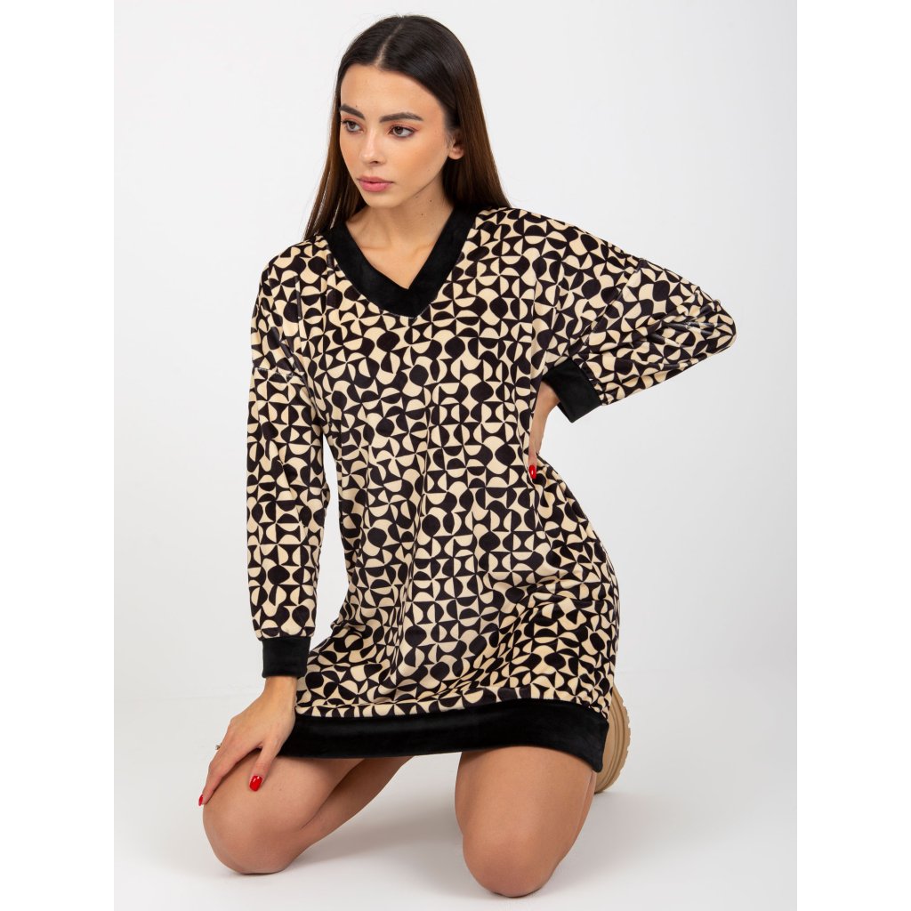 Ťavavo-čierne voľné zamatové šaty s potlačou.