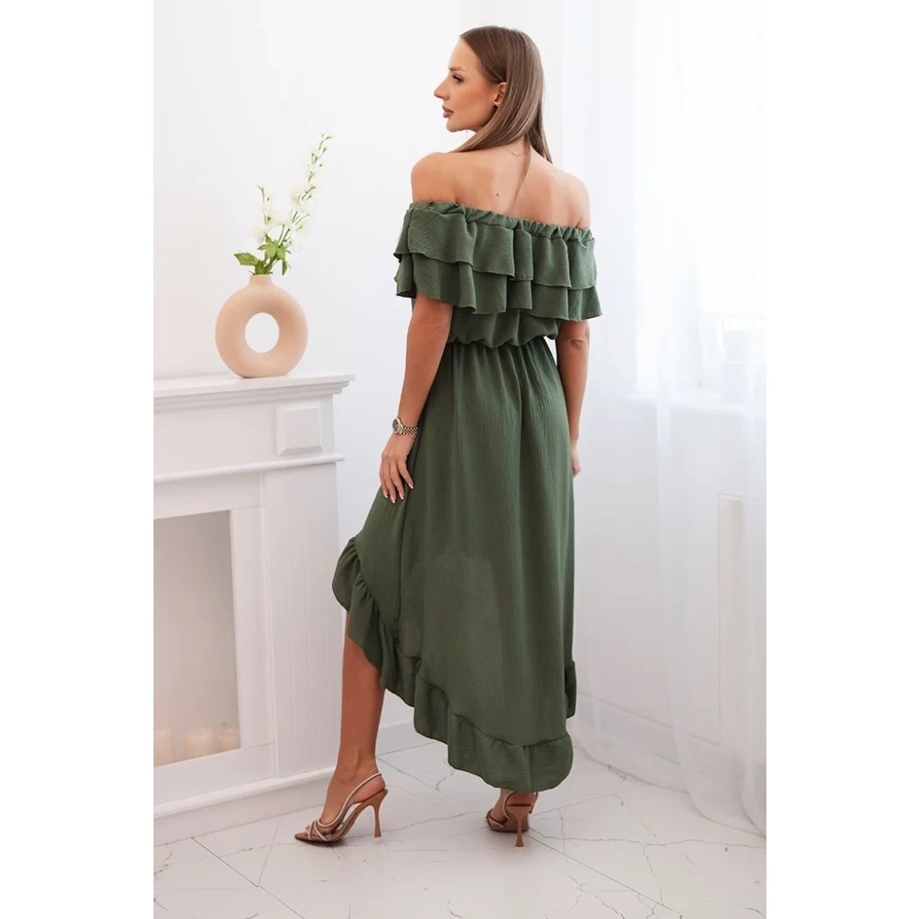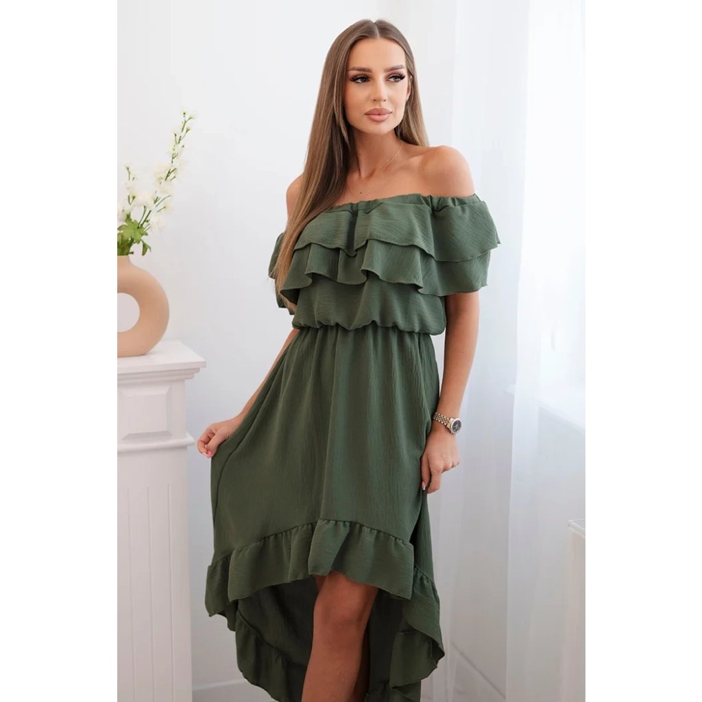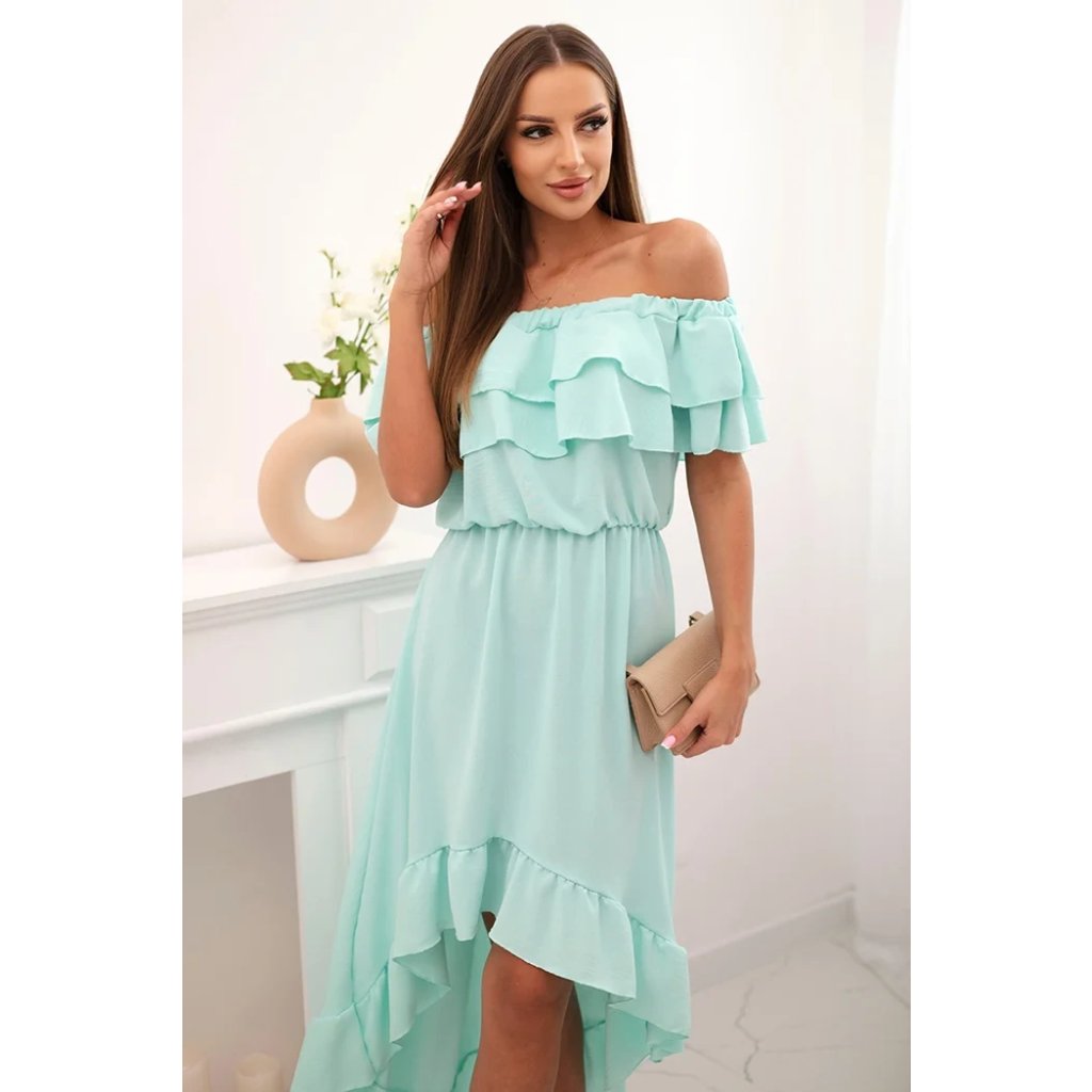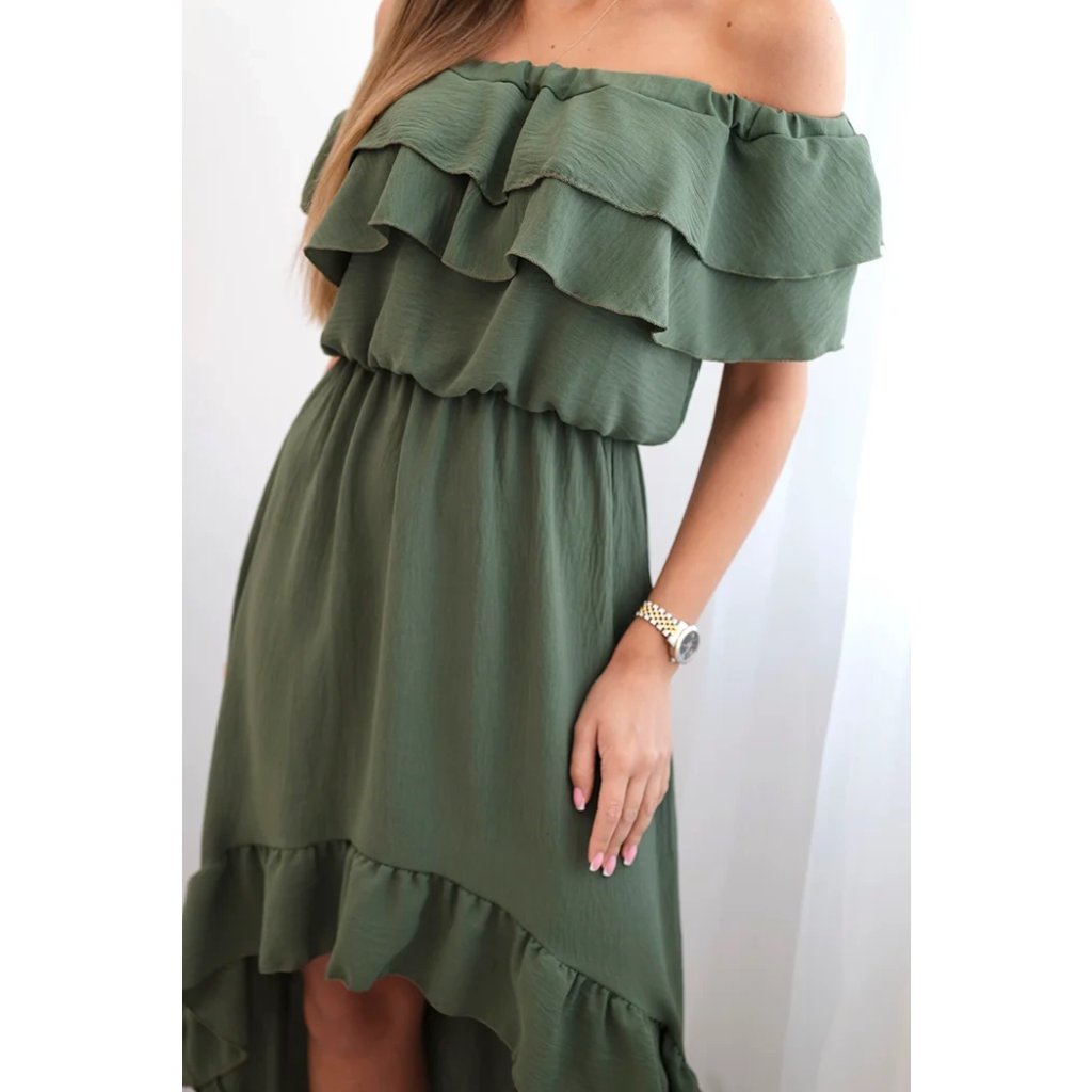 Tieto dámske šaty typu "španielka" sú stelesnením ženského štýlu a letnej elegancie. Model s efektnými volánmi okolo výstrihu dodáva romantický charakter a jemne odhaľuje ramená, čím vytvára mimoriadne ženskú siluetu. Asymetrický spodný lem dodáva šatám ľahkosť a každý pohyb v nich vyzerá nádherne. Elastický pás sa dokonale prispôsobí postave, zdôrazňuje ženské krivky a zaisťuje pohodlie po celý deň. Ideálna voľba na dovolenku, letné večierky, rande alebo vonkajšie slávnosti. Vďaka kombinácii elegancie a pohodlia sa tieto šaty stanú vaším obľúbeným letným kúskom. Veľkosť je univerzálna a bude vhodná pre ženy s veľkosťou S, M alebo L.