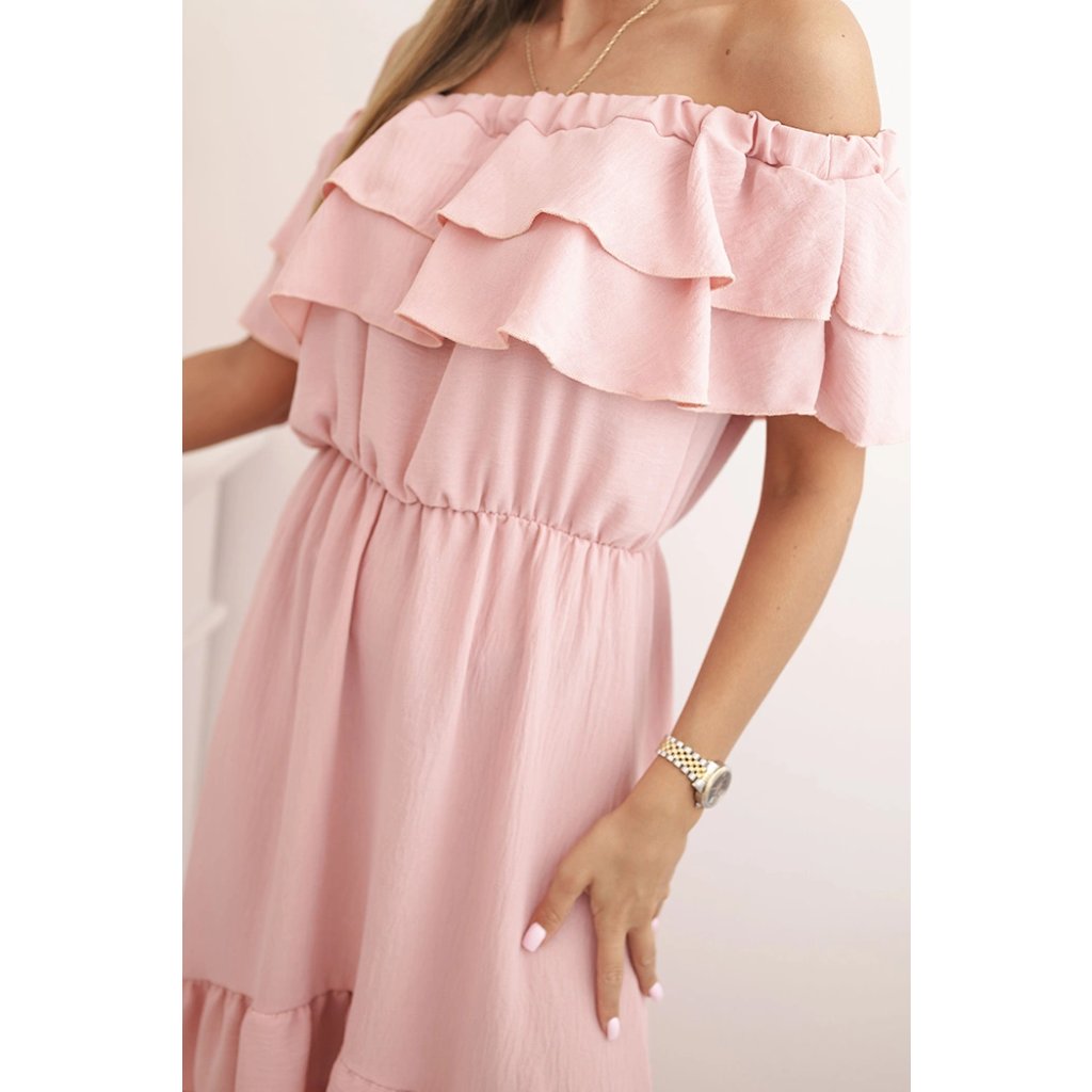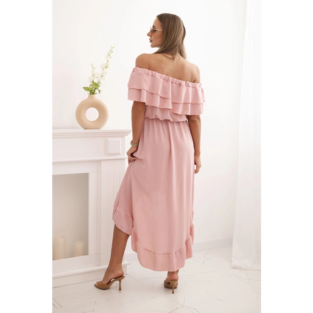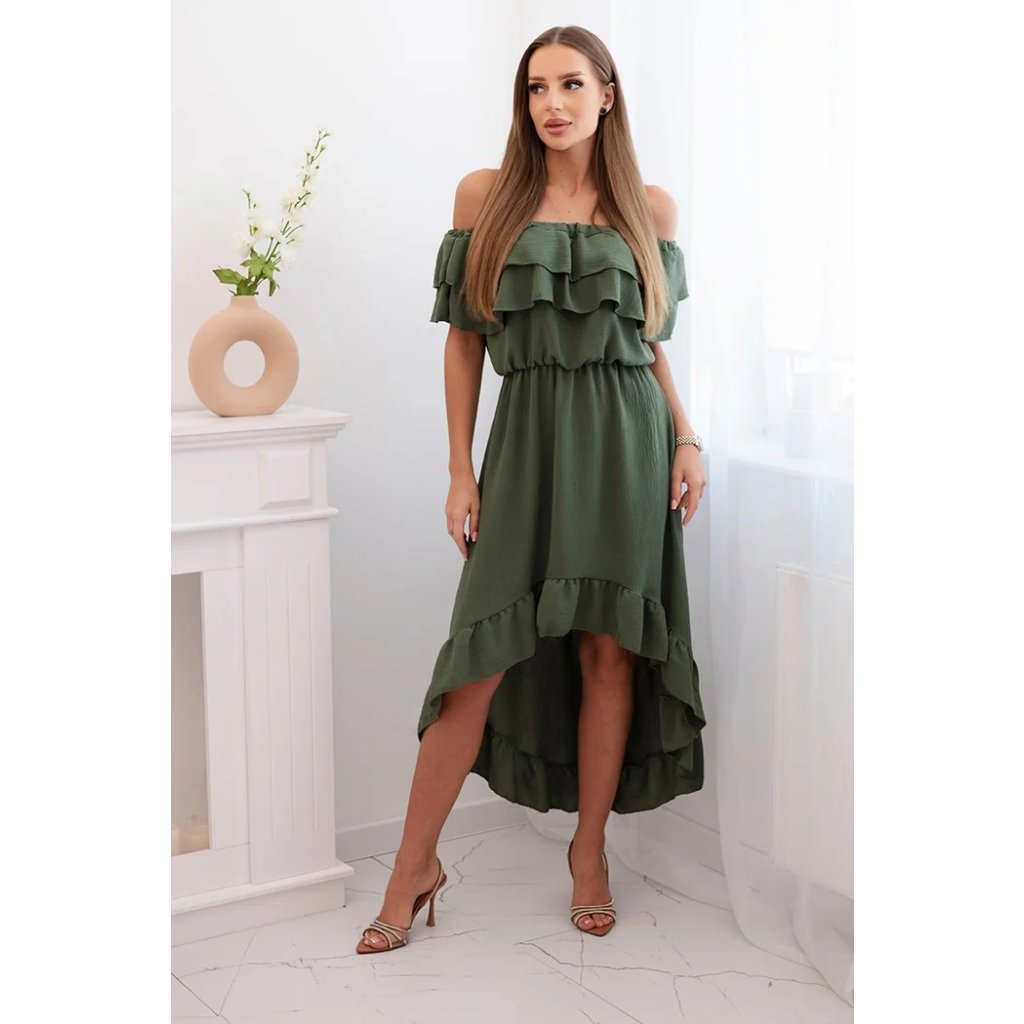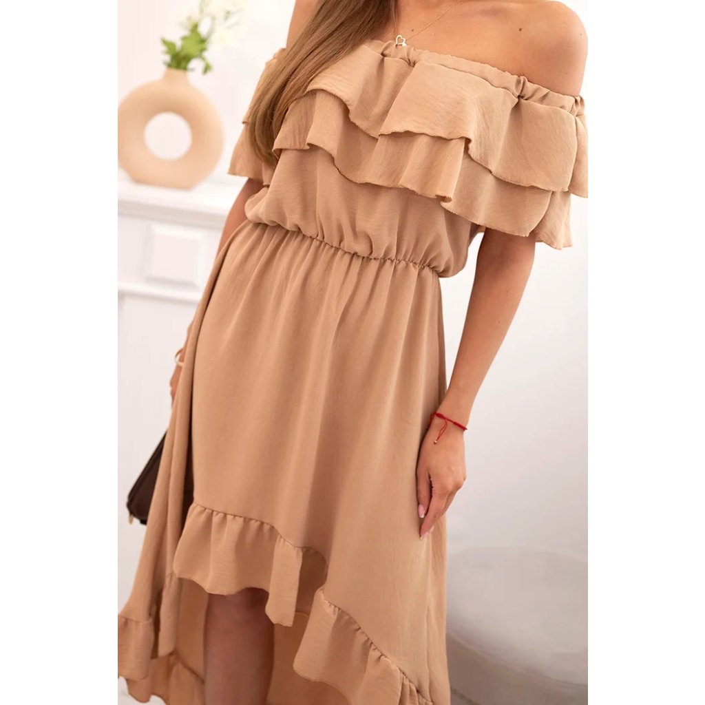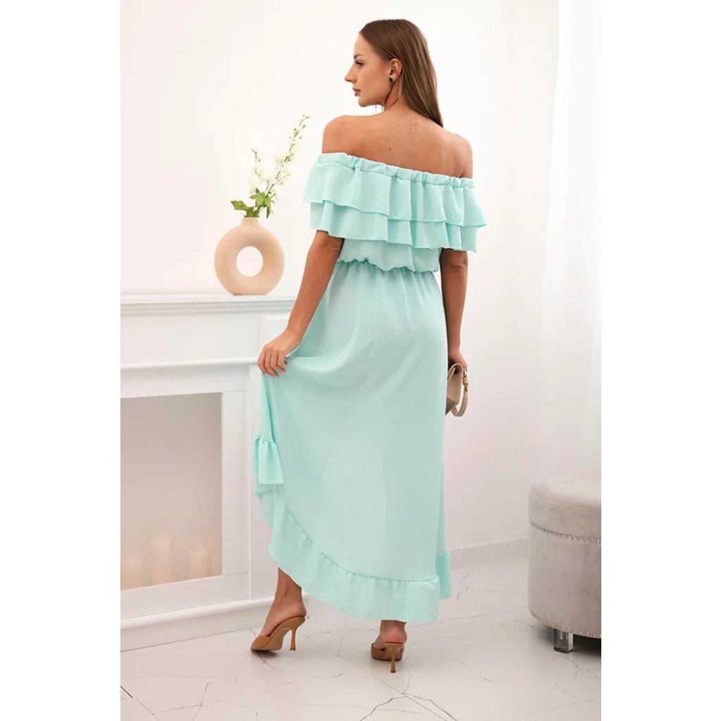 Tieto dámske šaty typu "španielka" sú stelesnením ženského štýlu a letnej elegancie. Model s efektnými volánmi okolo výstrihu dodáva romantický charakter a jemne odhaľuje ramená, čím vytvára mimoriadne ženskú siluetu. Asymetrický spodný lem dodáva šatám ľahkosť a každý pohyb v nich vyzerá nádherne. Elastický pás sa dokonale prispôsobí postave, zdôrazňuje ženské krivky a zaisťuje pohodlie po celý deň. Ideálna voľba na dovolenku, letné večierky, rande alebo vonkajšie slávnosti. Vďaka kombinácii elegancie a pohodlia sa tieto šaty stanú vaším obľúbeným letným kúskom. Veľkosť je univerzálna a bude vhodná pre ženy s veľkosťou S, M alebo L.