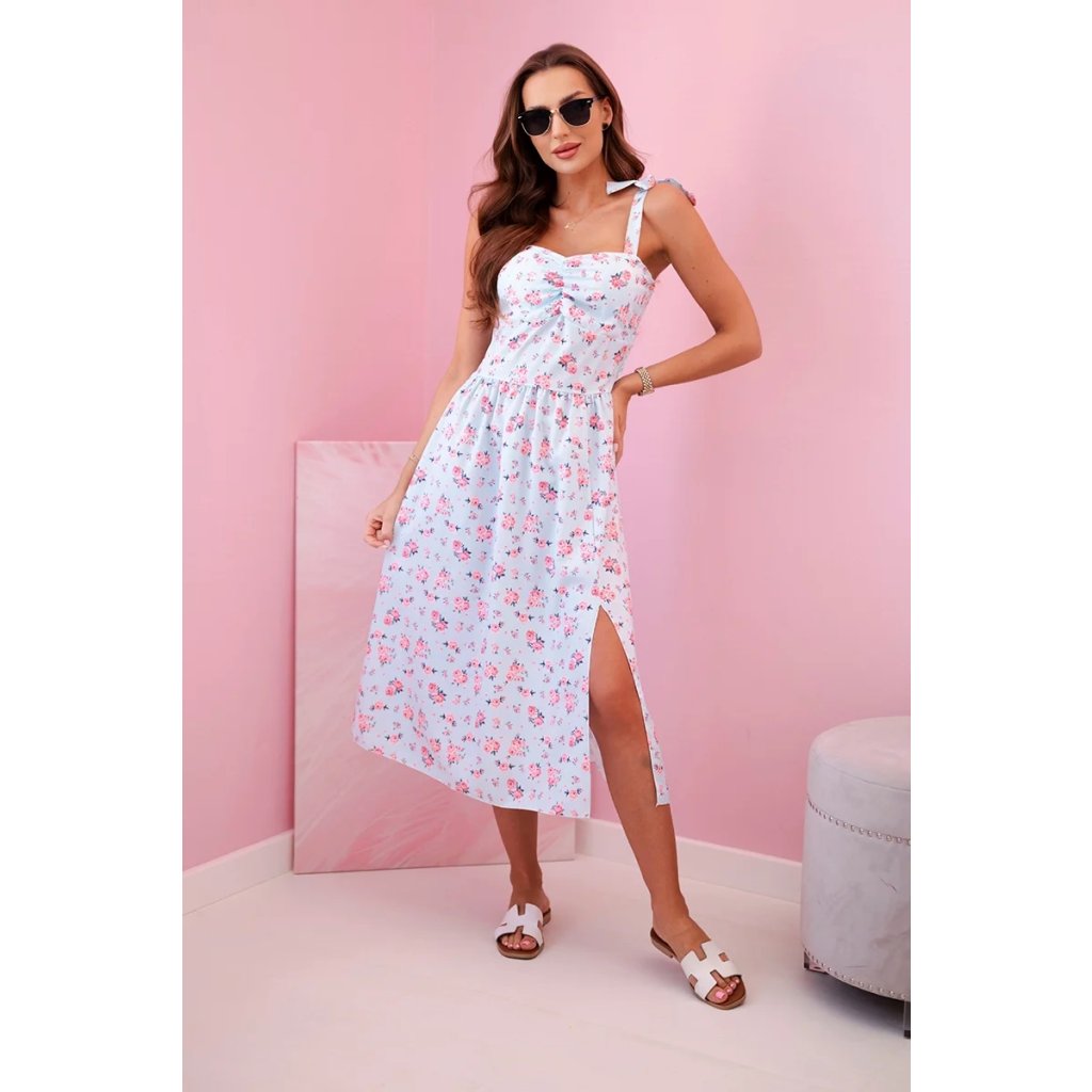 Romantické dámske šaty s módnym vzorom sú ideálnou voľbou na teplé dni. Model so širokými ramienkami a roztomilým zaväzovaním na ramenách zdôrazňuje ženský pôvab a dodáva štýlu ľahkosť. Priliehavý top s riasením krásne zvýrazňuje poprsie, zatiaľ čo mierne rozšírená sukňa zaručuje voľnosť pohybu. Vďaka ľahkému a vzdušnému materiálu sú šaty veľmi pohodlné na nosenie a ich midi dĺžka je ideálna na bežné nosenie aj na špeciálne príležitosti.