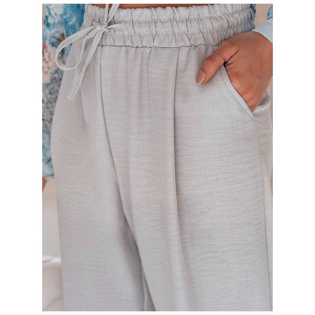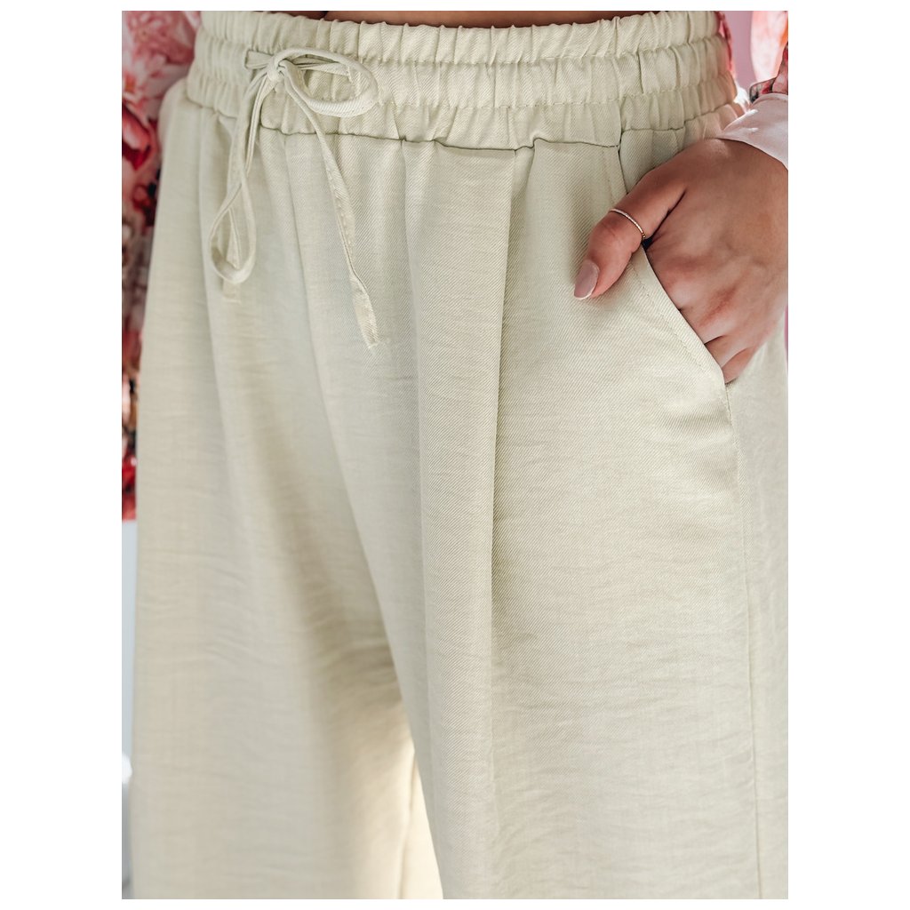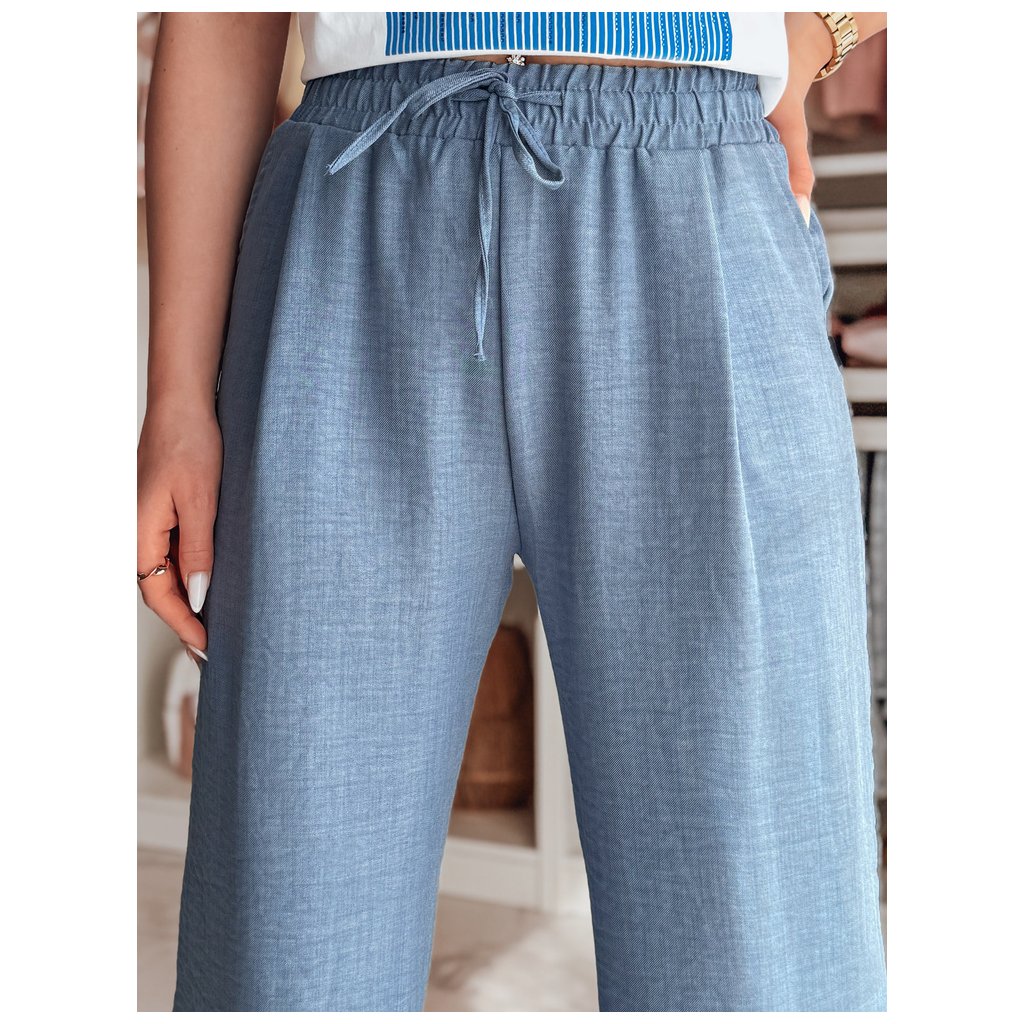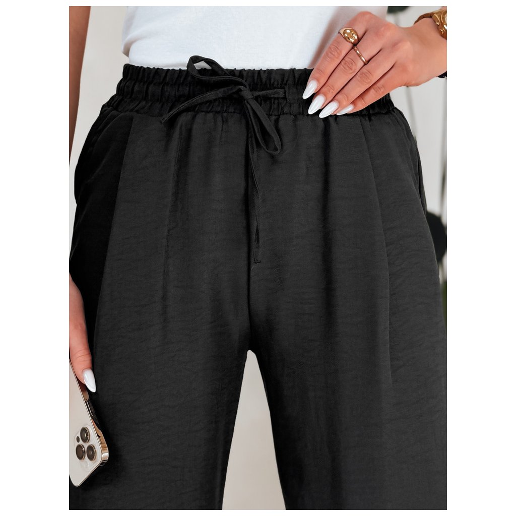 Tieto dámske nohavice so širokými nohavicami, elastickým pásom a sťahovacou šnúrkou sú perfektnou voľbou na každodenné nosenie v teplejších dňoch. Minimalistický dizajn s ozdobnými vreckami umocňuje ležérny vzhľad. Materiál je priedušný a ľahký, ideálny pre mestské aj letné outfity.