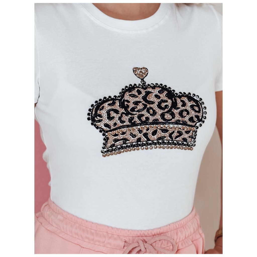 Toto priliehavé dámske tričko s krátkym rukávom je skvelou voľbou pre teplejšie dni. Jeho pútavá potlač koruny, zdobená trblietavými kamienkami, vytvára ozdobný akcent. Mäkký materiál zaisťuje pohodlie a okrúhly výstrih dodáva klasický nádych. Toto tričko sa perfektne hodí k jarným a letným outfitom.