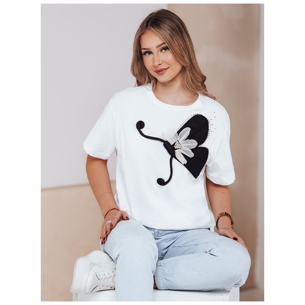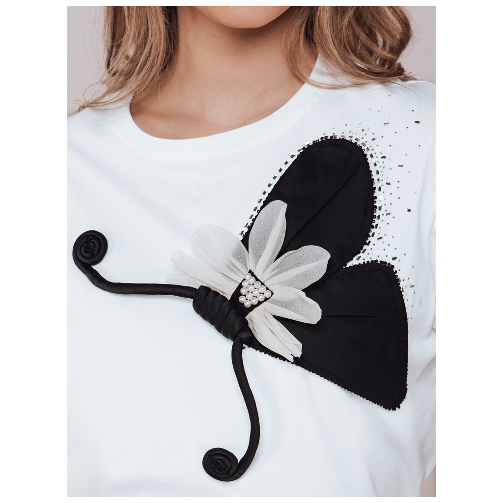 Toto jedinečné tričko s výraznou kvetinovou výzdobou v tvare motýľa kombinuje pohodlie s jedinečným štýlom. Jemné detaily, ako sú aplikácie a decentné perly, mu dodávajú eleganciu a odlišujú ho od ostatných štýlov. Ideálne na každodenné nosenie aj neformálne stretnutia.