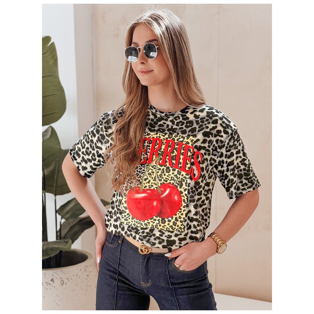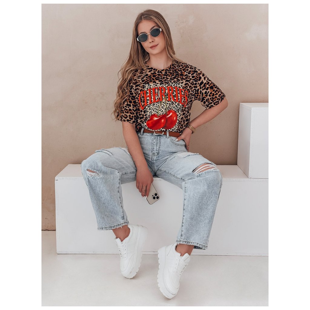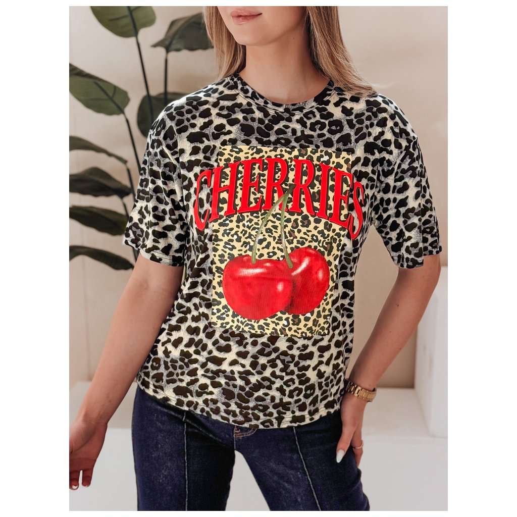 Toto oversized dámske tričko sa vyznačuje výraznou leopardou potlačou, ktorá pokrýva celú látku. Výrazná potlač červených čerešní a veľký nápis „CHERRIES“ na prednej strane pútavo upútajú pozornosť a dodávajú vzhľadu energiu. Vďaka okrúhlemu výstrihu a krátkym rukávom je tričko ideálne na jarné a letné dni. Perfektne sa hodí k džínsom alebo kraťasom pre módny, ležérny a elegantný vzhľad.