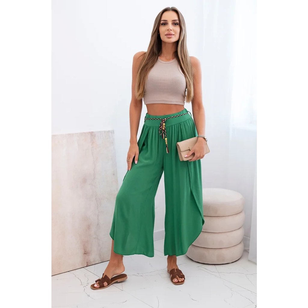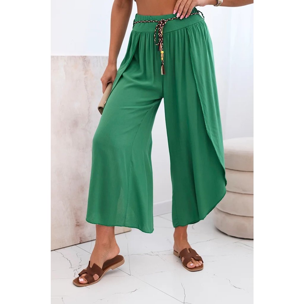 Tieto dámske nohavice so širokými nohavicami sú ideálnou voľbou na teplejšie dni. Vyrobené zo 100 % vzdušnej viskózy zaručujú pohodlie a ľahkosť po celý deň. Voľný, splývavý strih nielen dodáva štýl, ale taktiež zaisťuje voľnosť pohybu. Dekoratívna šnúrka v páse dodáva pôvab a umožňuje lepšie prispôsobenie pásu. Skvelý model na dovolenku, prechádzky po meste alebo letné stretnutia – môžete ich kombinovať s topom, košeľou alebo ľahkou blúzkou. Talianska výroba je zárukou kvality a štýlového vzhľadu. Veľkosť je univerzálna a hodí sa pre dámy veľkosti S, M alebo L.