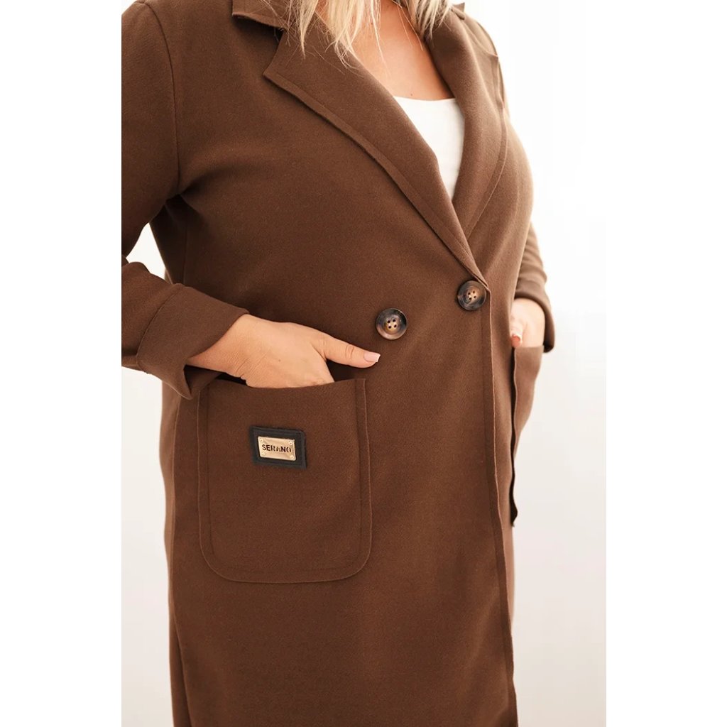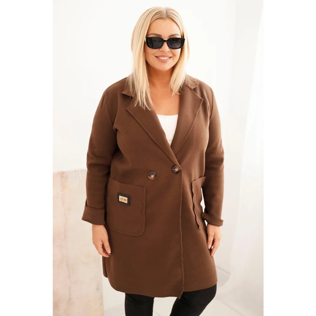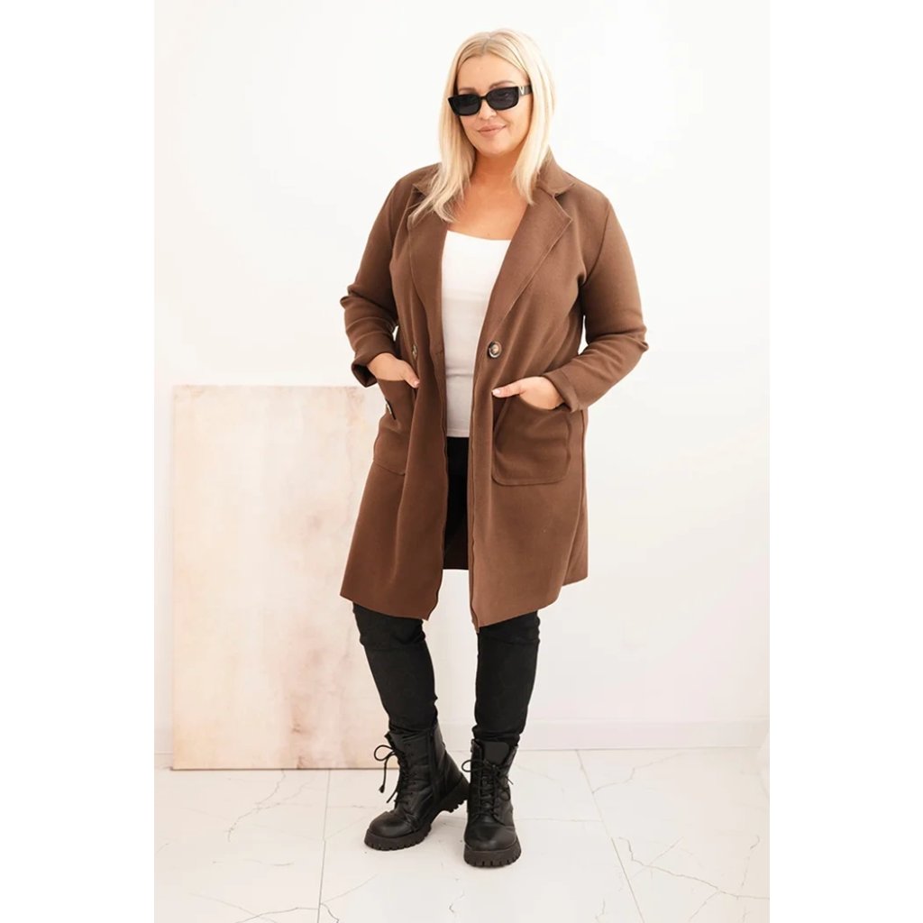 Tento klasický dámsky kabát Plus Size je nadčasový návrh pre ženy, ktoré si cenia jednoduchosť, eleganciu a pohodlie. Model je vyrobený z príjemného materiálu s jednolitou štruktúrou, má dvojradové zapínanie na gombíky, široký golier a praktické, veľké vrecká s ozdobnou nášivkou. Voľný, jednoduchý strih skvele sedí na postave a zaisťuje voľnosť pohybu.