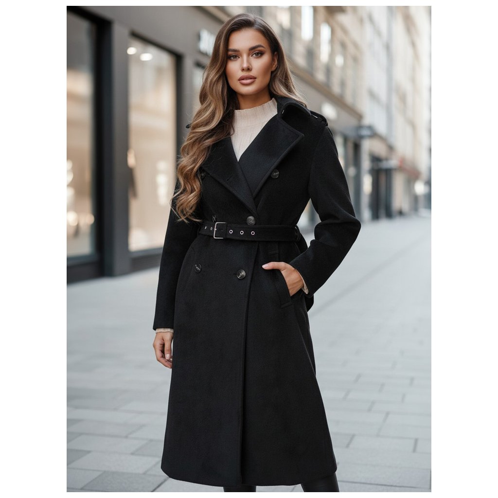 Kabát má gombíky a pás pre lepšie padnutie.