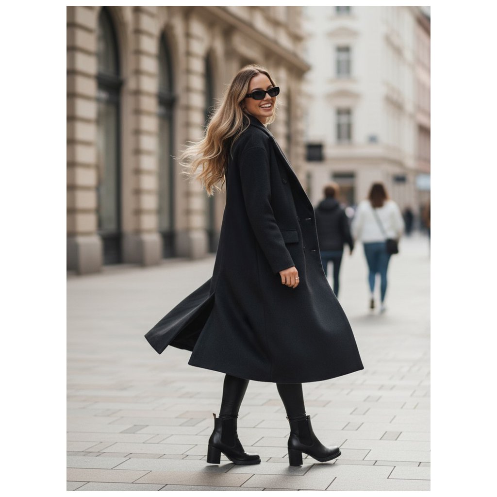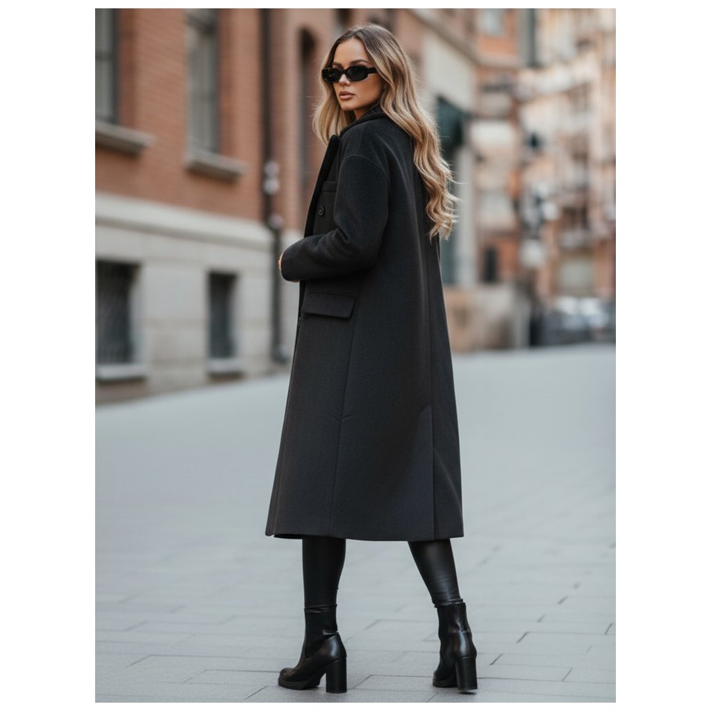 Tento klasický čierny dámsky kabát s mierne oversized strihom je nadčasovou voľbou pre ženy, ktoré oceňujú eleganciu a jednoduchosť. Dvojradové zapínanie na gombíky dodáva kabátu elegantný nádych, zatiaľ čo široké klopy zdôrazňujú štýlový charakter. Rovný strih a lem po kolená zaisťujú lichotivý strih a praktické klopy na vreckách zvyšujú funkčnosť.